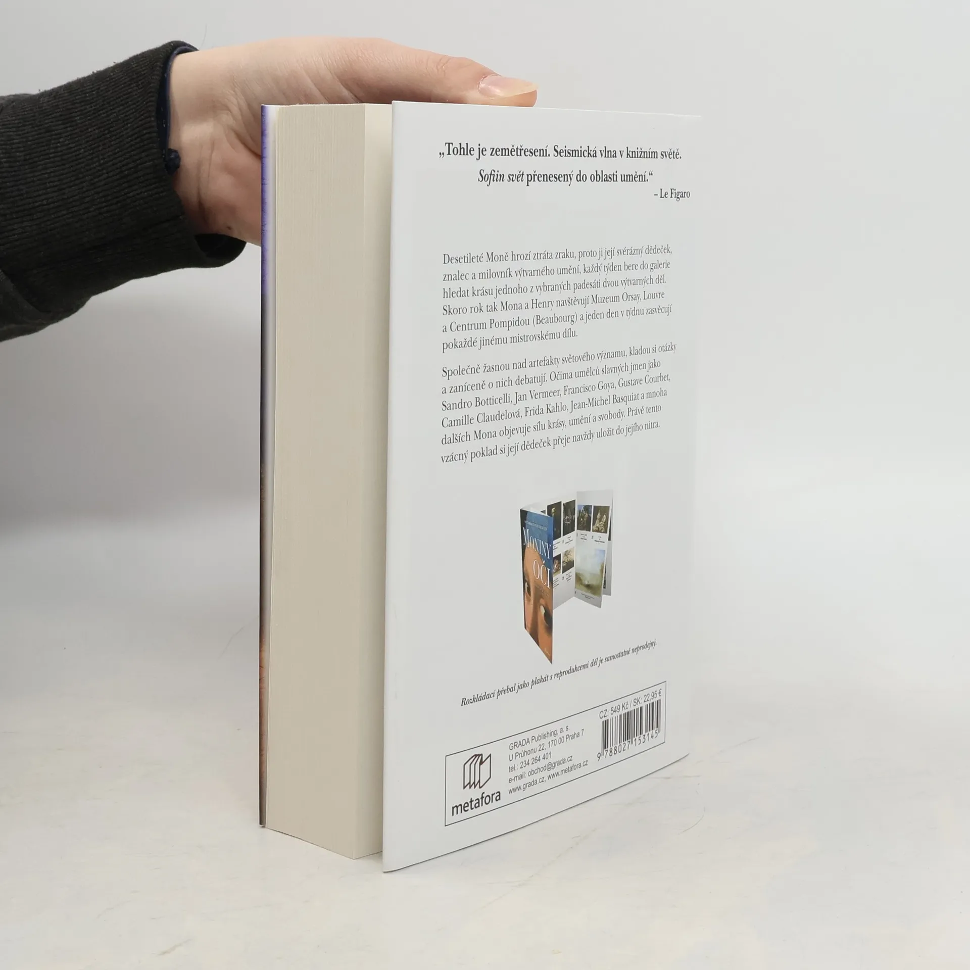Padesát dva týdnů, tolik času má desetiletá Mona, aby objevila všechnu krásu světa. Každou středu ji její dědeček Henry po škole do bere galerie, aby se tu společně ponořili do jednoho uměleckého díla. Skoro rok tak Mona a Henry navštěvují Muzeum Orsay, Louvre a Centrum Pompidou (Beaubourg) a jeden den v týdnu zasvěcují pokaždé jinému z padesáti dvou vybraných mistrovských děl. Každé z nich si pozorně prohlédnou, diskutují o něm, nechávají se jím překvapit, dojmout, zpochybnit i nadchnout. To vše s vědomím, že Moně do roka hrozí definitivní ztráta zraku. Při zkoumání díla a myšlenek Botticelliho, Vermeera, Goyi, Courbeta, Kahlo nebo Basquiata a mnoha dalších objeví Mona nejen sílu ukrytou v umění, ale také význam šlechetnosti, pochybností, melancholie, ztráty i revolty. Moniny oči jsou román o hloubce lidského života, fascinující průvodce po významných uměleckých dílech světového umění a dojemný příběh o vztahu malé dívky a jejího dědečka. Kniha francouzského historika umění Thomase Schlessera se stala mezinárodním fenoménem, jež vychází ve 37 zemích. Součástí českého vydání je rozkládací přebal o velikosti plakátu s barevnými reprodukcemi všech děl, které Mona a Henry při svých vycházkách probírají.