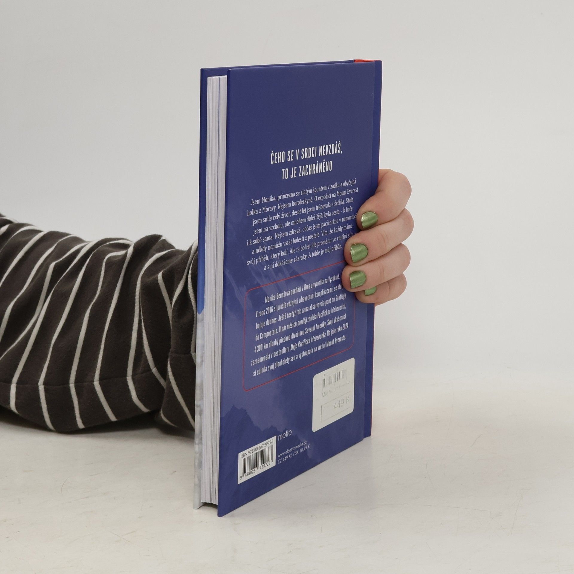 Čeho se v srdci nevzdáš, to je zachráněno Jsem Monika, princezna se zlatým špuntem v zadku a obyčejná holka z Moravy. Nejsem horolezkyně. O expedici na Mount Everest jsem snila celý život, deset let jsem trénovala a šetřila. Stála jsem na vrcholu, ale mnohem důležitější byla cesta – k hoře i k sobě sama. Nejsem zdravá, občas jsem pacientkou v nemocnici a někdy nemůžu vstát bolestí z postele. Vím, že každý máme svůj příběh, který bolí. Ale ta bolest jde proměnit ve vnitřní sílu – a s ní dokážeme zázraky. A tohle je můj příběh.