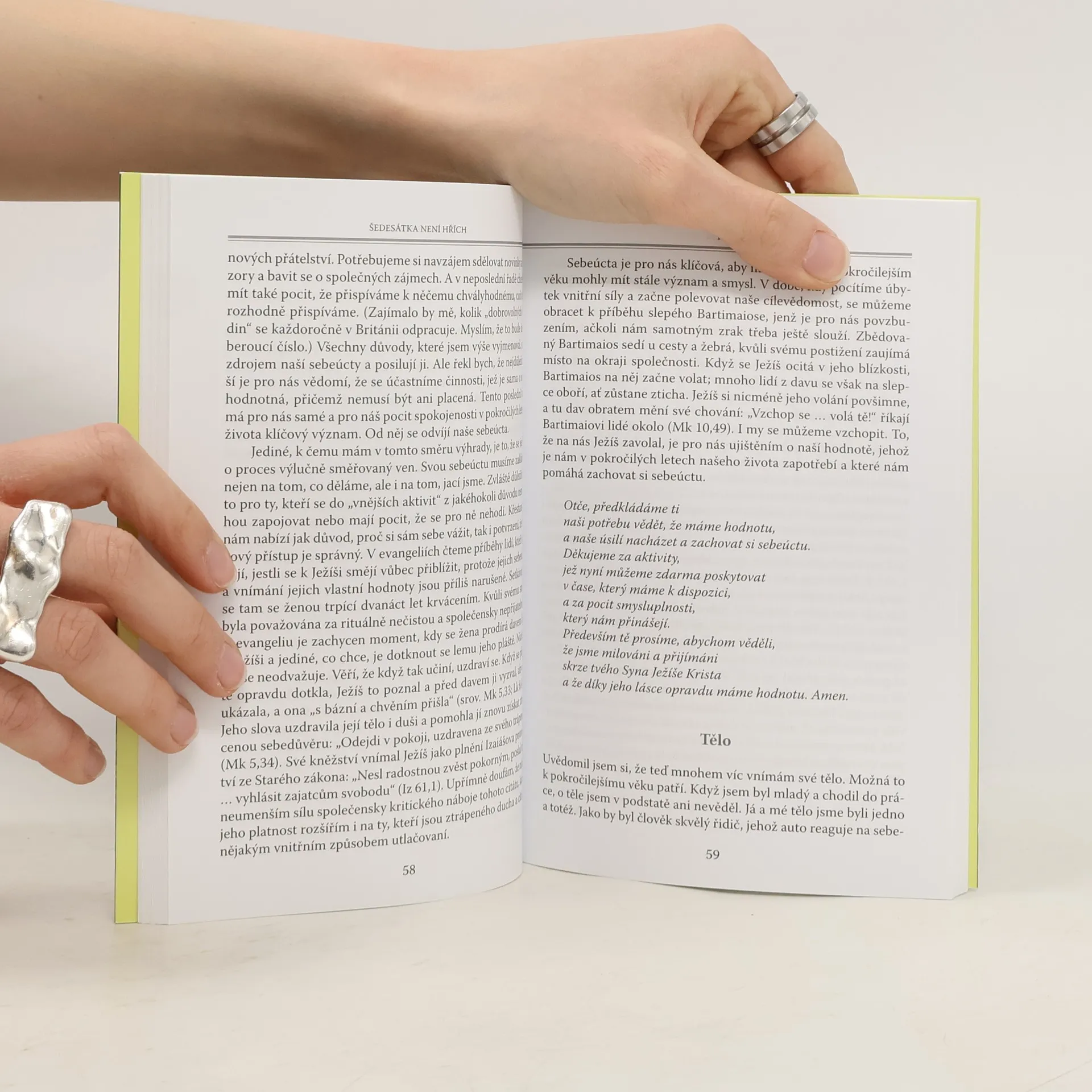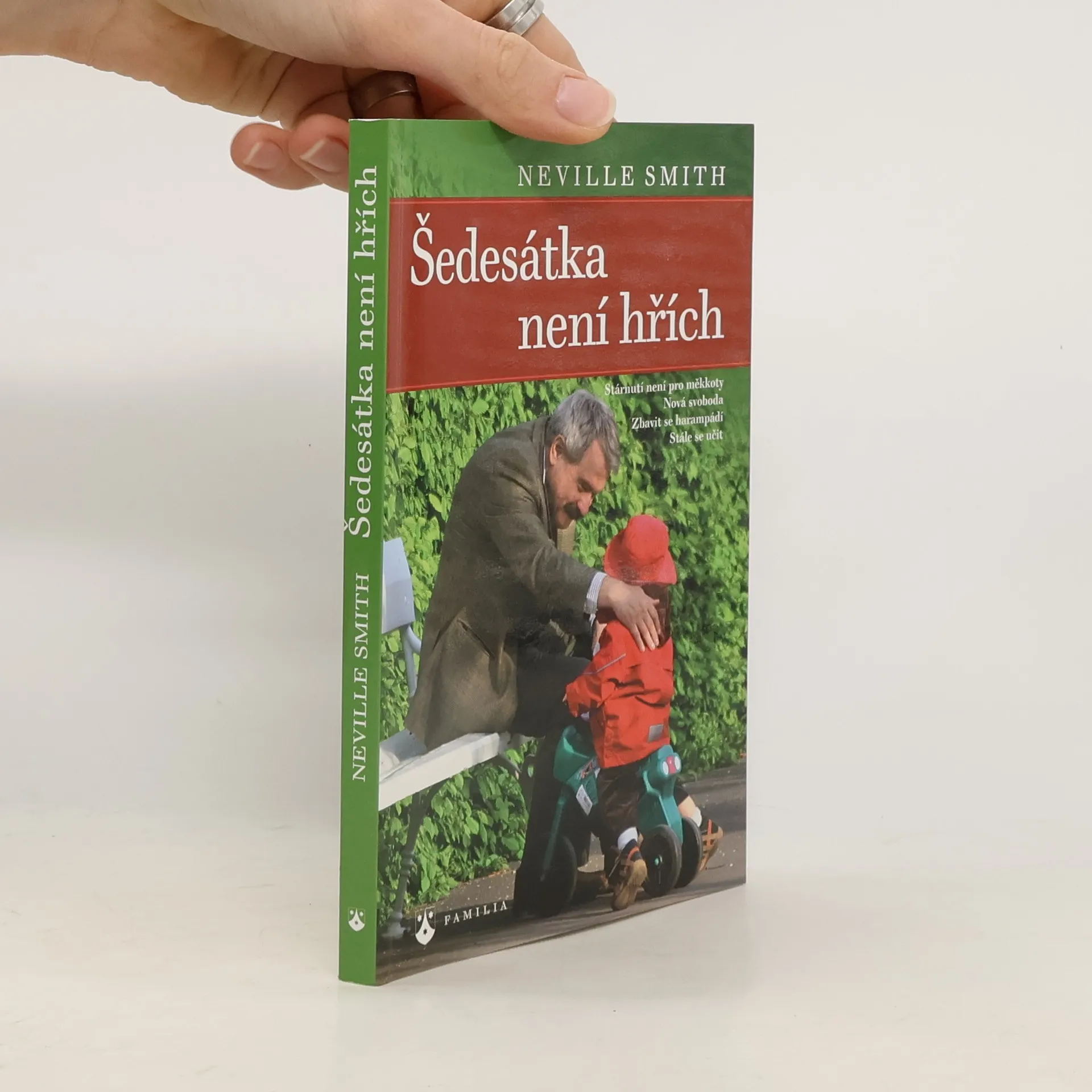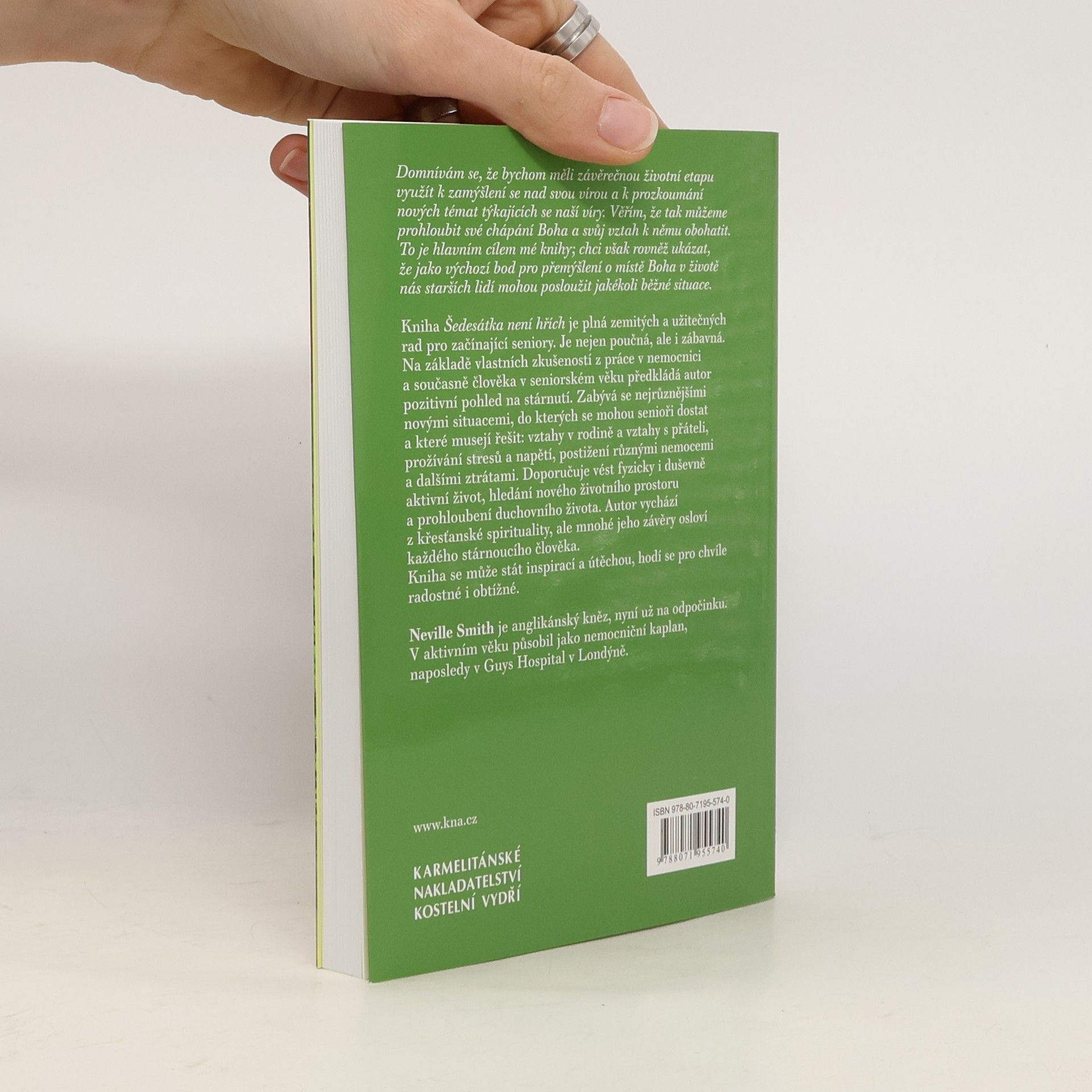 Stárnutí není pro měkkoty. Nová svoboda. Zbavit se harampádí. Stále se učit. Domnívám se, že bychom měli závěrečnou životní etapu využít k zamýšlení se nad svou vírou a k prozkoumání nových témat týkajících se naší víry. Věřím, že tak můžeme prohloubit své chápání Boha a svůj vztah k němu obohatit. To je hlavním cílem mé knihy, chci však rovněž ukázat, že jako výchozí bod pro přemýšlení o místě Boha v životě nás starších lidí mohou posloužit jakékoli běžné situace. Kniha Šedesátka není hřích je plná zemitých a užitečných rad pro začínající seniory. Kniha je nejen poučná, ale i zábavná. Na základě vlastních zkušeností z práce v nemocnici a současně člověka v seniorském věku předkládá autor pozitivní pohled na stárnutí. Zabývá se nejrůznějšími novými situacemi, do kterých se mohou senioři dostat a které musí řešit. Popisuje situace týkající se vztahů v rodině a vztahů s přáteli, prožívání stresů a napětí, postižení různými nemocemi a dalšími ztrátami. Doporučuje vést fyzicky i duševně aktivní život, hledání nového životního prostoru a prohloubení duchovního života. Autor vychází z křesťanské spirituality, ale mnohé jeho závěry osloví každého stárnoucího člověka. Kniha se může stát inspirací a útěchou, hodí se pro chvíle radostné i obtížné. Neville Smith je anglikánský kněz, nyní už na odpočinku. V aktivním věku působil jako nemocniční kaplan, naposledy v Guys Hospital v Londýně.