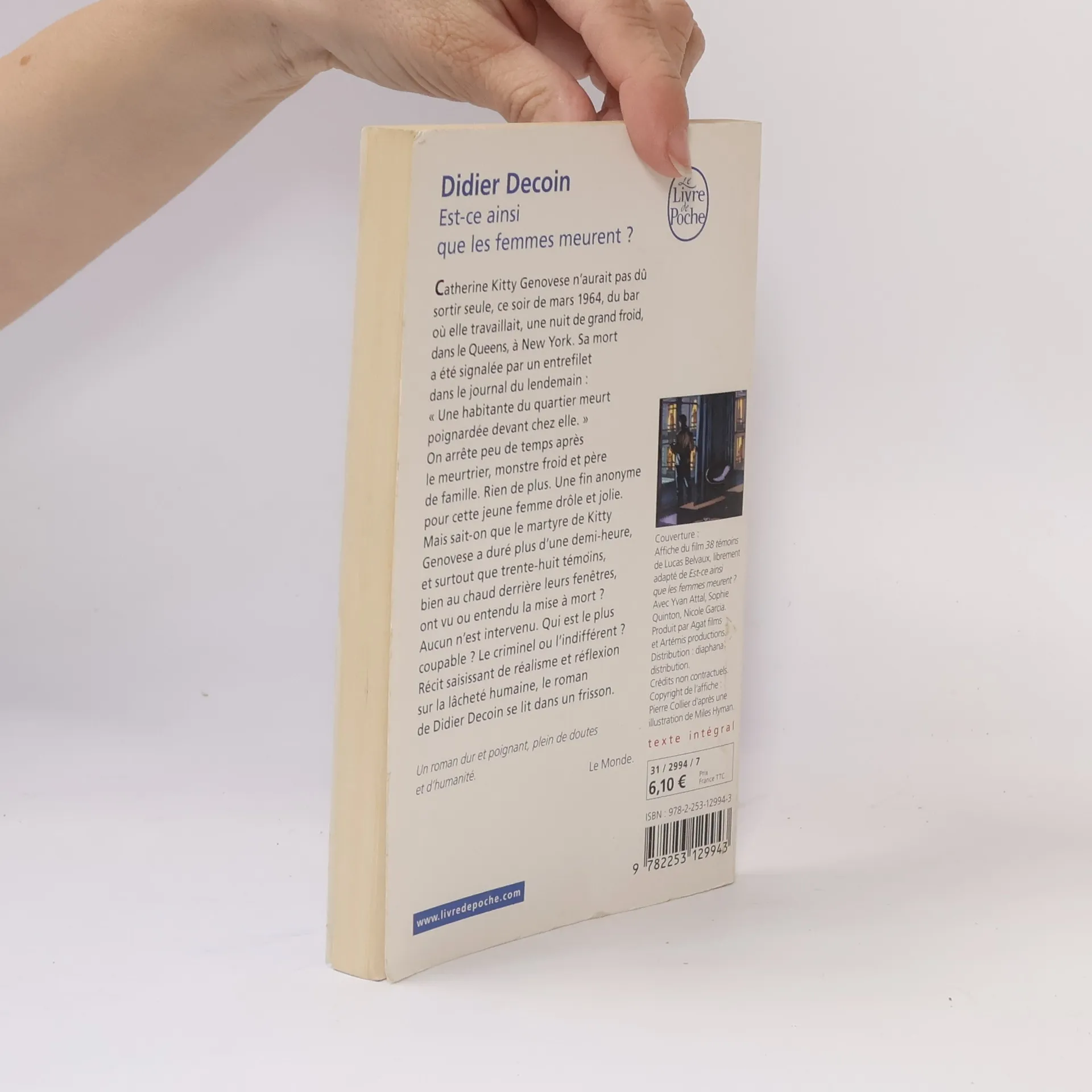 Catherine Kitty Genovese n’aurait pas dû sortir seule ce soir de mars 1964 du bar où elle travaillait, une nuit de grand froid, dans le Queens, à New York. Sa mort a été signalée par un entrefilet dans le journal du lendemain : « Une habitante du quartier meurt poignardée devant chez elle. » On arrête peu de temps après le meurtrier, monstre froid et père de famille. Rien de plus. Une fin anonyme pour cette jeune femme drôle et jolie. Mais sait-on que le martyre de Kitty Genovese a duré plus d’une demi-heure, et surtout que trente-huit témoins, bien au chaud derrière leurs fenêtres, ont vu ou entendu la mise à mort ? Aucun n’est intervenu. Qui est le plus coupable ? Le criminel ou l’indifférent ? Récit saisissant de réalisme et réflexion sur la lâcheté humaine, le roman de Didier Decoin se lit dans un frisson.Un roman dur et poignant, plein de doutes et d’humanité.