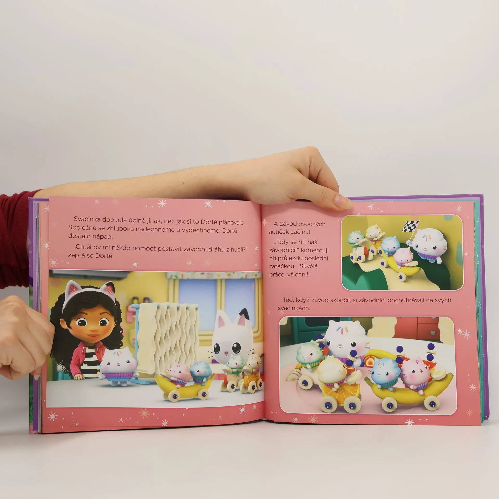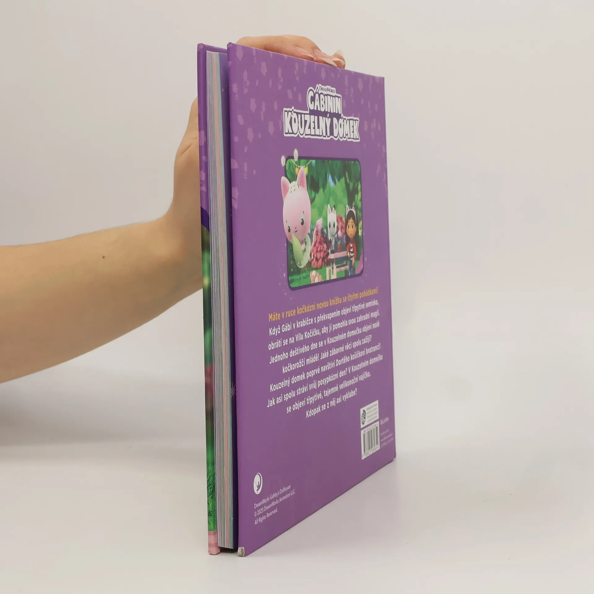 Máte v ruce kočkózní novou knížku se čtyřmi pohádkami! Když Gábi v krabičce s překvapením objeví třpytivé semínko, obrátí se na Vílu Kočičku, aby jí pomohla svou zahradní magií. Jednoho deštivého dne se v Kouzelném domku objeví malé kočkorožčí mládě! Jaké zábavné věci spolu kamarádi zažijí? Kouzelný domek poprvé navštíví Dortěho košíčkoví bratranci! Jak asi spolu stráví svůj posypkózní den? V Kouzelném domku se objeví blyštivé, tajemné velikonoční vajíčko. Kdopak se z něj asi vyklube?