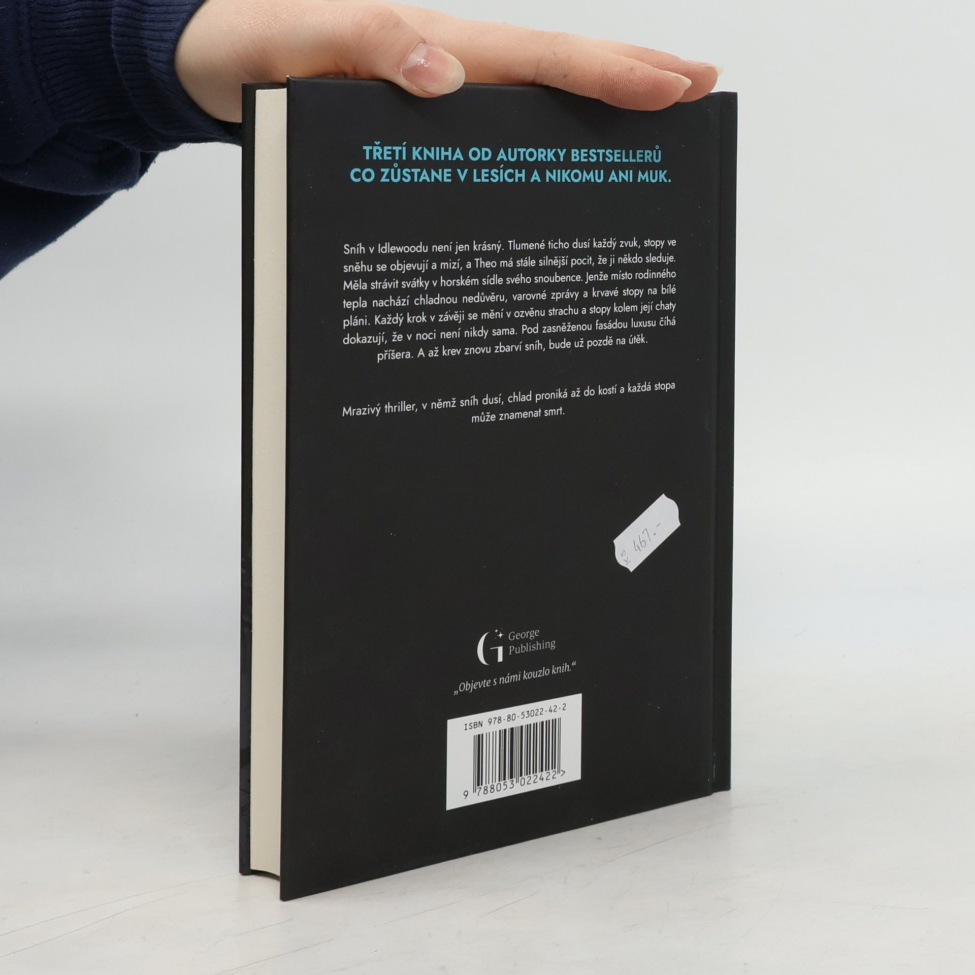 Sníh v Idlewoodu není jen krásný. Tlumené ticho dusí každý zvuk, stopy ve sněhu se objevují a mizí, a Theo má stále silnější pocit, že ji někdo sleduje. Měla strávit svátky v horském sídle svého snoubence. Jenže místo rodinného tepla nachází chladnou nedůvěru, varovné zprávy a krvavé stopy na bílé pláni. Každý krok v závěji se mění v ozvěnu strachu a stopy kolem její chaty dokazují, že v noci není nikdy sama. Pod zasněženou fasádou luxusu číhá příšera. A až krev znovu zbarví sníh, bude už pozdě na útěk. Mrazivý thriller, v němž sníh dusí, chlad proniká až do kostí a každá stopa může znamenat smrt.