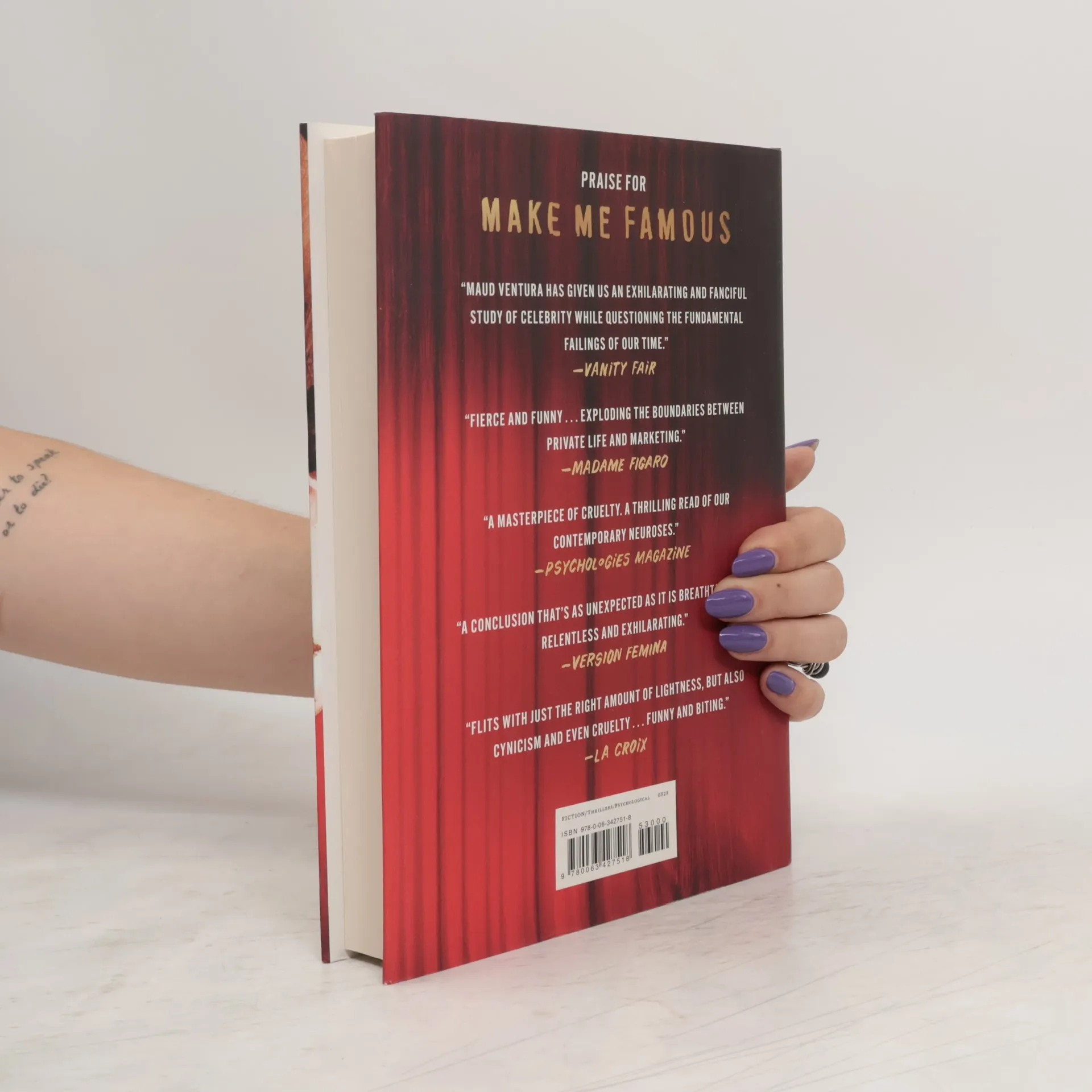 Daisy Jones and the Six meets Patricia Highsmith in this addictive, intense novel about the brutal and ferocious road to glory, from the award-winning author of My Husband. Ever since she was a child, Cléo, the French-American daughter of two academics, has had only one obsession: becoming a famous singer. Over the years, to everyone's surprise but her own, she overcomes every obstacle and becomes a global superstar with millions of dollars, countless awards, and several Los Angeles villas to her name. But as any celebrity will tell you, getting to the top is one thing; staying there is another. Now thirty-three years old, Cléo is taking her first real vacation in years, on a remote island with no one else in sight. With the never-ending spin cycle of her life finally on pause and no paparazzi peeking out from behind the coconut palms, she can work on her fourth album in peace. Except that with so much time to think, she can't help but ruminate on her past--including how, just six months earlier, things started to go very, very wrong . . . Taking place between New York, Paris, Los Angeles, and the South Pacific, Make Me Famous is a brilliant sophomore novel from Maud Ventura that dives intoxicatingly deep into the machinations of one woman's complicated mind, and her relentless pursuit of fame.
