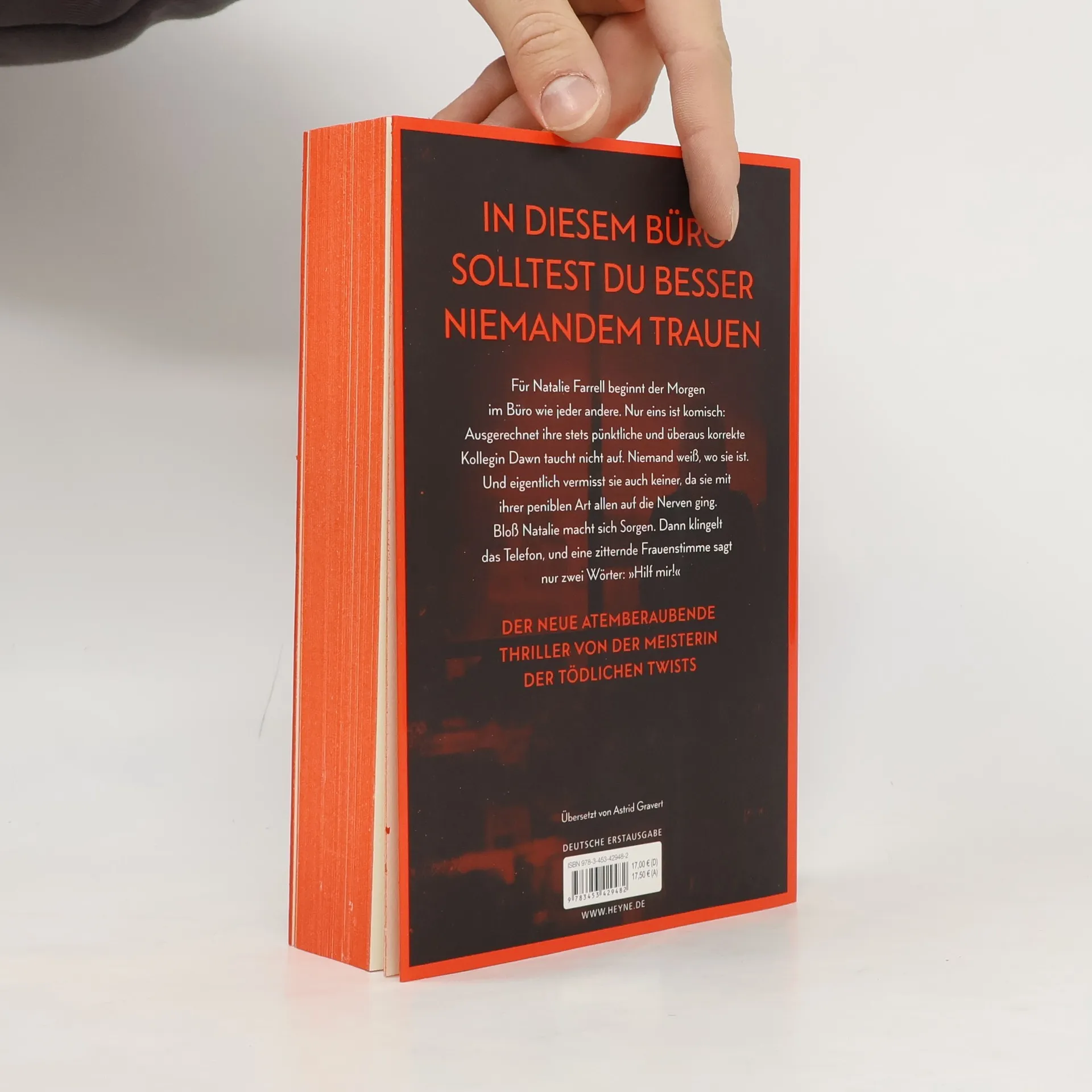 Zwei Frauen. Ein Büro. Ein schreckliches Verbrechen. Mit farbig gestaltetem Buchschnitt in limitierter Erstauflage Dawn Schiff ist seltsam. Darin sind sich ihre Kollegen einig. Sie sagt nie das Richtige. Sie hat keine Freunde. Aber sie ist jeden Morgen um Punkt 8:45 Uhr an ihrem Platz in der Firma, in der sie als Buchhalterin arbeitet. Bis sie eines Morgens nicht auftaucht. Dawns Kollegin Natalie Farrell wundert sich. Dann erhält sie einen anonymen Anruf und fährt zu Dawns Wohnung. Keine Spur von ihrer Kollegin. Doch Natalie bietet sich ein Bild des Grauens. Eins scheint bald klar: Jemand muss Dawn so sehr gehasst haben, dass er sie getötet hat. War es jemand aus ihrem Büro? Je mehr Natalie herausfindet, desto tiefer verstrickt sie sich selbst in ein Netz aus Lügen und Gewalt, aus dem es kein Entkommen gibt. Mit farbig gestaltetem Buchschnitt