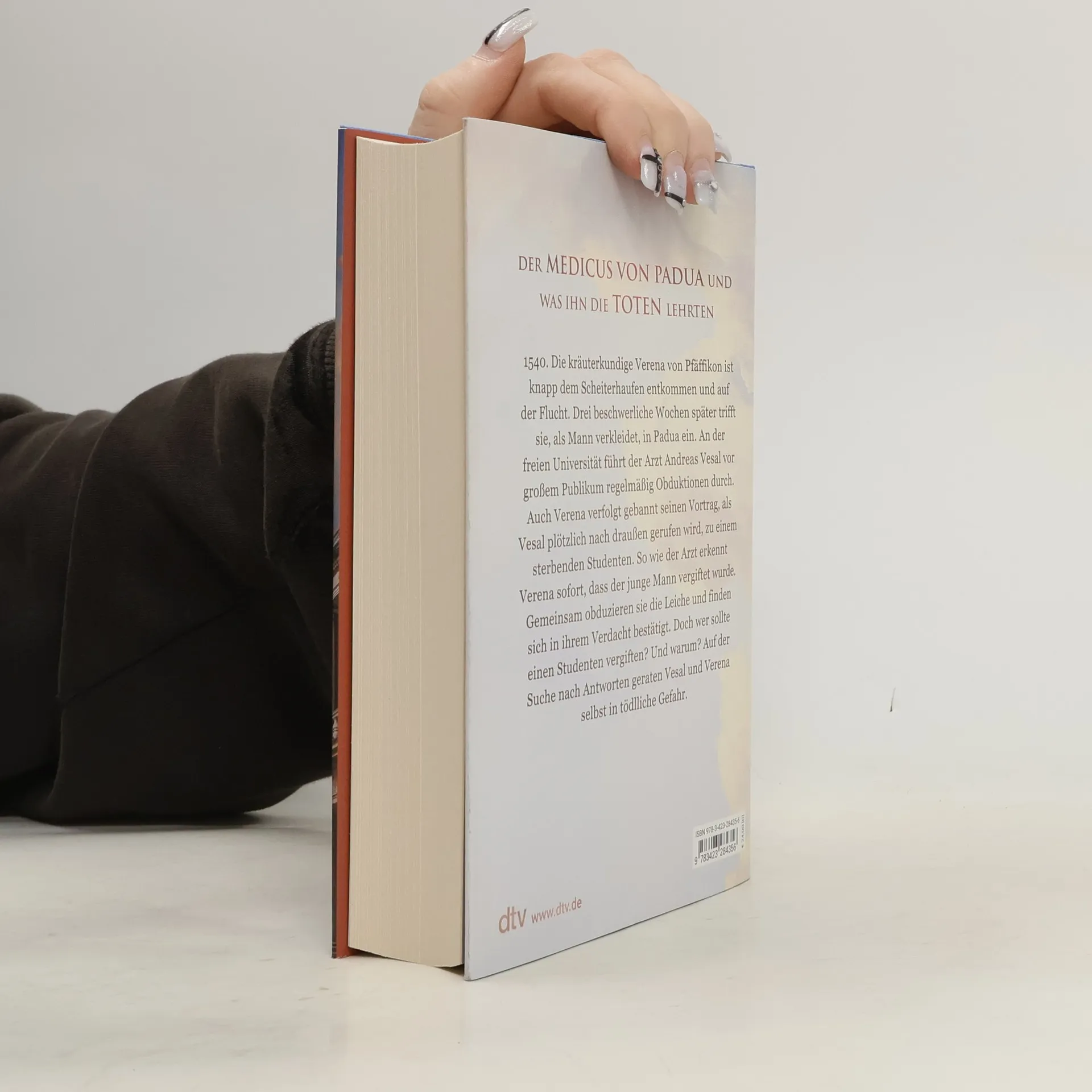 Ein großes Panorama aus historischem Wissen, Spannung, Intrigen und Liebe 1540. Die kräuterkundige Verena von Pfäffikon soll als Hexe verbrannt werden. Doch bevor sie auf dem Scheiterhaufen stirbt, brennt das Dorf – Verena gelingt die Flucht. Drei beschwerliche Wochen später trifft sie – als Mann verkleidet und sich nun Johann nennend – in Padua ein. Im Sog einer Gruppe von Studenten gelangt sie ins anatomische Theater und wird Zeugin, wie der berühmte Anatom Andreas Vesal eine Obduktion ausführt. Doch noch während der Demonstration wird Vesal nach draußen zu einem sterbenden Studenten gerufen. So wie der Arzt erkennt Verena sofort, dass der junge Mann vergiftet wurde. Gemeinsam obduzieren sie die Leiche und finden sich in ihrem Verdacht bestätigt. Doch wer sollte einen Studenten vergiften? Und warum?