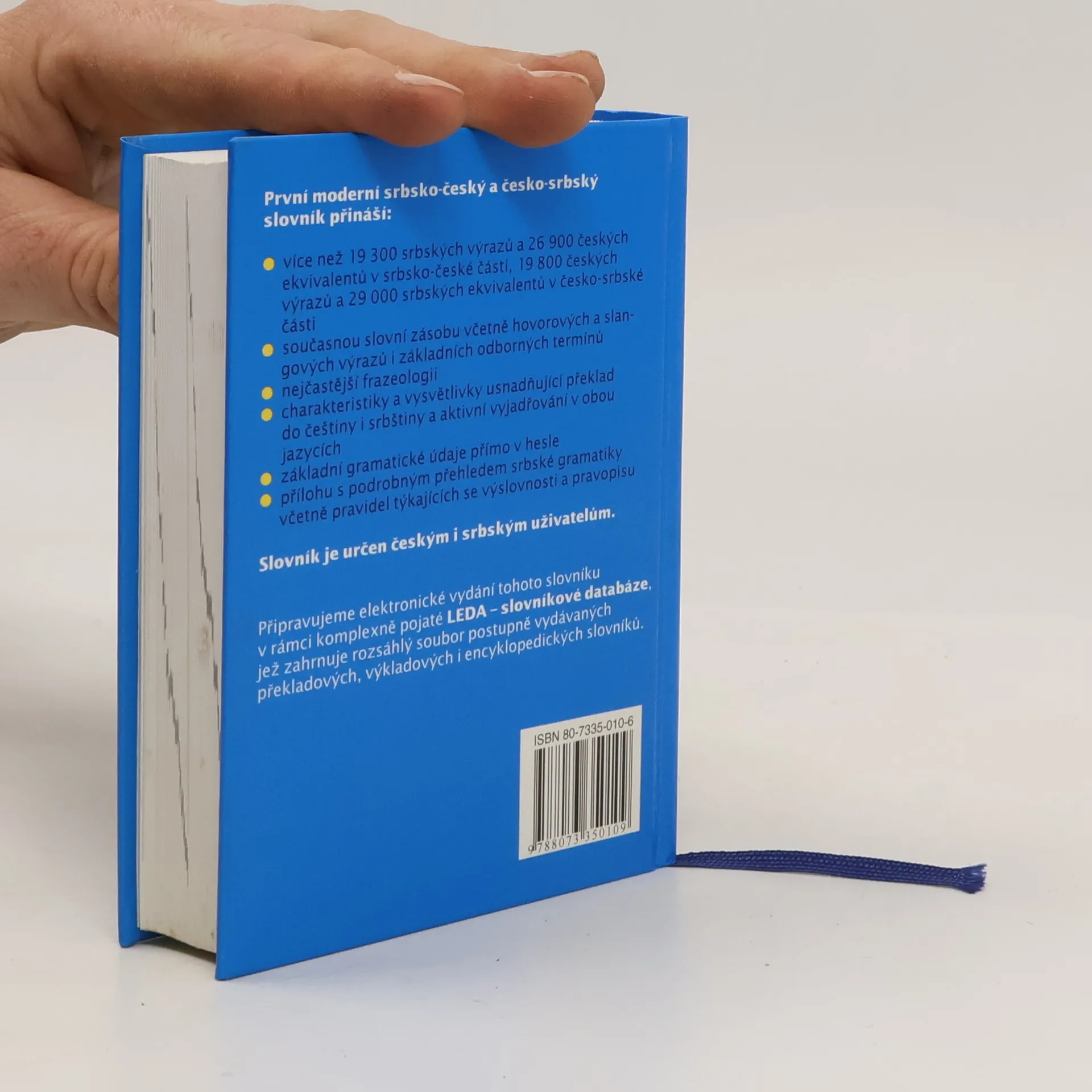 Poprvé od rozdělení Jugoslávie a následného rozdělení srbochorvatštiny na dva samostatné jazyky vychází na našem trhu Srbsko-český a česko-srbský slovník. Obsahuje více než 19 300 srbských výrazů a 26 900 českých ekvivalentů v srbsko-české části, 19 800 českých výrazů a 29 000 srbských ekvivalentů v česko-srbské části. Je určen širokému okruhu uživatelů k běžné konverzaci, například na dovolené, stane se nepostradatelnou pomůckou i pro studenty, ekonomy, komerční pracovníky a mnohé další.. Jelikož jsou v něm zachovány i některé vžité pojmy ostatních jazyků národů původní federace, může být využíván pro potřeby základního dorozumívání i v jiných republikách bývalé SFRJ. S ohledem na potřeby českého uživatele obsahuje slovník přílohu s podrobným přehledem srbské gramatiky včetně pravidel týkajících se výslovnosti a pravopisu.