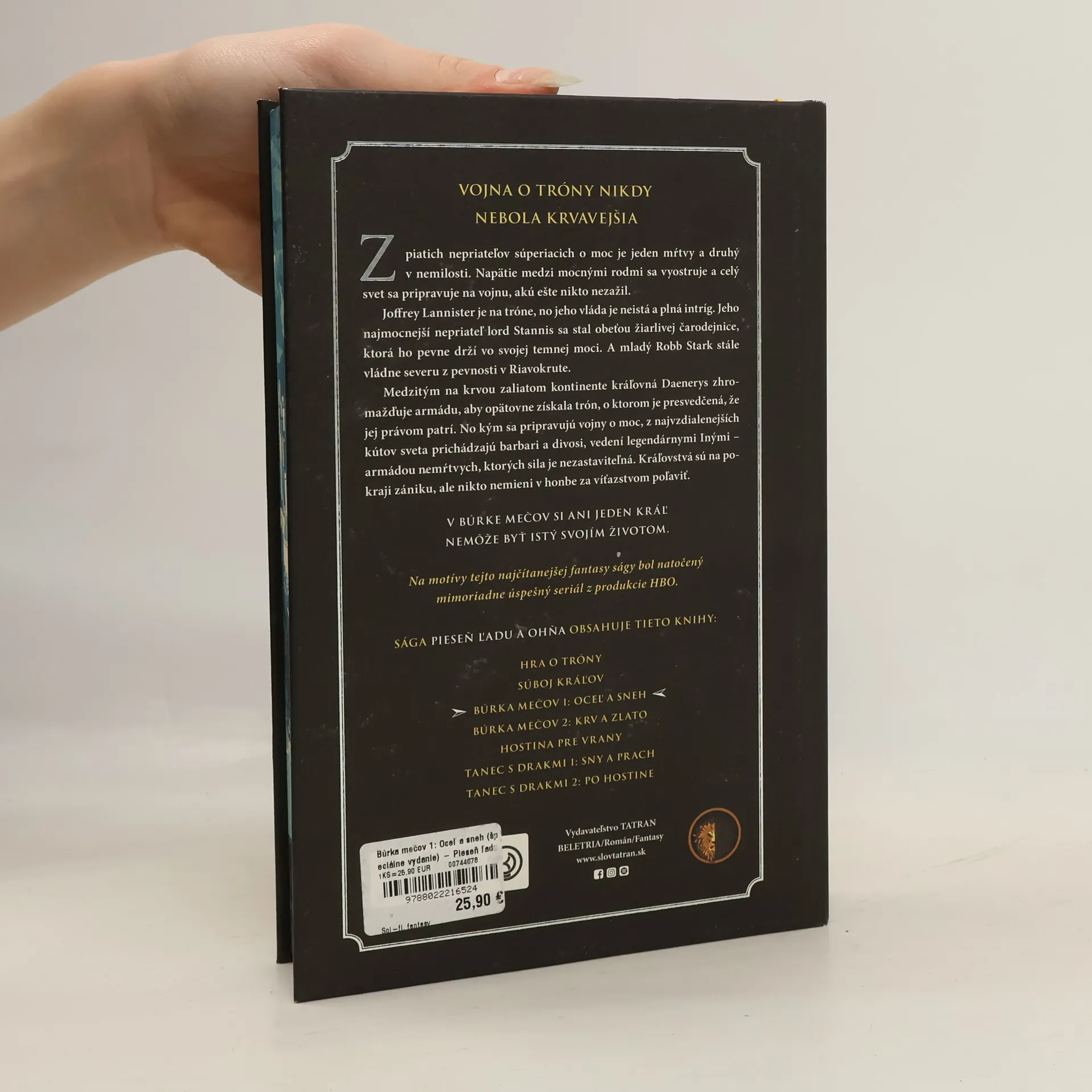 VOJNA O TRÓNY NIKDY NEBOLA KRVAVEJŠIA Z piatich nepriateľov súperiacich o moc je jeden mŕtvy a druhý v nemilosti. Napätie medzi mocnými rodmi sa vyostruje a celý svet sa pripravuje na vojnu, akú ešte nikto nezažil. Joffrey Lannister je na tróne, no jeho vláda je neistá a plná intríg. Jeho najmocnejší nepriateľ lord Stannis sa stal obeťou žiarlivej čarodejnice, ktorá ho pevne drží vo svojej temnej moci. A mladý Robb Stark stále vládne severu z pevnosti v Riavokrute. Medzitým na krvou zaliatom kontinente kráľovná Daenerys zhromažďuje armádu, aby opätovne získala trón, o ktorom je presvedčená, že jej právom patrí. No kým sa pripravujú vojny o moc, z najvzdialenejších kútov sveta prichádzajú barbari a divosi, vedení legendárnymi Inými – armádou nemŕtvych, ktorých sila je nezastaviteľná. Kráľovstvá sú na pokraji zániku, ale nikto nemieni v honbe za víťazstvom poľaviť. V BÚRKE MEČOV SI ANI JEDEN KRÁĽ NEMÔŽE BYŤ ISTÝ SVOJÍM ŽIVOTOM.