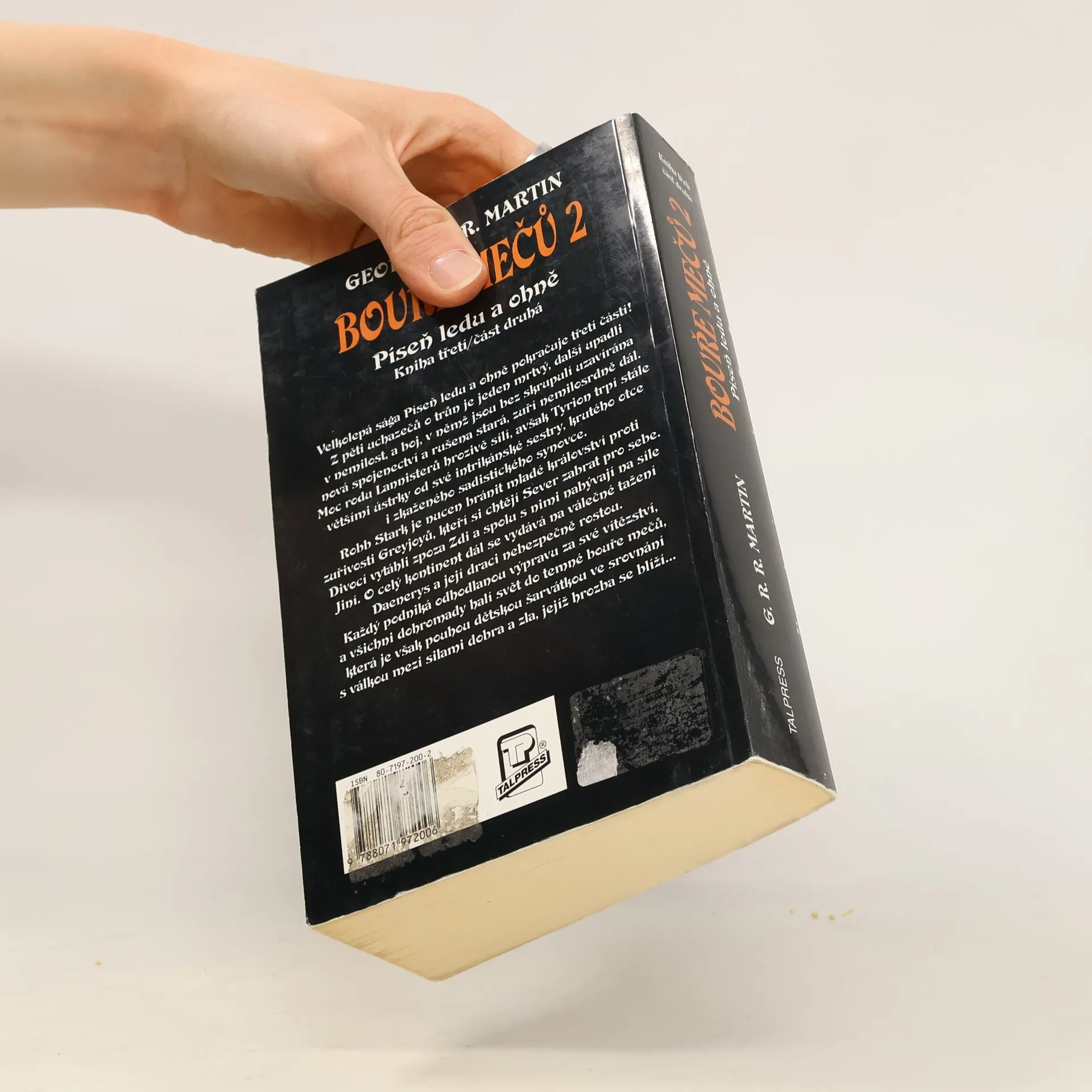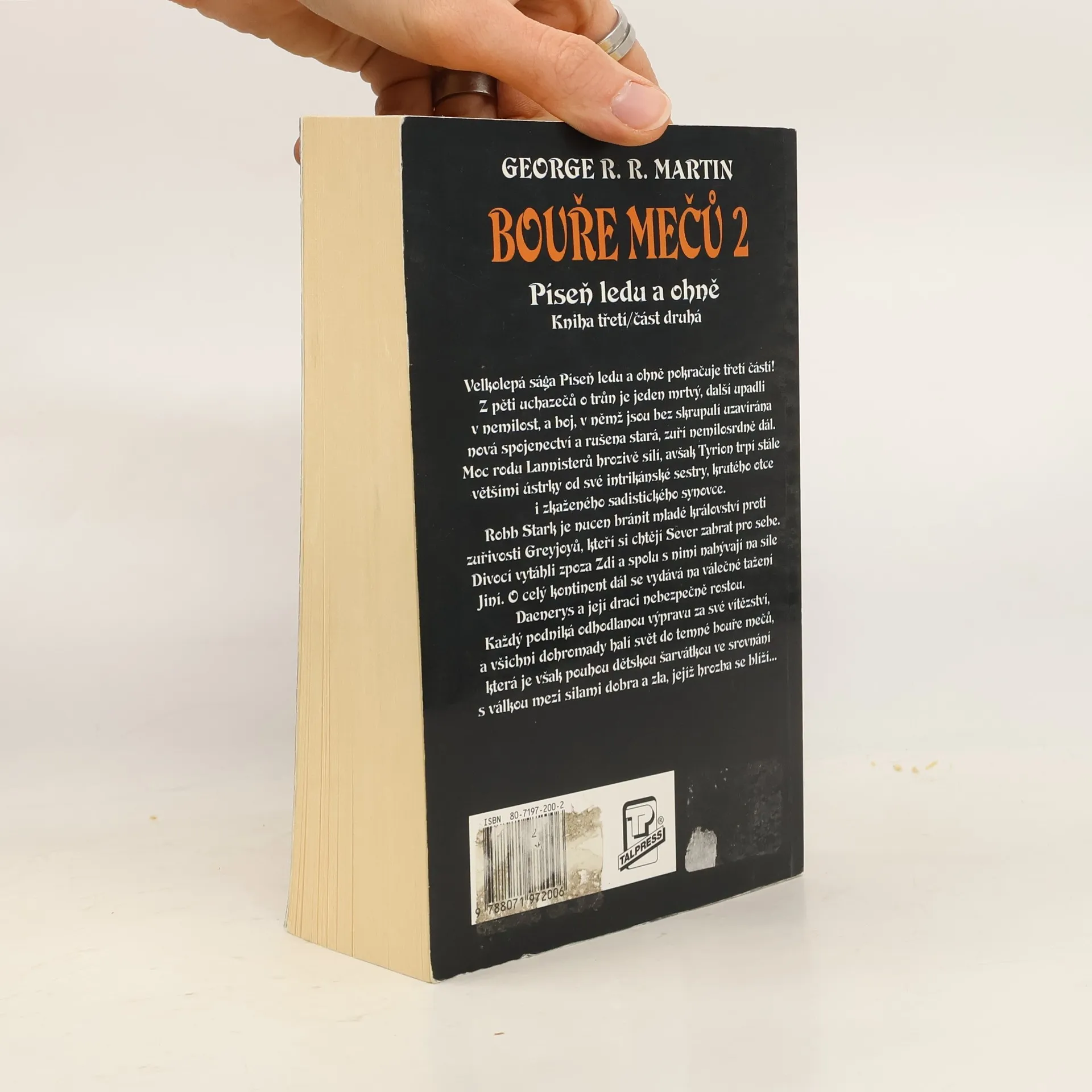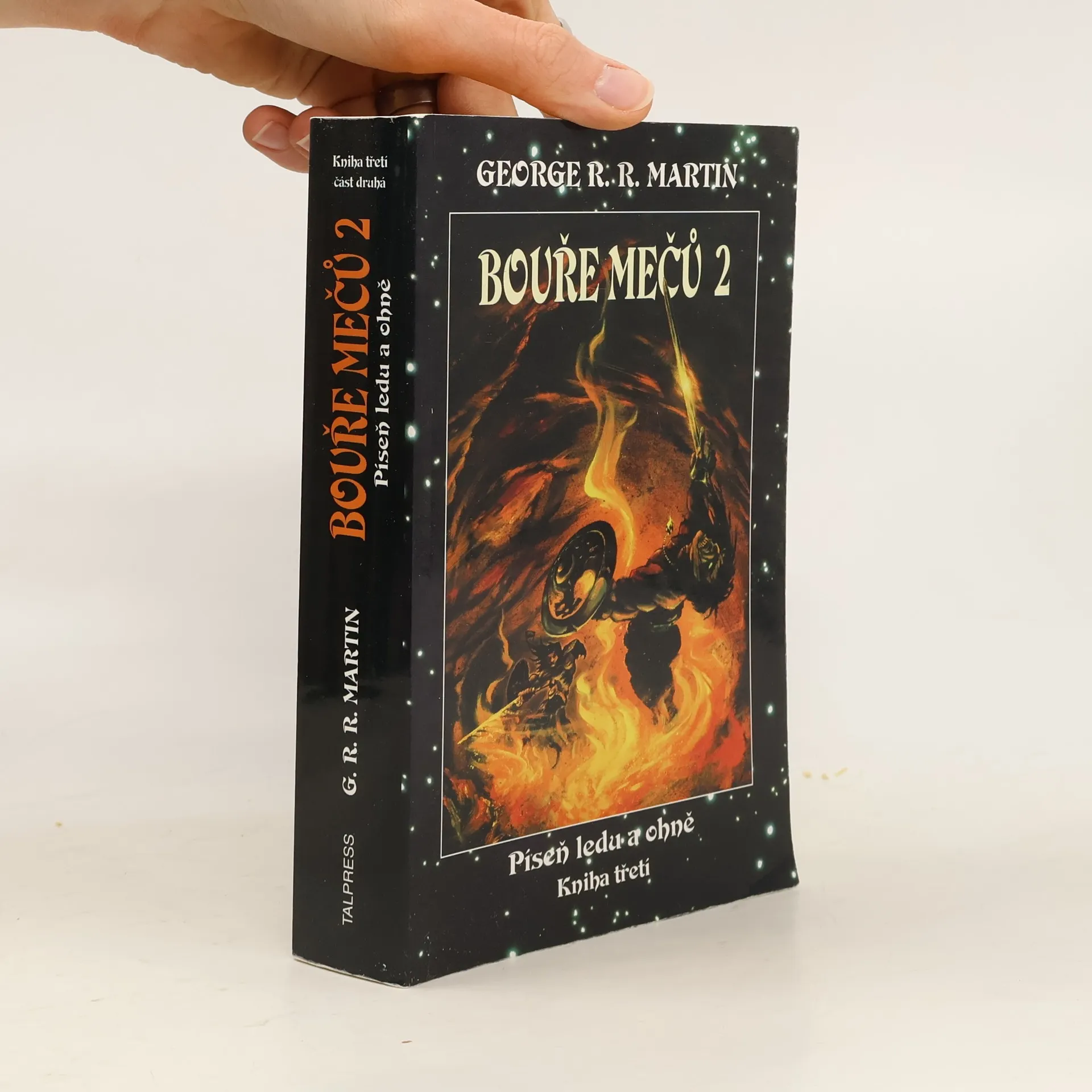 3. kniha série Píseň ledu a ohně – část 2. Z pěti uchazečů o trůn je jeden mrtvý, další upadli v nemilost, a boj, v němž jsou bez skrupulí uzavírána nová spojenectví a rušena stará, zuří nemilosrdně dál. Moc rodu Lannisterů hrozivě sílí, avšak Tyrion trpí stále většími ústrky od své intrikánské sestry, krutého otce i zkaženého sadistického synovce. Robb Stark je nucen bránit mladé království proti zuřivosti Greyjoyů, kteří si chtějí Sever zabrat pro sebe. Divocí vytáhli zpoza Zdi a spolu s nimi nabývají na síle Jiní. O celý kontinent dál se vydává na válečné tažení Daenerys a její draci nebezpečně rostou.Každý podniká odhodlanou výpravu za své vítězství, a všichni dohromady halí svět do temné bouře mečů, která je však pouhou dětskou šarvátkou ve srovnání s válkou mezi silami dobra a zla, jejíž hrozba se blíží… První vydání. (zdroj: legie.info)