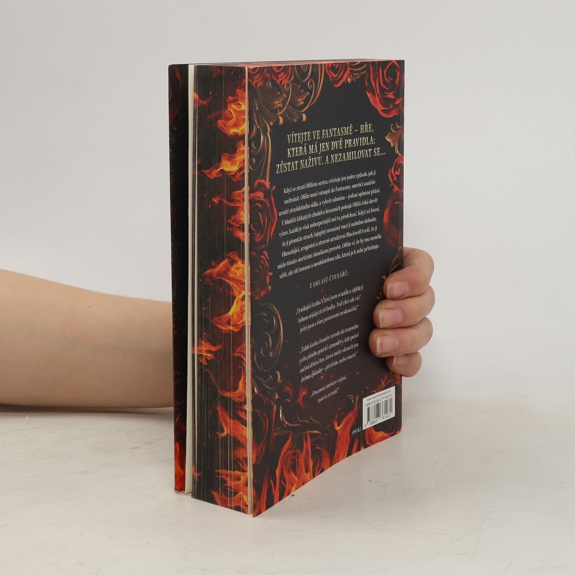 Když Ofélii a Genevieve náhle zemře matka, nemají ani čas truchlit. Ofélie totiž zdědila nejen mocnou nekromantskou magii, ale také obrovský dluh na jejich domě. Situace se však brzy ještě zhorší, protože Genevieve se rozhodne úvěr splatit tím, že vstoupí do Fantasmy – soutěže, kterou většina soutěžících nepřežije, ale vítězi se splní jedno přání. Aby mohla Ofélie sestru zachránit, musí se hry sama zúčastnit. Fantasma je však prokletým sídlem plným klikatých chodeb a honosných pokojů, v nichž číhají svůdní démoni a hříšná pokušení. Ofélie musí překonat celých devět úrovní zkoušek, aby zvítězila…, pokud ji tedy dřív nepřemůže vlastní strach. Když jí arogantní neznámý muž nabídne, že by ji mohl ochránit a vést, Ofélie ví, že by mu neměla věřit. Blackwell totiž možná nevypadá nebezpečně, ale zdání může klamat. Jenže v sázce je život její sestry, a tak si nemůže dovolit ho odmítnout. Důležité je, aby ignorovala neodolatelnou temnou přitažlivost, která je k sobě neustále táhne. Ztráta vlastního srdce je totiž ve Fantasmě nebezpečnější než prohra. Limitovaná edice populární knihy Fantasma. Jako první kniha v České republice vychází s exkluzivní 3D ořízkou, a to v nákladu pouhých 300 kusů.