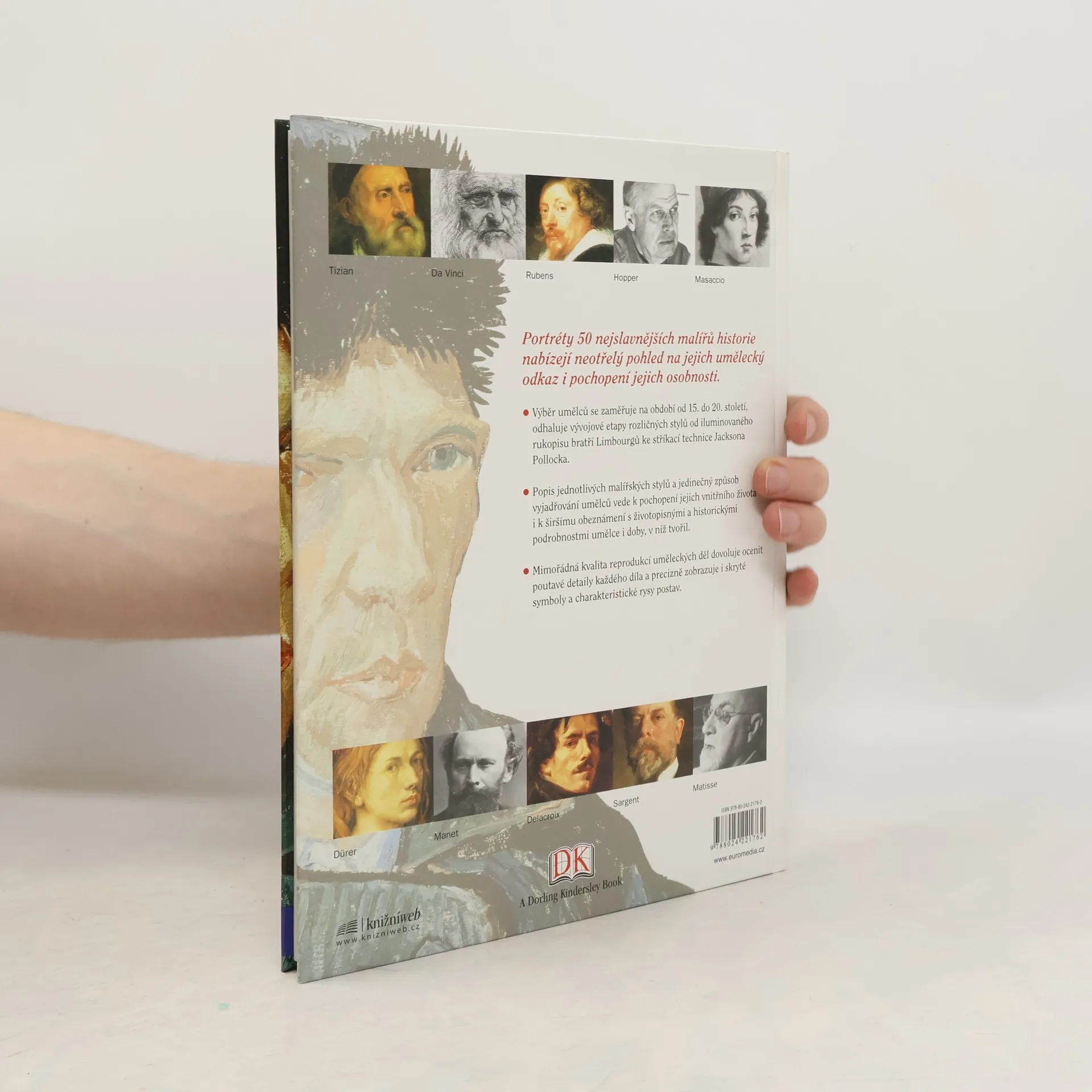 Portréty 50 nejslavnějších malířů historie nabízejí neotřelý pohled na jejich umělecký odkaz i pochopení jejich osobnosti. Výběr umělců se zaměřuje na období od 15. do 20. století, odhaluje vývojové etapy rozličných stylů od iluminovaného rukopisu bratří Limbourgů ke stříkací technice Jacksona Pollocka. Popis jednotlivých malířských stylů a jedinečný způsob vyjadřování umělců vede k pochopení jejich vnitřního života i k širšímu obeznámení s životopisnými a historickými podrobnosti umělce i doby, v níž tvořil. Mimořádná kvalita reprodukcí uměleckých děl dovoluje ocenit poutavé detaily každého díla a precizně zobrazuje i skryté symboly a charakteristické rysy postav. 2. vydání.