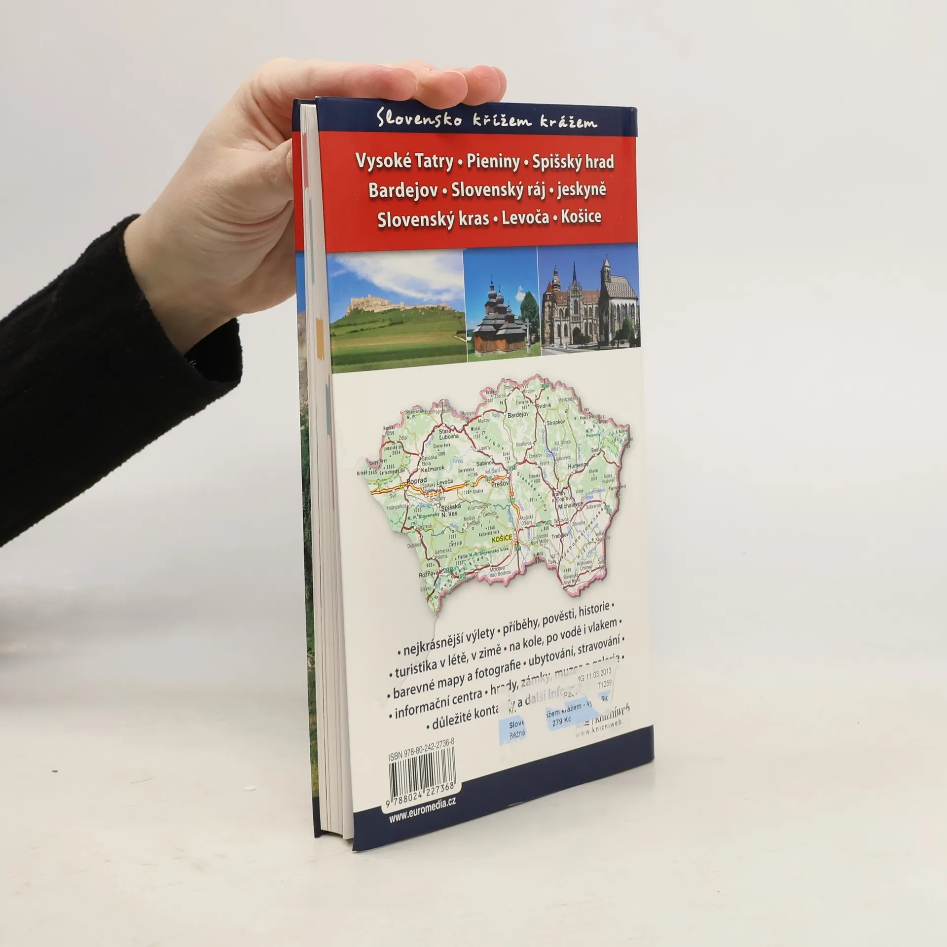 První z třísvazkové edice průvodců Slovensko křížem krážem. Po stručném seznámení s oblastí uvádí doporučené okružní trasy pro automobilisty a 10 tematických okruhů (příroda, církevní památky, pro rodiny s dětmi aj.). Dále je východní Slovensko představeno po jednotlivých regionech, od lokalit nejznámějších až po ty dosud turisticky neobjevené. Deset nejkrásnějších výletů na závěr je inspirací pro vlastní objevování. Připojeny jsou aktuální informace o ubytování, parkování, stravování, u kulturních zařízení a památek otevírací doba.