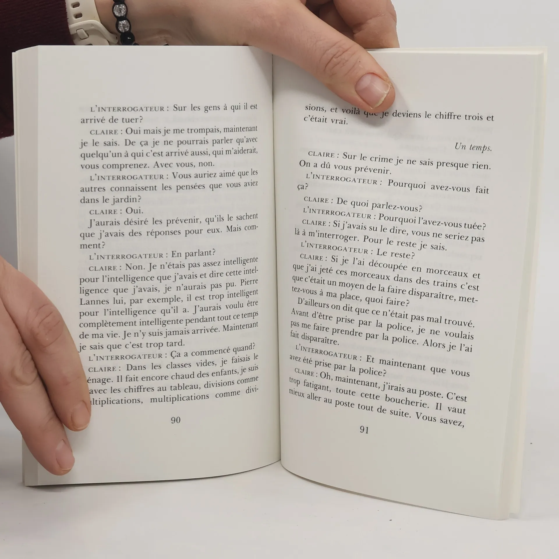Pièce de théâtre basé sur le roman L'Amante anglaise (1967).Quatrième de couverture:«Amélie Rabilloux a avoué dès qu'elle a été arrêtée.Je les ai appelés les Lannes. Elle, Claire, Claire Lannes. Lui, Pierre, Pierre Lannes. J'ai changé aussi la victime du crime ; elle est devenue Marie-Thérèse Bousquet, la cousine germaine de Pierre Lannes, celle qui tient la maison des Lannes à Viorne. Je crois que la peine d'Amélie Rabilloux a été considérablement écourtée. Au bout de cinq ans, en effet, on l'a revue à Savigny-sur-Orge. Elle était revenue dans sa maison, rue de la Paix.Quelquefois on l'a encore revue. Elle attendait l'autobus en bas de sa rue.Toujours elle était seule.Un jour on ne l'a plus vue.» - Marguerite Duras