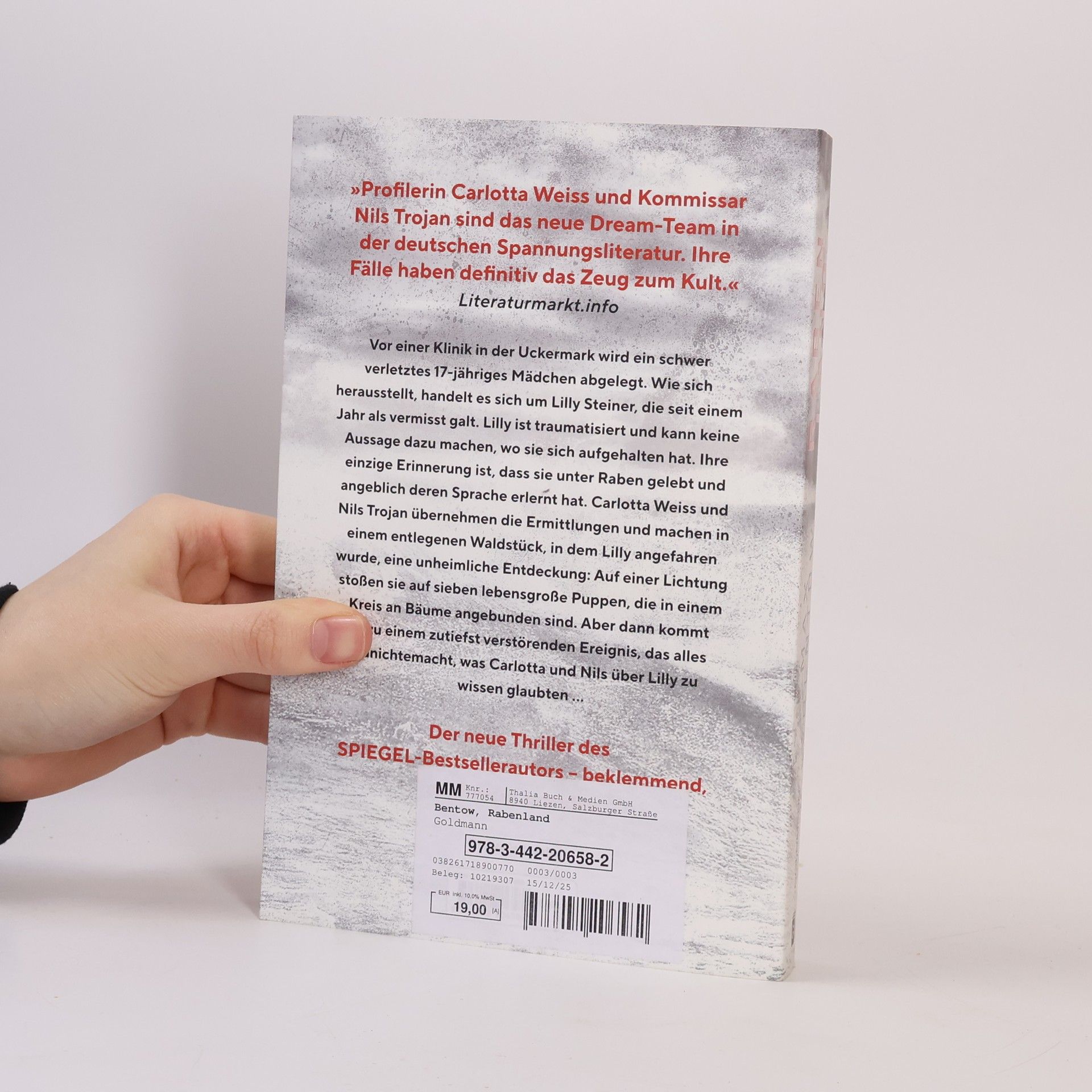 Ein Mädchen ohne Erinnerung und ein verstörender Fund auf einer einsamen Lichtung im Wald: der zweite Fall für Carlotta Weiss und Nils Trojan.Vor einer Klinik in der Uckermark wird ein schwer verletztes 17-jähriges Mädchen abgelegt. Wie sich herausstellt, handelt es sich um Lilly Steiner, die seit einem Jahr als vermisst galt. Lilly ist traumatisiert und kann keine Aussage dazu machen, wo sie sich aufgehalten hat. Ihre einzige Erinnerung ist, dass sie unter Raben gelebt und angeblich deren Sprache erlernt hat. Carlotta Weiss und Nils Trojan übernehmen die Ermittlungen und machen in einem entlegenen Waldstück, in dem Lilly angefahren wurde, eine unheimliche Entdeckung: Auf einer Lichtung stoßen sie auf sieben lebensgroße Puppen, die in einem Kreis an Bäume angebunden sind. Kurz darauf erhalten sie eine zutiefst verstörende Nachricht: Lilly wurde im Krankenhaus ermordet. Was wusste sie, das so gefährlich war, dass sie mit ihrem Leben dafür bezahlen musste?