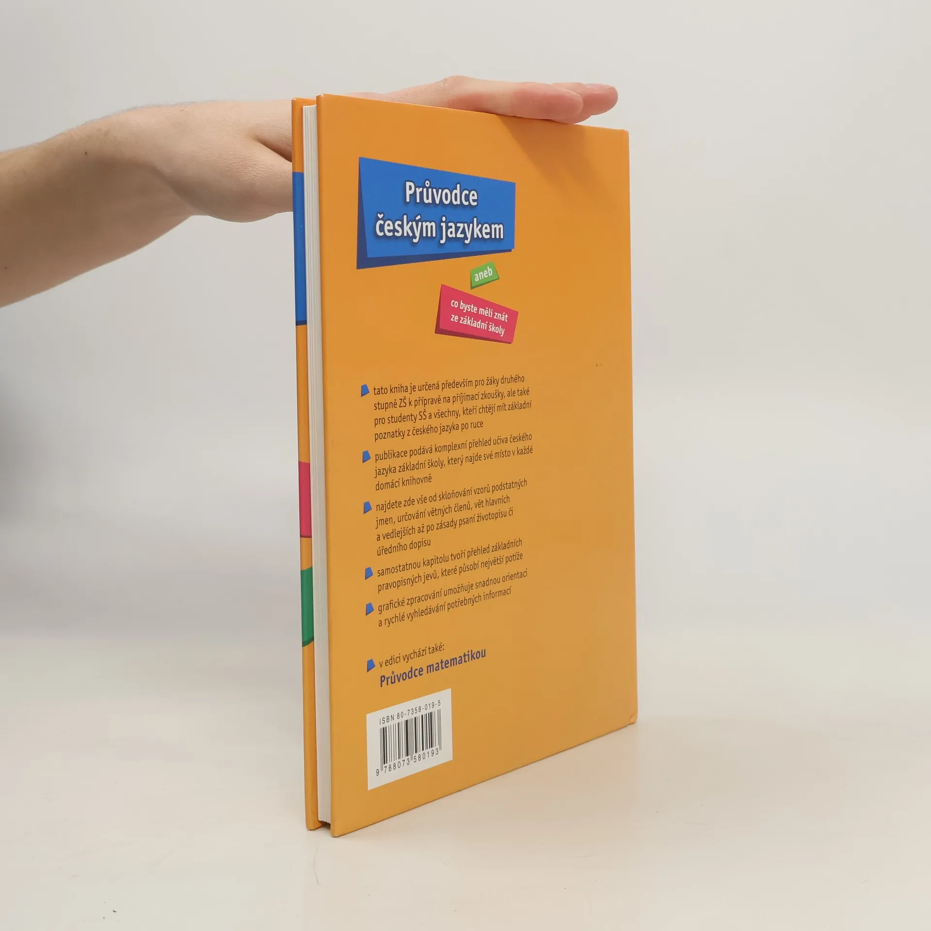 Publikace je určena nejen žákům základních škol a studentům prvních ročníků středních škol, ale všem, kteří si chtějí osvěžit základní poznatky z českého jazyka. Barevná poutavá kniha s atraktivní grafickou úpravou typu rodinná encyklopedie. Publikace je určena nejen žákům základních škol a studentům prvních ročníků středních škol, ale všem, kteří si chtějí osvěžit základní poznatky z českého jazyka. Najdete zde vše od skloňování vzorů podstatných jmen, určování větných členů, vět hlavních a vedlejších až po zásady psaní životopisu či úředního dopisu. Kniha je přehledně členěna do 8 kapitol, které jsou dále rozvedeny do dílčích podkapitol. V poslední 8. kapitole je obsažen přehled základních pravopisných jevů, které působí největší potíže. Grafickým odlišením stěžejního textu od doplňujících informací je zajištěna snadná orientace rychlé vyhledávání potřebných informací. Text doprovází průvodní kreslená postava, která se vyjadřuje k různým mluvnickým problémům a svými promluvami je odlehčuje.