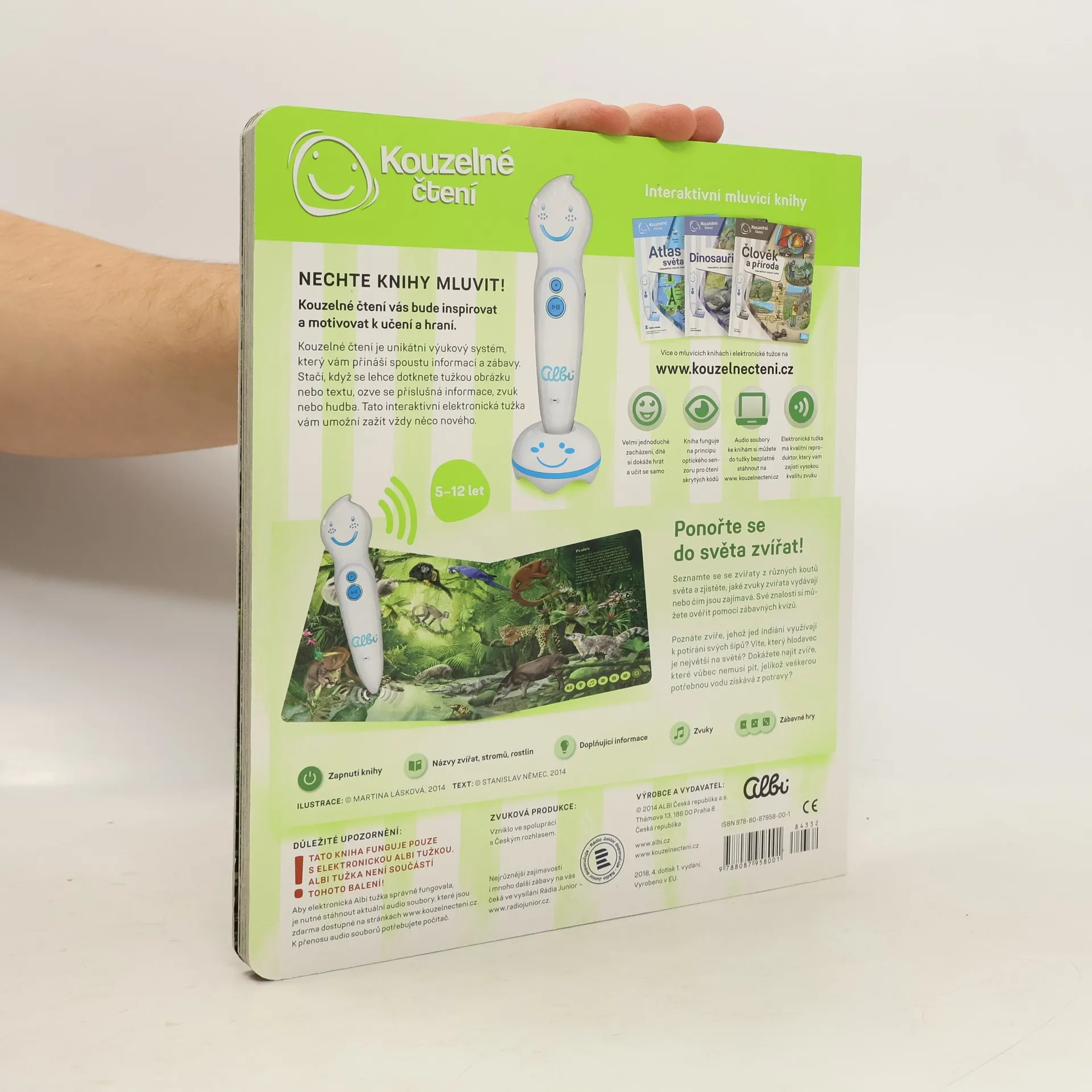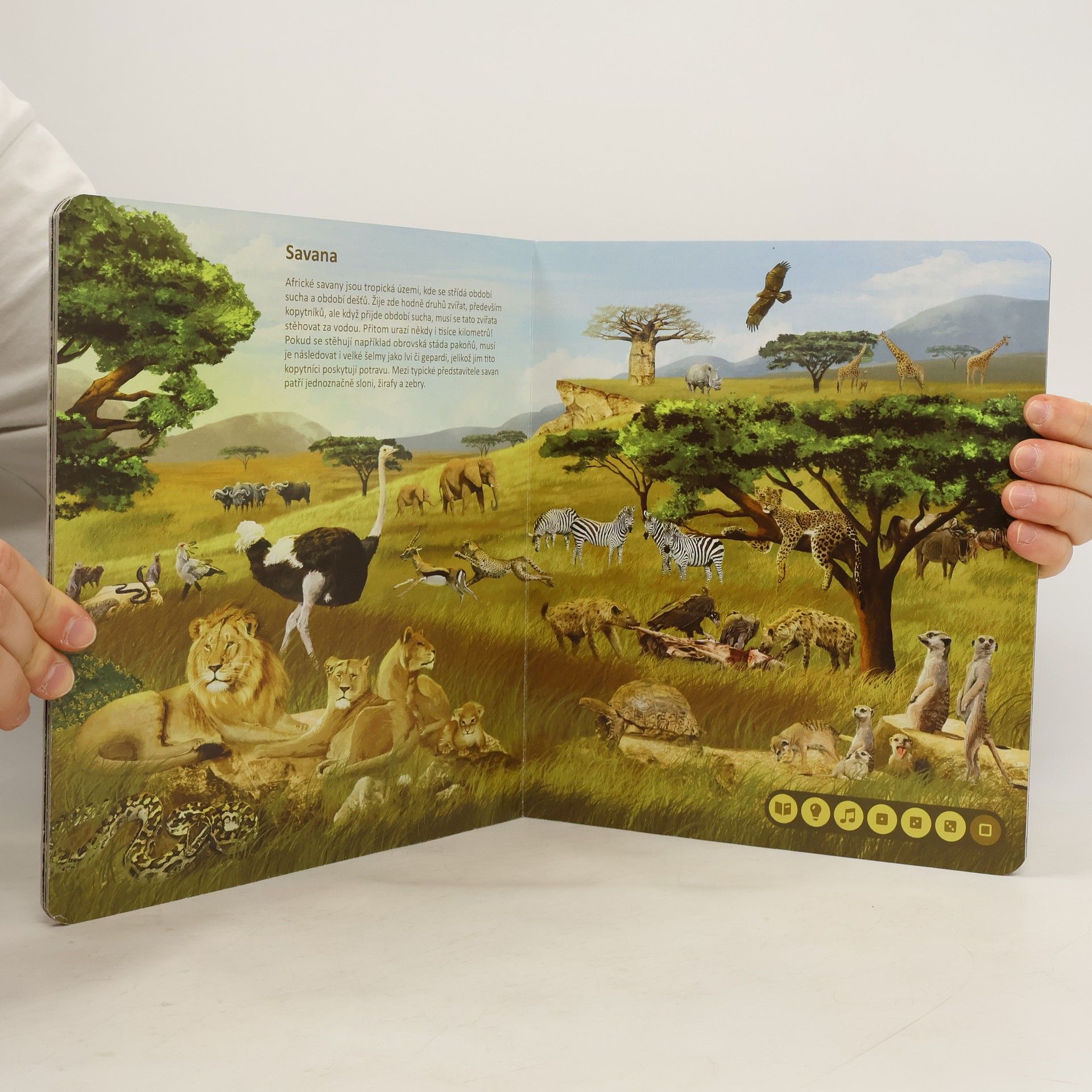 Ponořte se do světa zvířat! Seznamte se se zvířaty ze všech koutů světa a zjistěte, jaké zvuky vydávají, čím se živí nebo čím jsou jedinečná. Kniha vás tématicky provede osmi různými prostředími z naší planety, jako je les, savana, poušť, moře a další. Na každé straně se dozvíte, jaká zvířata v daném prostředí žijí, jak se jmenují, jaké zvuky vydávají a čím jsou zajímavá. Své znalosti si pak můžete ověřit pomocí zábavných kvízů, které jsou vždy rozděleny do tří kategorií: najdi zvíře podle názvu, najdi zvíře podle zvuku, najdi zvíře podle zajímavosti. Kniha je namluvena známým českým hercem Otakarem Brouskem ml. Kniha obsahuje přes 900 zvuků a textů. Kniha vznikla ve spolupráci s Českým rozhlasem.
