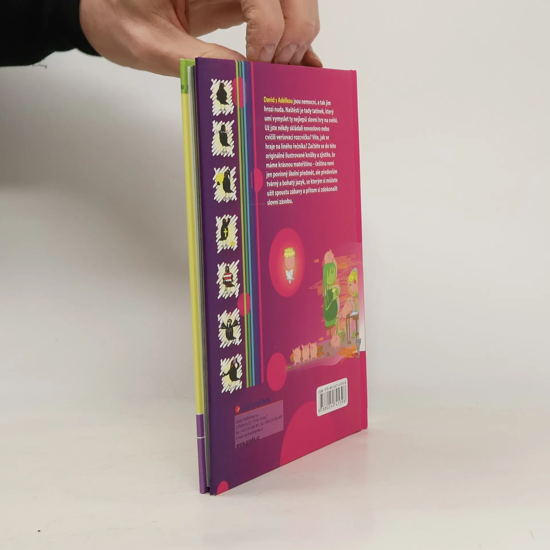 David s Adélkou jsou nemocní, a tak jim hrozí nuda. Naštěstí je tady tatínek, který umí vymyslet ty nejlepší slovní hry na světě. Už jste někdy skládali novoslovo nebo cvičili veršovací rozcvičku? Víte, jak se hraje na líného řečníka? Začtěte se do této originálně ilustrované knížky a zjistíte, že máme krásnou mateřštinu - čeština není jen povinný školní předmět, ale především tvárný a bohatý jazyk, se kterým si můžete užít spoustu zábavy a přitom si zdokonalit slovní zásobu.