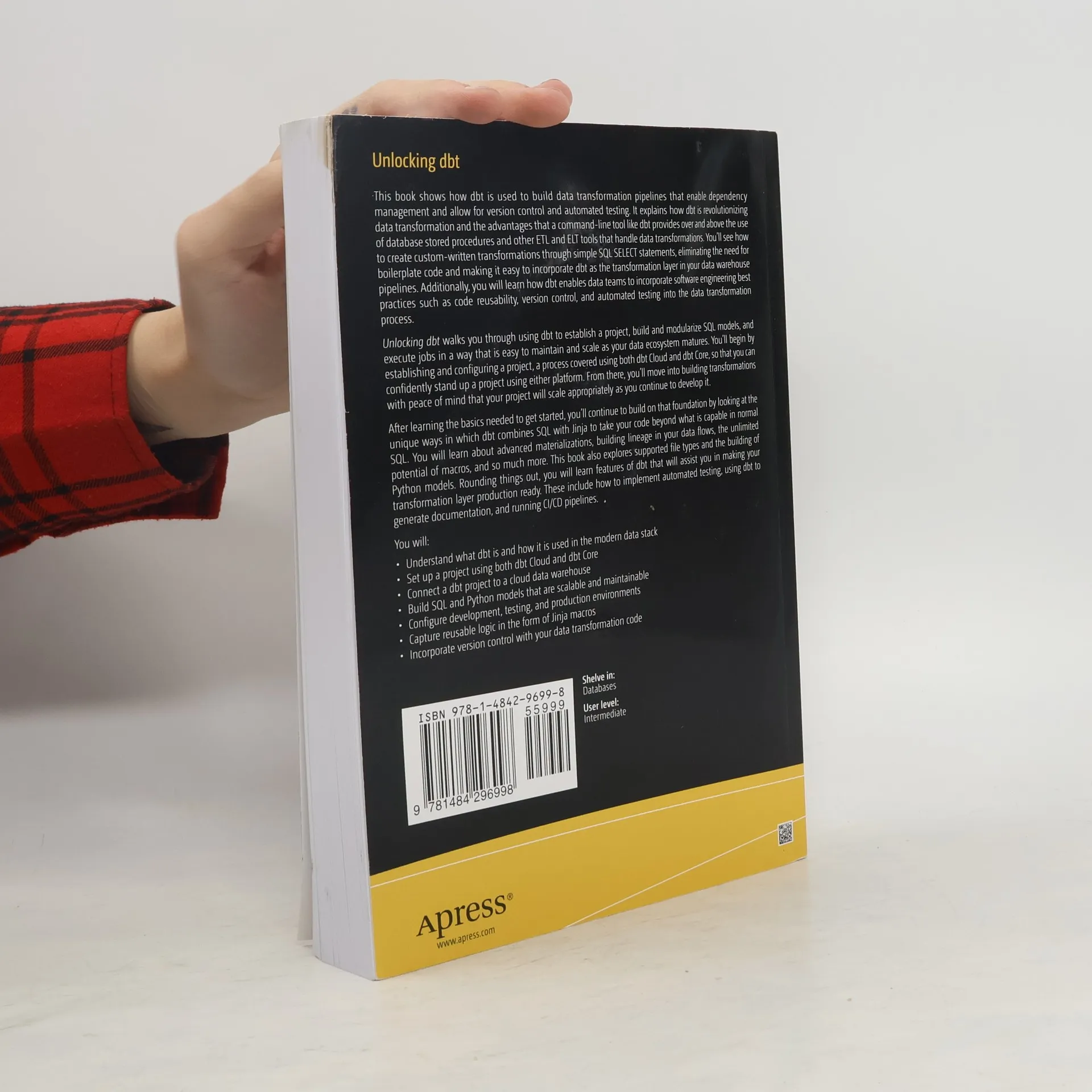 This book shows how dbt is used to build data transformation pipelines that enable dependency management and allow for version control and automated testing. It explains how dbt is revolutionizing data transformation and the advantages that a command-line tool like dbt provides over and above the use of database stored procedures and other ETL and ELT tools that handle data transformations. You’ll see how to create custom-written transformations through simple SQL SELECT statements, eliminating the need for boilerplate code and making it easy to incorporate dbt as the transformation layer in your data warehouse pipelines. Additionally, you will learn how dbt enables data teams to incorporate software engineering best practices such as code reusability, version control, and automated testing into the data transformation process. Unlocking dbt walks you through using dbt to establish a project, build and modularize SQL models, and execute jobs in a way that is easy to maintain and scale as your data ecosystem matures. You’ll begin by establishing and configuring a project, a process covered using both dbt Cloud and dbt Core, so that you can confidently stand up a project using either platform. From there, you’ll move into building transformations with peace of mind that your project will scale appropriately as you continue to develop it. After learning the basics needed to get started, you’ll continue to build on that foundation by looking at the unique ways in which dbt combines SQL with Jinja to take your code beyond what is capable in normal SQL. You will learn about advanced materializations, building lineage in your data flows, the unlimited potential of macros, and so much more. This book also explores supported file types and the building of Python models. Rounding things out, you will learn features of dbt that will assist you in making your transformation layer production ready. These include how to implement automated testing, using dbt to generate documentation, and running CI/CD pipelines. What You Will Learn Understand what dbt is and how it is used in the modern data stack Set up a project using both dbt Cloud and dbt Core Connect a dbt project to a cloud data warehouse Build SQL and Python models that are scalable and maintainable Configure development, testing, and production environments Capture reusable logic in the form of Jinja macros Incorporate version control with your data transformation code Who This Book Is For Current and aspiring data professionals, including architects, developers, analysts, engineers, data scientists, and consultants who are beginning the journey of using dbt as part of their data pipeline’s transformation layer. Readers should have a foundational knowledge of writing basic SQL statements, development best practices, and working with data in an analytical context such as a data warehouse.