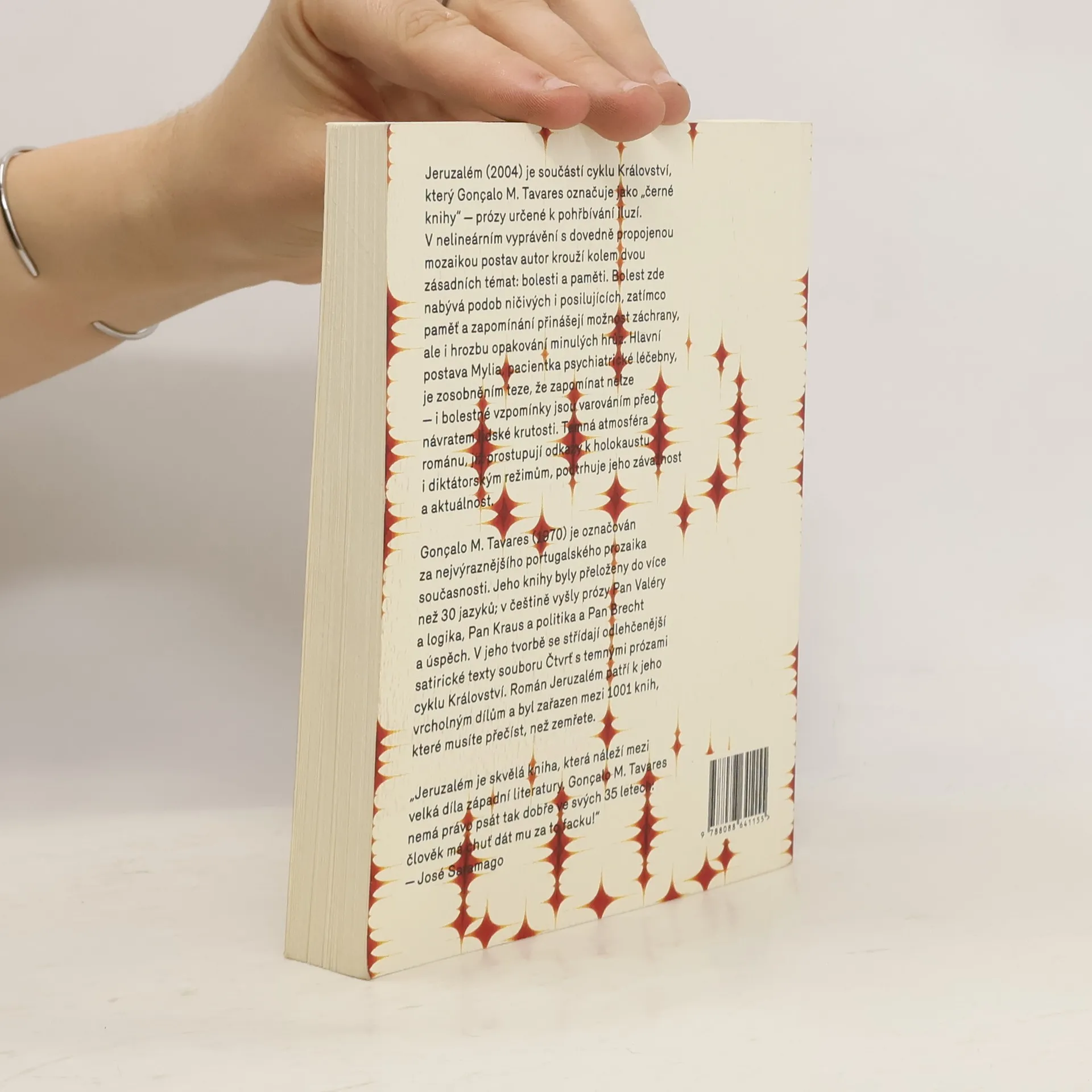 Jeruzalém (2004) je součástí cyklu Království, který Gonçalo M. Tavares označuje jako „černé knihy“ – prózy určené k pohřbívání iluzí. V nelineárním vyprávění s dovedně propojenou mozaikou postav autor krouží kolem dvou zásadních témat: bolesti a paměti. Bolest zde nabývá podob ničivých i posilujících, zatímco paměť a zapomínání přinášejí možnost záchrany, ale i hrozbu opakování minulých hrůz. Hlavní postava Mylia, pacientka psychiatrické léčebny, je zosobněním teze, že zapomínat nelze – i bolestné vzpomínky jsou varováním před návratem lidské krutosti. Temná atmosféra románu, jíž prostupují odkazy k holokaustu i diktátorským režimům, podtrhuje jeho závažnost a aktuálnost.