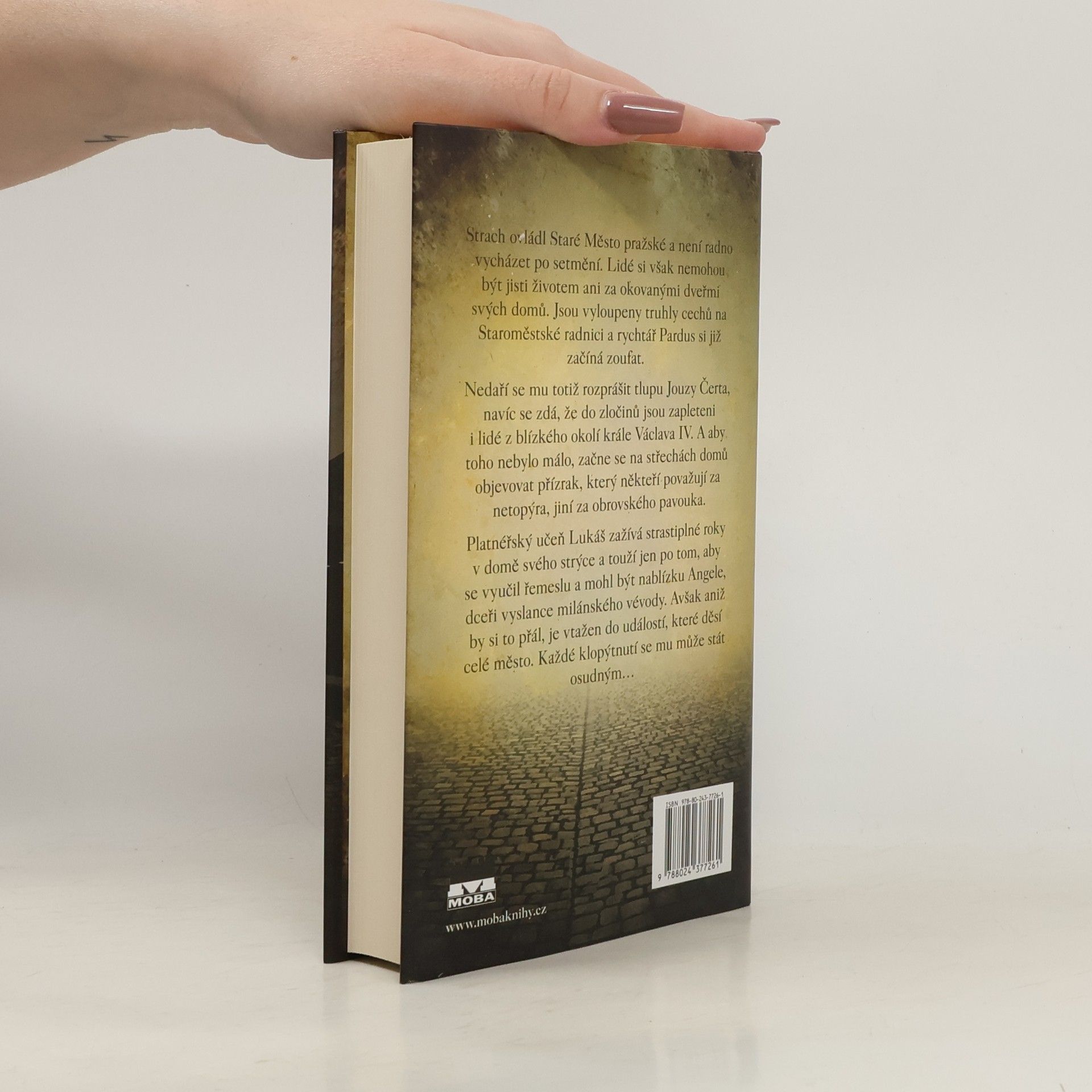 Strach ovládl Staré Město pražské a není radno vycházet po setmění. Lidé si ale nejsou jisti životem ani za okovanými dveřmi svých domů. Jsou vyloupeny truhly cechů na Staroměstské radnici a rychtář Pardus si již začíná zoufat. Nedaří se mu rozprášit tlupu Jouzy Čerta a navíc se jeví, že tlupě pomáhá někdo z blízkého okolí krále Václava IV. A k tomu se ještě na domech a jejich střechách začne objevovat přízrak, který někteří považují za netopýra, jiní za obrovského pavouka. Platnéřský učeň Lukáš zažívá strastiplné roky v domě svého strýce a má jen dvě touhy: vyučit se řemeslu a být v blízkosti Angely, dcery vyslance milánského vévody. Avšak aniž by si to přál, je vtažen do dění, které děsí město, a od té chvíle začíná hon i na něho. Každé jeho klopýtnutí může být tím posledním...