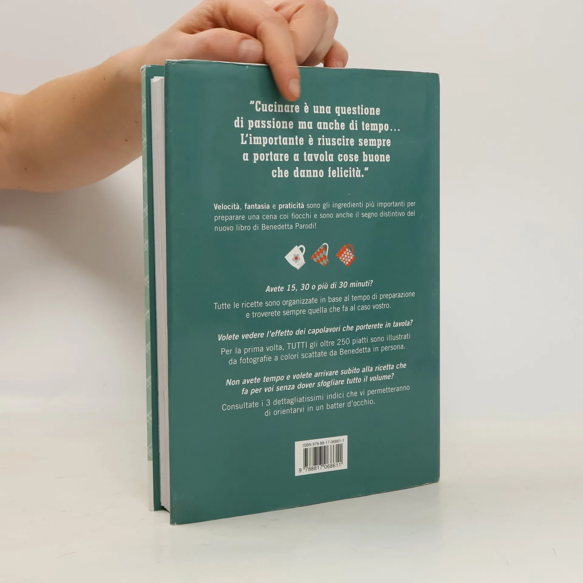 Sempre occupati a districarci tra mille impegni – casa, famiglia, lavoro, imprevisti – quante volte abbiamo cenato a base di pasta in bianco e tonno in scatola perché non avevamo proprio il tempo per preparare niente di meglio? Quante volte, stanchi di questi menù deprimenti, avremmo voluto lanciare un SOS che arrivasse alle orecchie giuste, a un ideale “pronto soccorso cena” che facesse comparire in tavola pranzi degni di questo nome, sani e gustosi nel tempo di uno schiocco di dita? Finalmente il segnale di allarme è arrivato a destinazione: Benedetta Parodi ha inventato per noi le perfette ricette “salvacena”, ovvero quelle che in 15 minuti ci permettono di preparare piatti semplici ma buonissimi e – perché no – anche di grande effetto! Ma Benedetta ha pensato anche a chi di tempo ne ha un po’ di più e ha dato vita a un manuale di facilissima consultazione che va incontro a ogni esigenza, organizzato in modo che sia sempre comodo trovare ciò che si cerca. Gli antipasti, i primi, i secondi e i dolci sono ordinati per tempo di realizzazione: da quelli che si preparano in un quarto d’ora, ai piatti da 30 minuti, fino a quelli un po’ più elaborati da fare quando si ha più di mezz’ora a disposizione. E grazie ai ricchissimi indici degli ingredienti, delle portate e dei tempi di preparazione ci vorrà un attimo per trovare la ricetta che fa al caso nostro. E Benedetta non si è fermata qui: per la prima volta, infatti, TUTTE le ricette sono illustrate da fotografie scattate da lei in persona, per rendere immediata la verifica del risultato raggiunto. Ma solo di quello estetico: per quanto riguarda il gusto, Benedetta è una garanzia! Allora, che aspettate: È PRONTO!