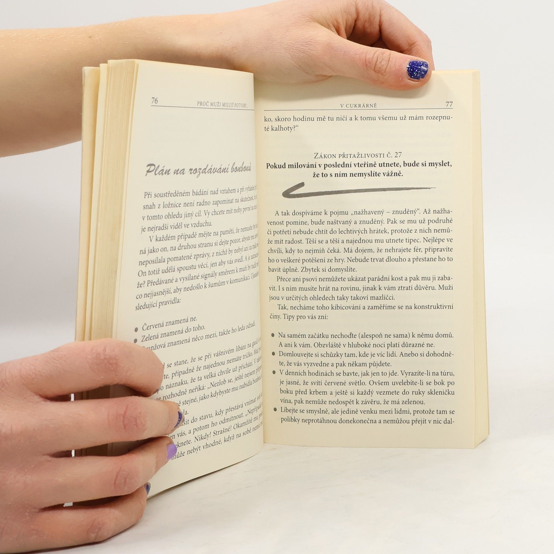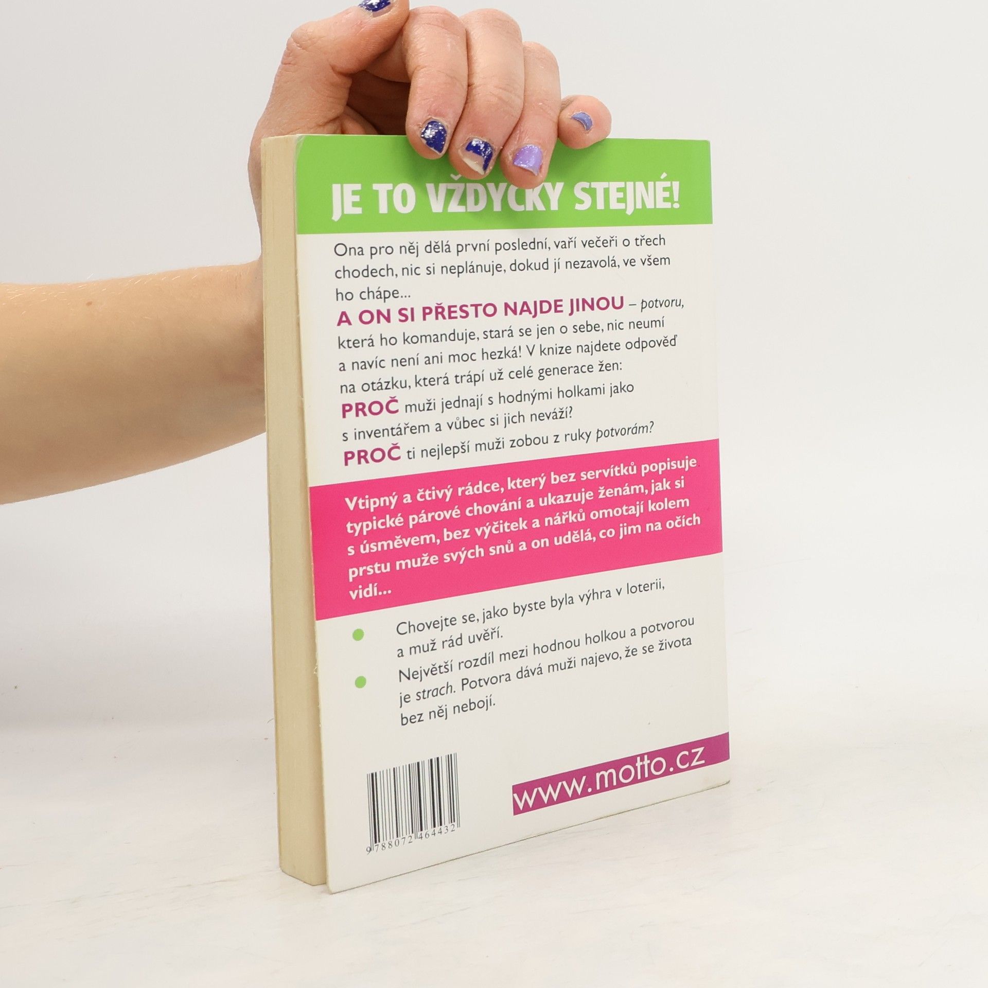 Vtipný a čtivý rádce, který bez servítku popisuje typické párové chování a ukazuje ženám, jak si s úsměvem, bez výčitek a nářku omotají kolem prstu muže svých snu a on udělá, co jim na očích vidí... Proč muži jednají s hodnými holkami jak s inventářem, ale zobou z ruky potvorám? Vtipná kniha, která otevřeně a bez zastírání popisuje typické párové chování. Poradí vám, jak si s úsměvem, bez výčitek a nářků, omotáte kolem prstu muže svých snů.