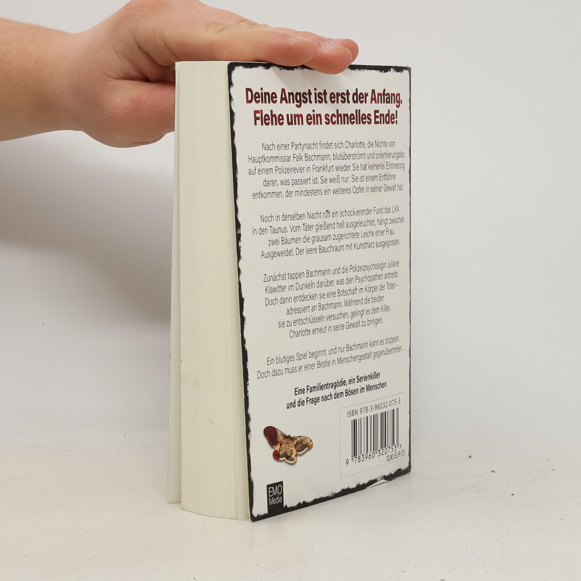 Deine Angst ist erst der Anfang. Flehe um ein schnelles Ende! Nach einer Partynacht findet sich Charlotte, die Nichte von Hauptkommissar Falk Bachmann, blutüberströmt und orientierungslos auf einem Polizeirevier in Frankfurt wieder. Sie hat keinerlei Erinnerung daran, was passiert ist. Sie weiß nur: Sie ist einem Entführer entkommen, der mindestens ein weiteres Opfer in seiner Gewalt hat. Noch in derselben Nacht ruft ein schockierender Fund das LKA in den Taunus. Vom Täter gleißend hell ausgeleuchtet, hängt zwischen zwei Bäumen die grausam zugerichtete Leiche einer Frau. Ausgeweidet. Der leere Bauchraum mit Kunstharz ausgegossen. Zunächst tappen Bachmann und die Polizeipsychologin Juliane Klawitter im Dunkeln darüber, was den Psychopathen antreibt. Doch dann entdecken sie eine Botschaft im Körper der Toten – adressiert an Bachmann. Während die beiden sie zu entschlüsseln versuchen, gelingt es dem Killer, Charlotte erneut in seine Gewalt zu bringen. Ein blutiges Spiel beginnt, und nur Bachmann kann es stoppen. Doch dazu muss er einer Bestie in Menschengestalt gegenübertreten … Eine Familientragödie, ein Serienkiller und die Frage nach dem Bösen im Menschen