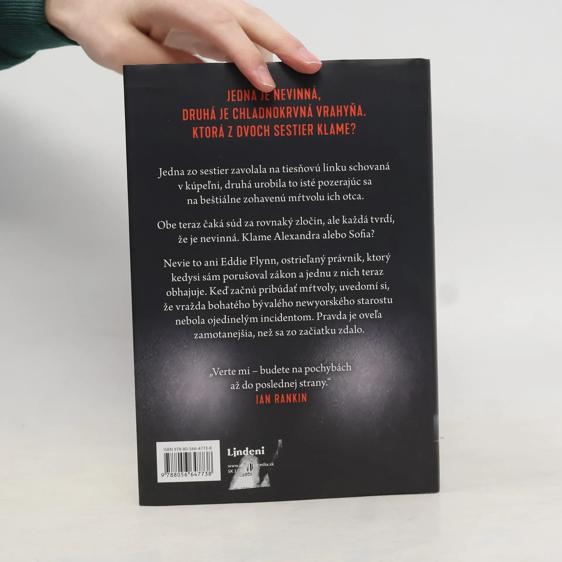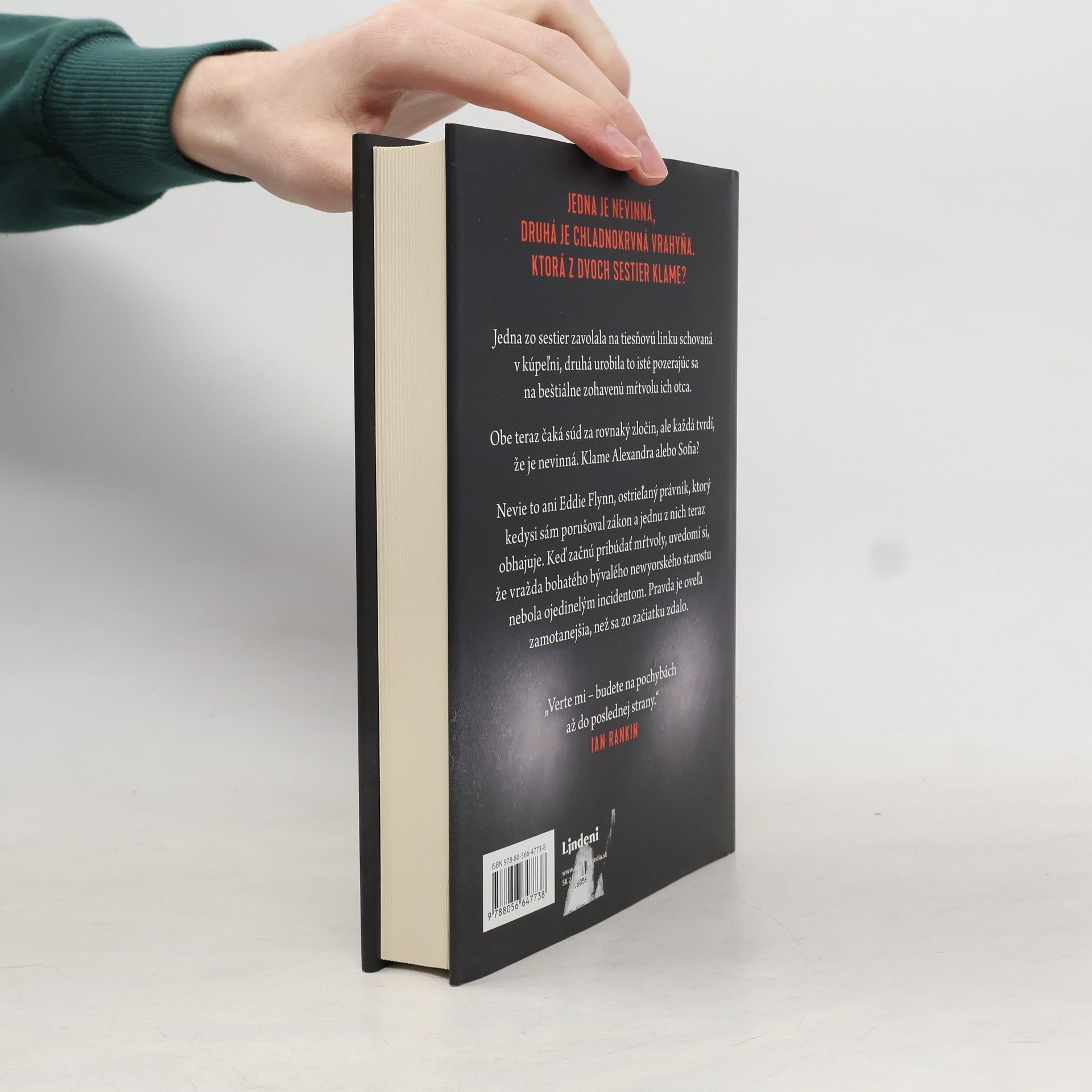 Bezkompromisný právnik Eddie Flynn sa vracia! Błyskotlivá, pútavá a dynamická kniha, pre ktorú stojí za to prebdiť noc. Jedna sestra sa ukryla v kúpeľni a zavolala na 911. Druhá stála nad bestiálne zohavenými telami otca a vybrala si ten istý číslo. Keď si uvedomili, že nie sú v dome samé, pochopili aj to, že každá z nich bude ďalším cieľom. Policajti ich obidve zadržali a teraz čakajú na proces za tú istú zločin. Každá tvrdí, že je nevinná. Jedna z nich klame. A ani Eddie Flynn, právnik, ktorý predtým, ako sa začal riadiť zákonom, roky sám porušoval, nevie, ktorá. Keď sa medzi osobami spojenými so záležitosťou začnú objavovať mŕtvoly, Eddie si uvedomuje, že vražda bývalého starostu nebola ojedinelým prípadom. Bude musieť zistiť, ktorá zo sestier Avellino objavila v sebe žilku sériového vraha.
