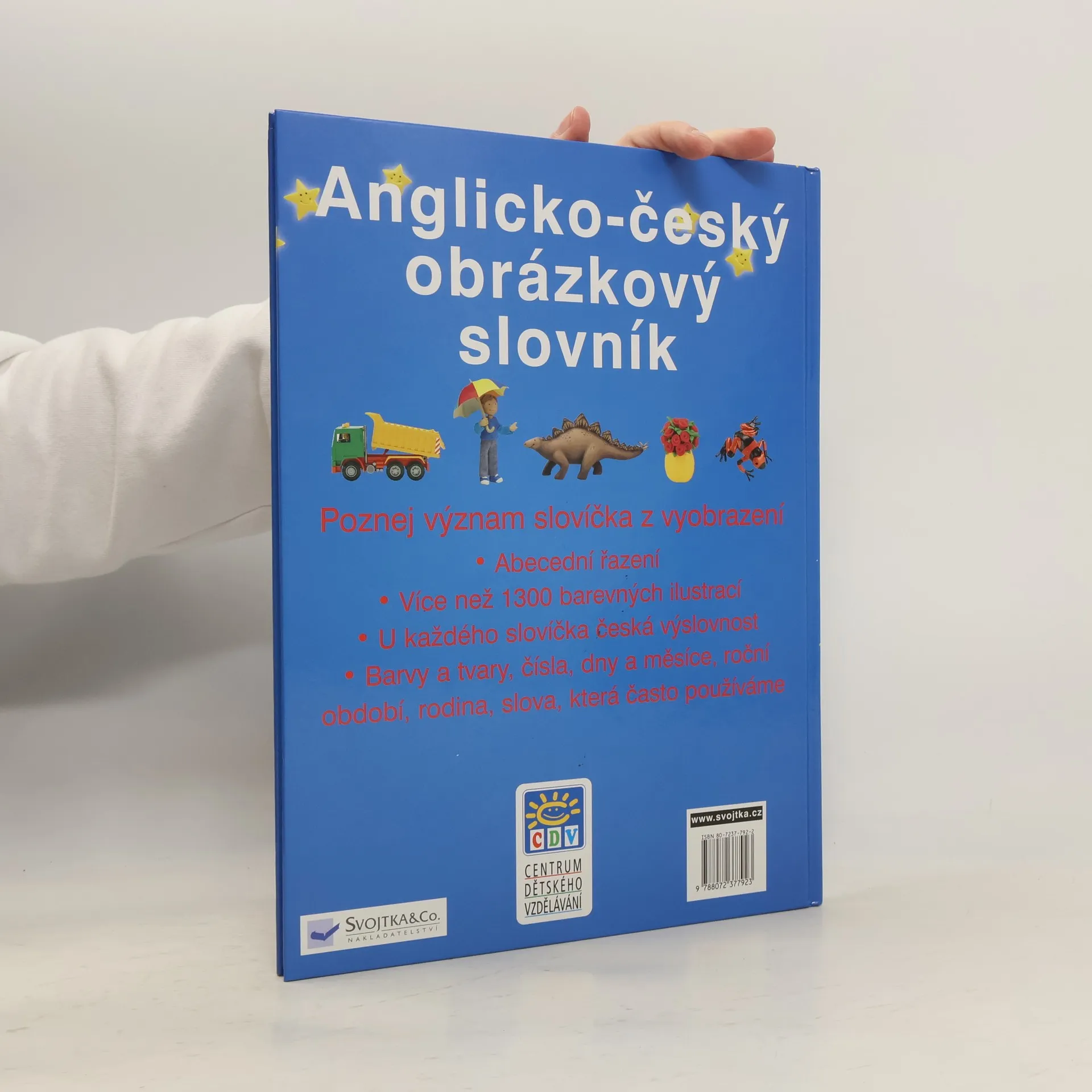 Poznej význam slovíčka z vyobrazení - Abecední řazení - Více než 1300 barevných ilustrací - U každého slovíčka česká výslovnost - Barvy a tvary, čísla, dny a měsíce, roční období, rodina, slova, která často používáme Knížka je určena spíše dětem.