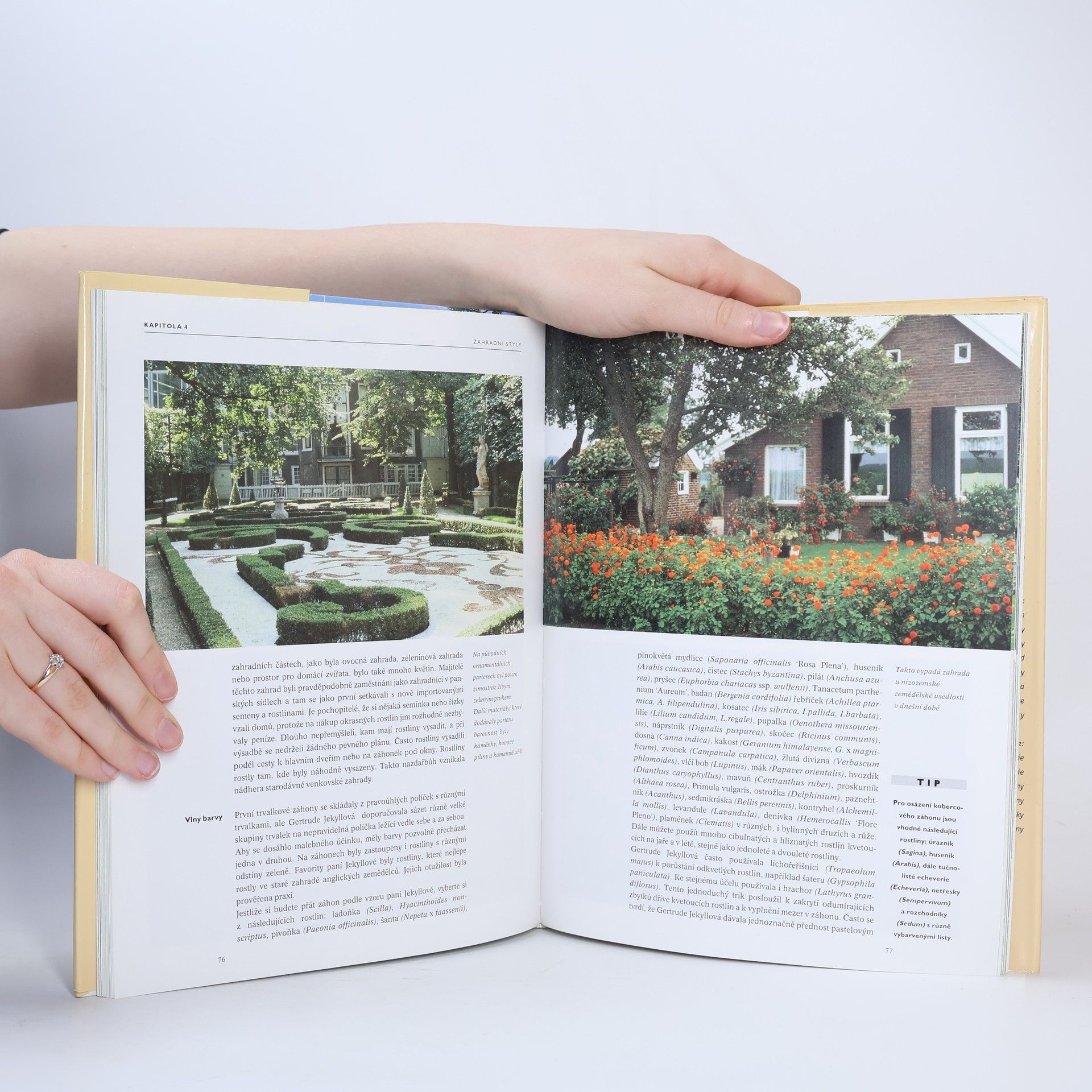 Historie nejvýznamnějších zahradních stylů a podoby historických zahrad v jednotlivých slohových úpravách. Použití charakteristických prvků zahradních stylů minulosti v současné zahradě. Vlastnosti půdy a její příprava před osazením rostlin. Funkce zeleně (stromů, keřů,trávníků) v zahradě. Rozvržení barevné plochy a linie kvetoucích rostlin. Způsoby ohraničení zahrad a typy zelených plotů, jejich řez, tvarování a vedení. Zahradní architektura a vhodné druhy popínavých rostlin. Seznamy a názorné plánky rozvržení rostlin, vhodných pro napodobení různých stylů zahrady.