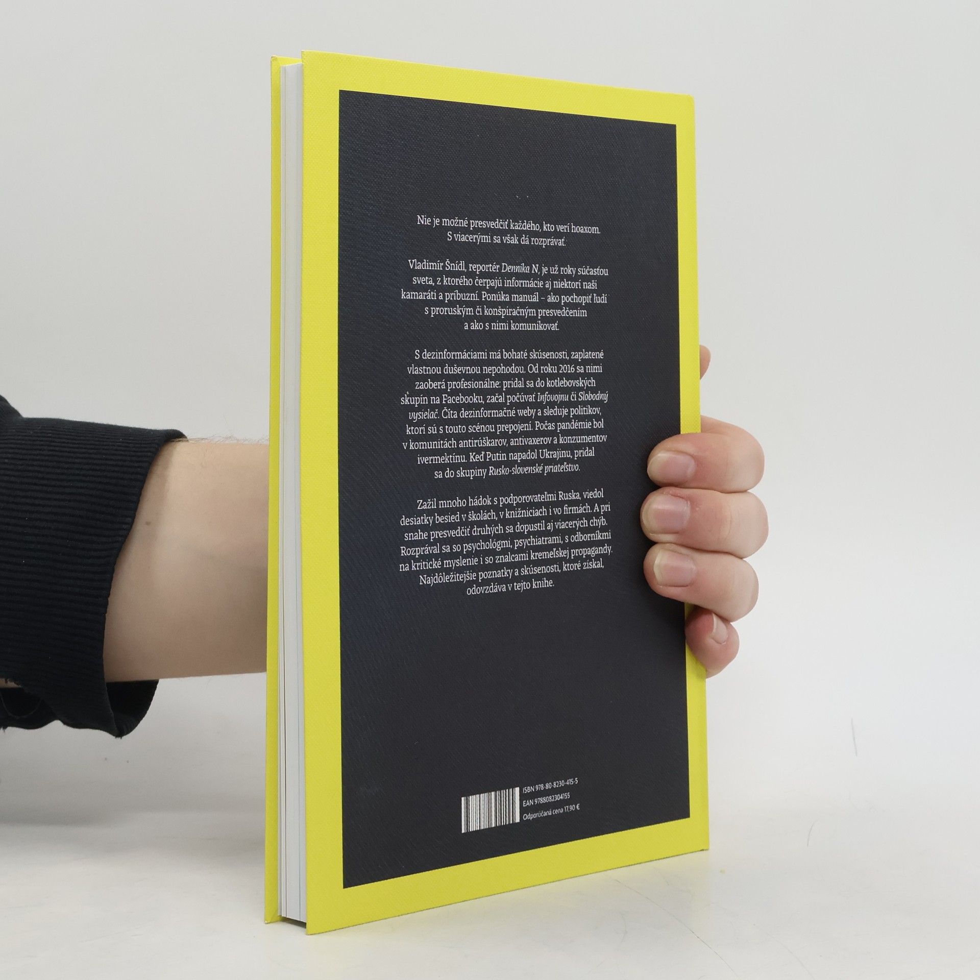 Nie je možné presvedčiť každého, kto verí hoaxom. S viacerými sa však dá rozprávať. Vladimír Šnídl, reportér Denníka N, je už roky súčasťou sveta, z ktorého čerpajú informácie aj niektorí naši kamaráti a príbuzní. Ponúka manuál – ako pochopiť ľudí s proruským či konšpiračným presvedčením a ako s nimi komunikovať. S dezinformáciami má bohaté skúsenosti, zaplatené vlastnou duševnou nepohodou. Od roku 2016 sa nimi zaoberá profesionálne: pridal sa do kotlebovských skupín na Facebooku, začal počúvať Infovojnu či Slobodný vysielač. Číta dezinformačné weby a sleduje politikov, ktorí sú s touto scénou prepojení. Počas pandémie bol v komunitách antirúškarov, antivaxerov a konzumentov ivermektínu. Keď Putin napadol Ukrajinu, pridal sa do skupiny Rusko-slovenské priateľstvo. Zažil mnoho hádok s podporovateľmi Ruska, viedol desiatky besied v školách, v knižniciach i vo firmách. A pri snahe presvedčiť druhých sa dopustil aj viacerých chýb. Rozprával sa so psychológmi, psychiatrami, s odborníkmi na kritické myslenie i so znalcami kremeľskej propagandy. Najdôležitejšie poznatky a skúsenosti, ktoré získal, odovzdáva v tejto knihe.