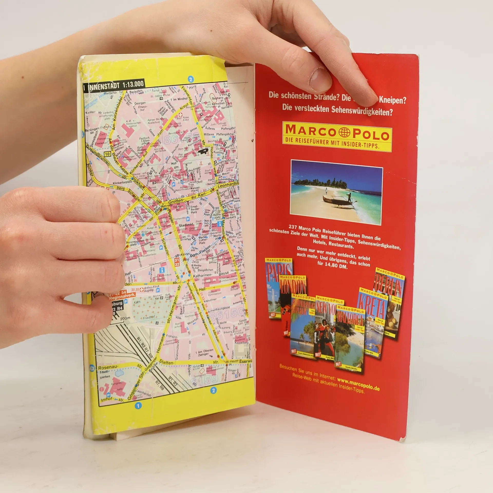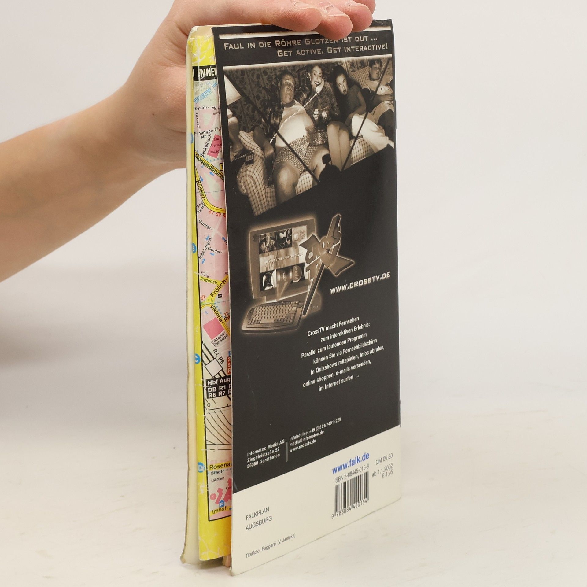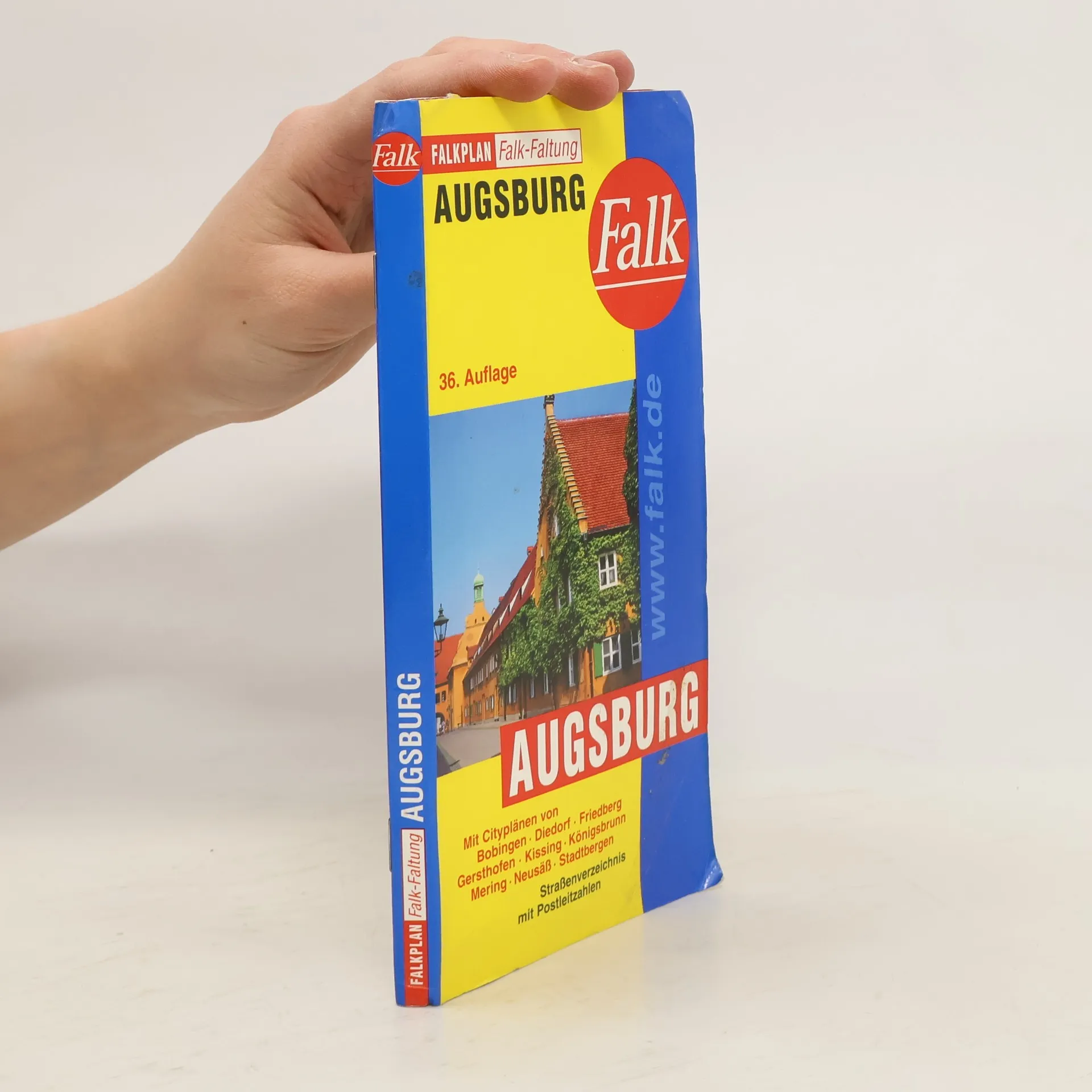 Hauptkarte 1:20 000 mit mehrsprachiger Legende (D, GB, F) Ausklappkarten: - Cityplan Augsburg 1:10 000 - Durchfahrtsplan Im Registerheft: - Nebenkarte Augsburg-Waldhaus 1:20 000 - AVV Tarifzonenplan - Karte der Postzustellbezirke - Straßenverzeichnis mit Postleitzahlen und Suchfeldangaben - Daten und Fakten