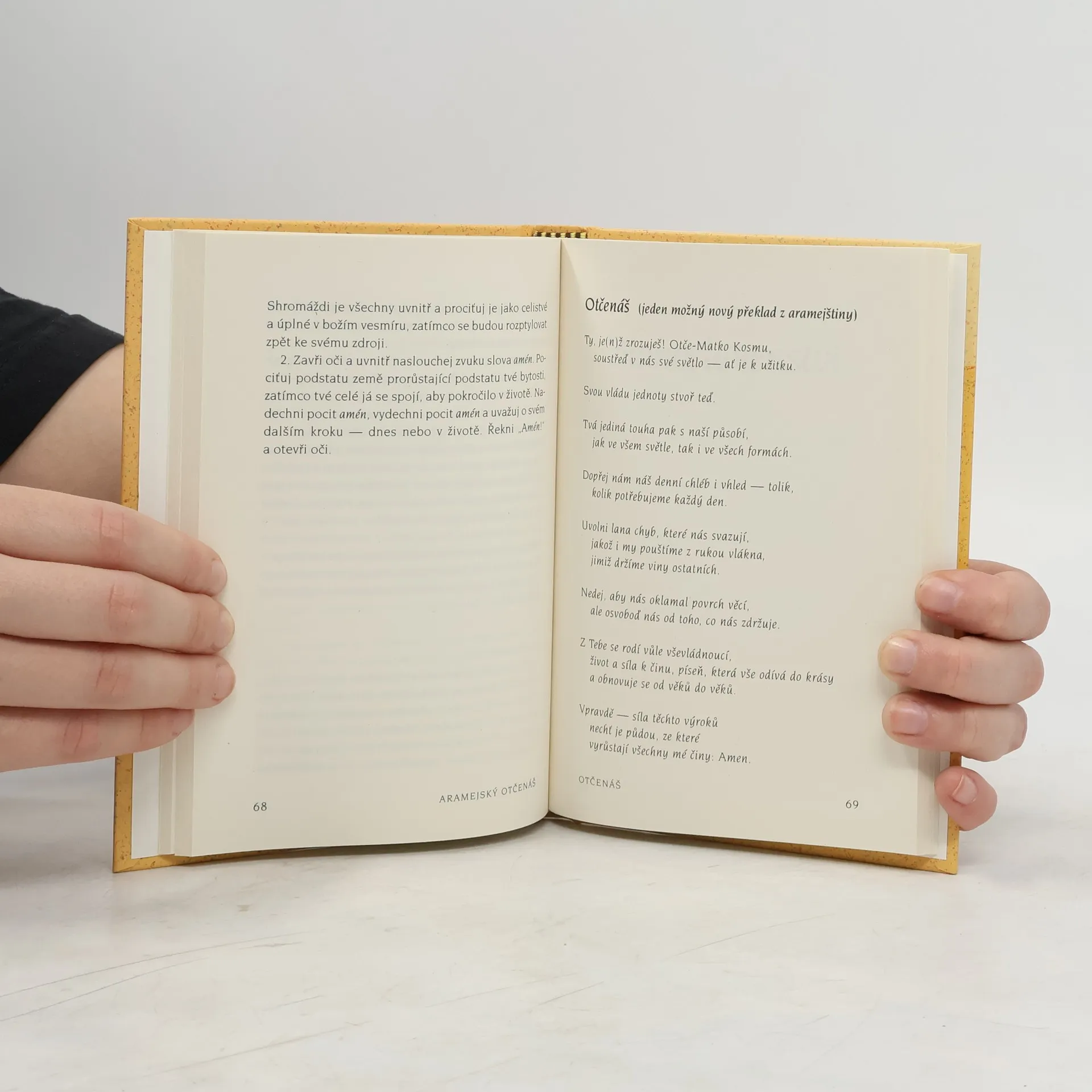Duchovní tradice Blízkého východu poukazují na to, že na každou větu svatých učení je třeba nahlížet alespoň ze tří hledisek: intelektuálního, metaforického a universálního (nebo mystického). Z prvního zvažujeme vnější, doslovný význam, z druhého zkoumáme, jakým způsobem se nám příběh může stát podobenstvím pro náš život nebo život společnosti. Z třetího dospíváme k prožití pravdy, na niž zkoumaná věta Písma míří. Tady musíme jít až za slovní pochopení a obsáhnout i bezeslovnou zkušenost, na kterou živá slova mystiků ukazují. Pro mystika z Blízkého východu, jako byl Ježíš, se tato hlediska navzájem nevylučují. Je proto dobré mít na paměti všechny možné významy posvátných slov modliteb a nechat je na sebe působit. Podle Fabre d’Oliveta spočívá tragédie moderních překladů bible přes řečtinu, jazyk zcela odlišný od hebrejštiny a aramejštiny Ježíšova původního jazyka, v důsledném okleštění mnoha významových rovin jednotlivých výroků pouze na materiální a zcela konkrétní pojmy. Na rozdíl od řečtiny nemá aramejština žádnou ostrou dělící čáru mezi prostředkem a účelem, mezi vnitřní kvalitou a vnějším jednáním. Svévolné hranice mezi „rozumem“, „tělem“ a „duchem“ zde vůbec nejsou přítomny. Nepřirozené vzájemné odloučení Boha, přírody a člověka, neznámé lidem, kteří žili svázáni se zemí, se vplížilo i do našeho jazyka. Ve srovnání s řečtinou a našimi moderními jazyky skýtá aramejština plynoucí a celostní vizi kosmu. Překlad Otčenáše, Blahoslavení a tří dalších Ježíšových výroků z evangelií z aramejštiny, původního Ježíšova jazyka, pořídil Neil Douglas-Klotz. Originální aramejský text, komentáře a modlitby těla. Předmluva Matthew Fox.