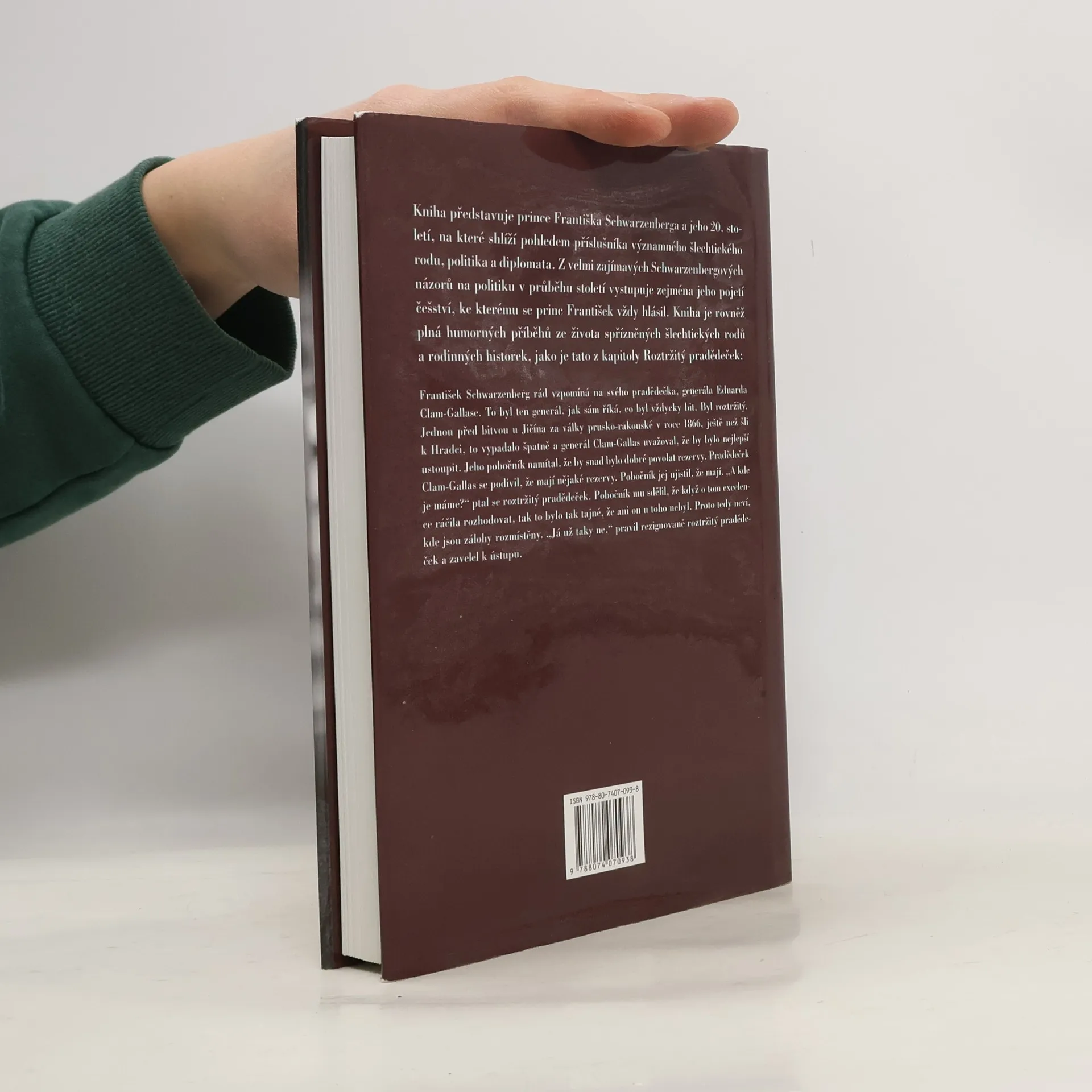 Kniha představuje prince Františka Schwarzenberga a jeho 20. století, na které shlíží pohledem příslušníka významného šlechtického rodu, politika a diplomata. Z velmi zajímavých Schwarzenbergových názorů na politiku v průběhu století vystupuje zejména jeho pojetí češství, ke kterému se princ František vždy hlásil. Kniha je rovněž plná humorných příběhů ze života spřízněných šlechtických rodů a rodinných historek, jako je tato z kapitoly Roztržitý pradědeček: František Schwarzenberg rád vzpomíná na svého pradědečka, generála Eduarda Clam-Gallase. To byl ten generál, jak sám říká, co byl vždycky bit. Byl roztržitý. Jednou před bitvou u Jičína za války prusko-rakouské v roce 1866, ještě než šli k Hradci, to vypadalo špatně a generál Clam-Gallas uvažoval, že by bylo nejlepší ustoupit. Jeho pobočník namítal, že by snad bylo dobré povolat rezervy. Pradědeček Clam-Gallas se podivil, že mají nějaké rezervy. Pobočník jej ujistil, že mají. „A kde je máme?“ ptal se roztržitý pradědeček. Pobočník mu sdělil, že když o tom excelence ráčila rozhodovat, tak to bylo tak tajné, že ani on u toho nebyl. Proto tedy neví, kde jsou zálohy rozmístěny. „Já už taky ne,“ pravil rezignovaně roztržitý pradědeček a zavelel k ústupu.