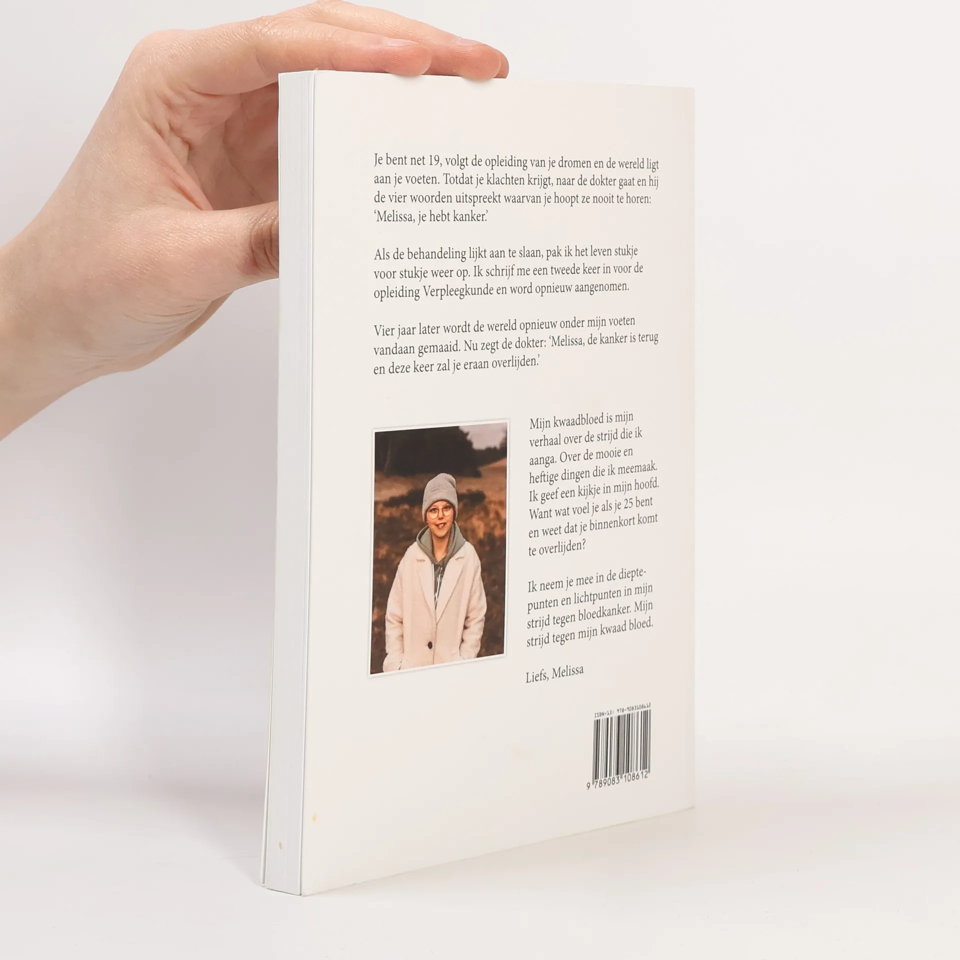 ‘Melissa Kremer (25) kreeg in 2015 de diagnose leukemie. Ze was daarna een aantal jaar kankervrij, maar in maart 2020 kwam de leukemie terug. Dit keer was er geen genezing meer mogelijk. Ondanks dit onverdraaglijke lot, bleef Melissa altijd zoeken naar lichtpuntjes in haar leven. Schrijven werd haar passie en inmiddels worden haar blogs, verhalen en gedichten gelezen door meer dan 210.000 volgers op Instagram. ‘Mijn kwaadbloed’ is het indringende, ontroerende en inspirerende verhaal van een doorzetter pur sang.’