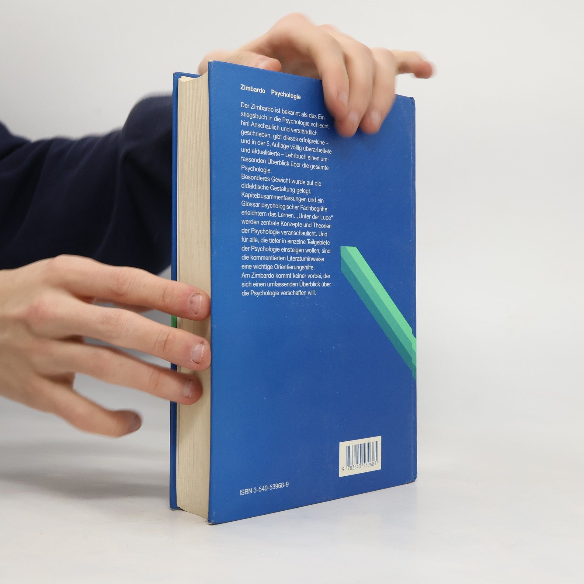 V***VERKAUFSKATEGORIE*** 2 d Der Zimbardo ist bekannt als das Einstiegsbuch in die Psychologie schlechthin! Anschaulich und verst ndlich geschrieben, gibt dieses erfolgreiche - und in der 5. Auflage v llig berarbeitete und aktualisierte - Lehrbuch einen umfassenden berblick ber die gesamte Psychologie. Besonderes Gewicht wurde auf die didaktische Gestaltung gelegt. Kapitelzusammenfassungen und ein Glossar psychologischer Fachbegriffe erleichtern das Lernen. "Unter der Lupe" werden zentrale Konzepte und Theorien der Psychologie veranschaulicht. Und f r alle, die tiefer in einzelne Teilgebiete der Psychologie einsteigen wollen, sind die kommentierten Literaturhinweise eine wichtige Orientierungshilfe. Am Zimbardo kommt keiner vorbei, der sich einen umfassenden berblick ber die Psychologie verschaffen will.