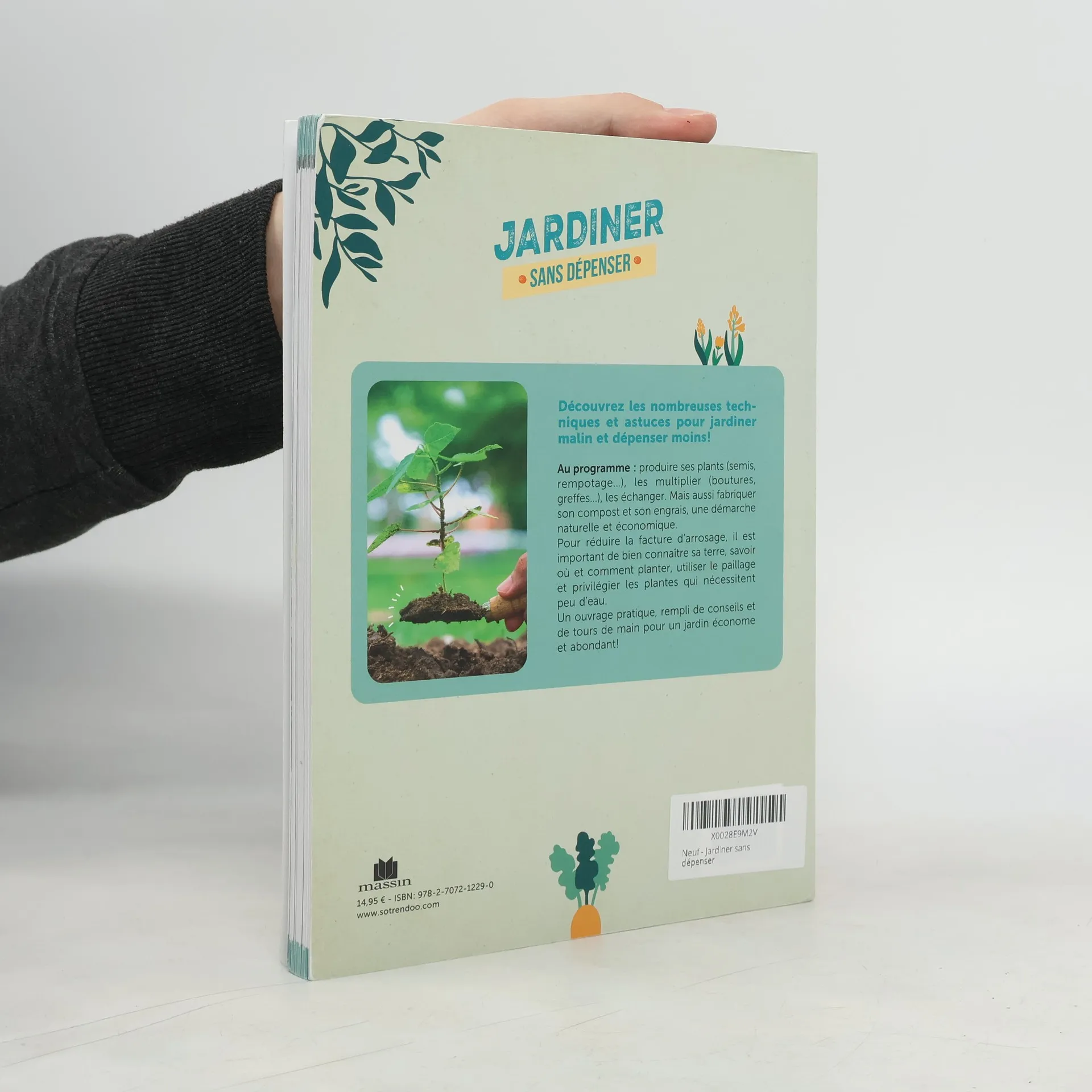 Jardiner . Sans dépenser . Découvrez les nombreuses techniques et astuces pour jardiner malin et dépenser moins ! . Au programme : produire ses plants (semis, rempotage...), les multiplier (boutures, greffes...), les échanger. Mais aussi fabriquer son compost et son engrais, une démarche naturelle et économique.. Pour réduire la facture d'arrosage, il est important de bien connaître sa terre, savoir où et comment planter, utiliser le paillage et privilégier les plantes qui nécessitent peu d'eau.. Un ouvrage pratique, rempli de conseils et de tours de main pour un jardin économe et abondant !.