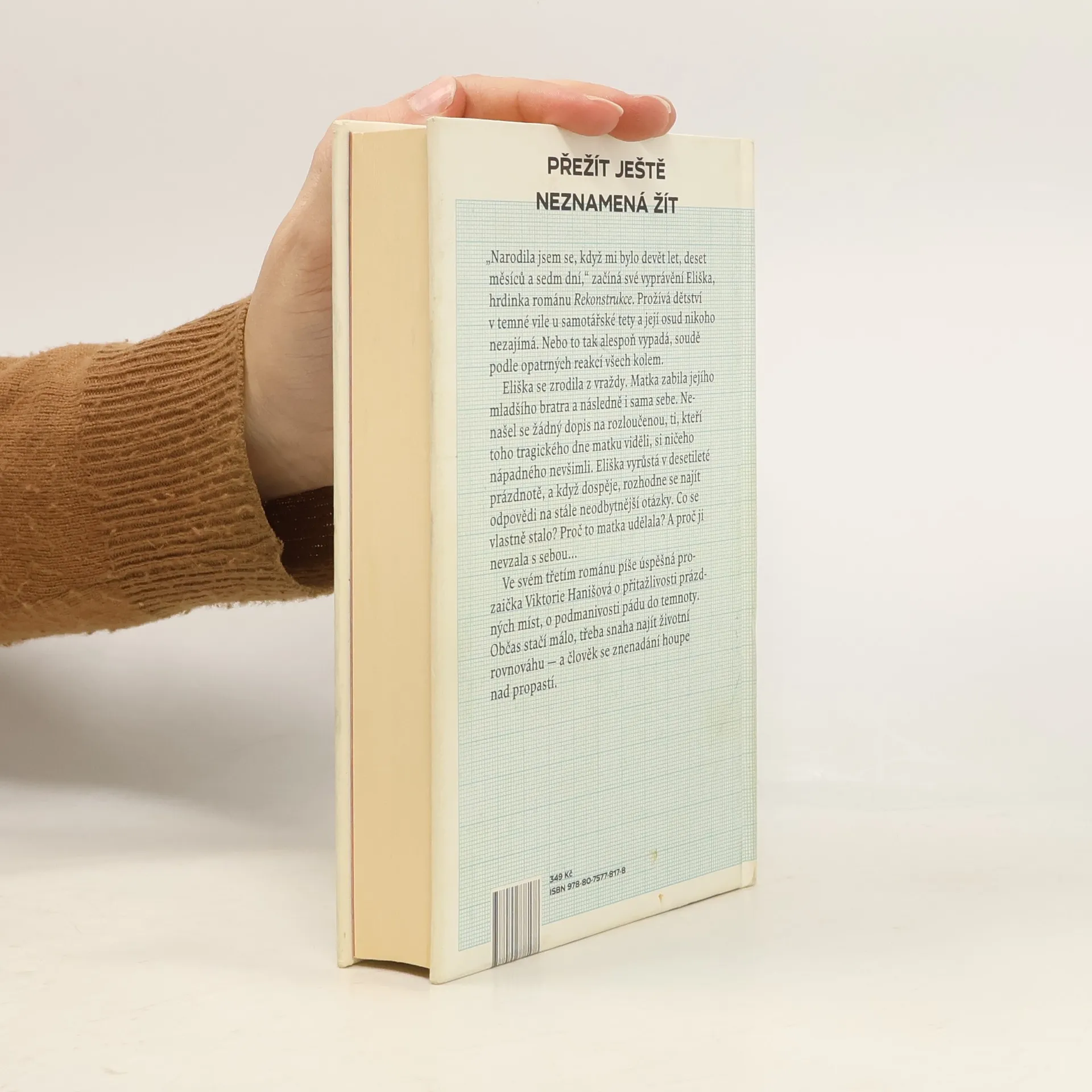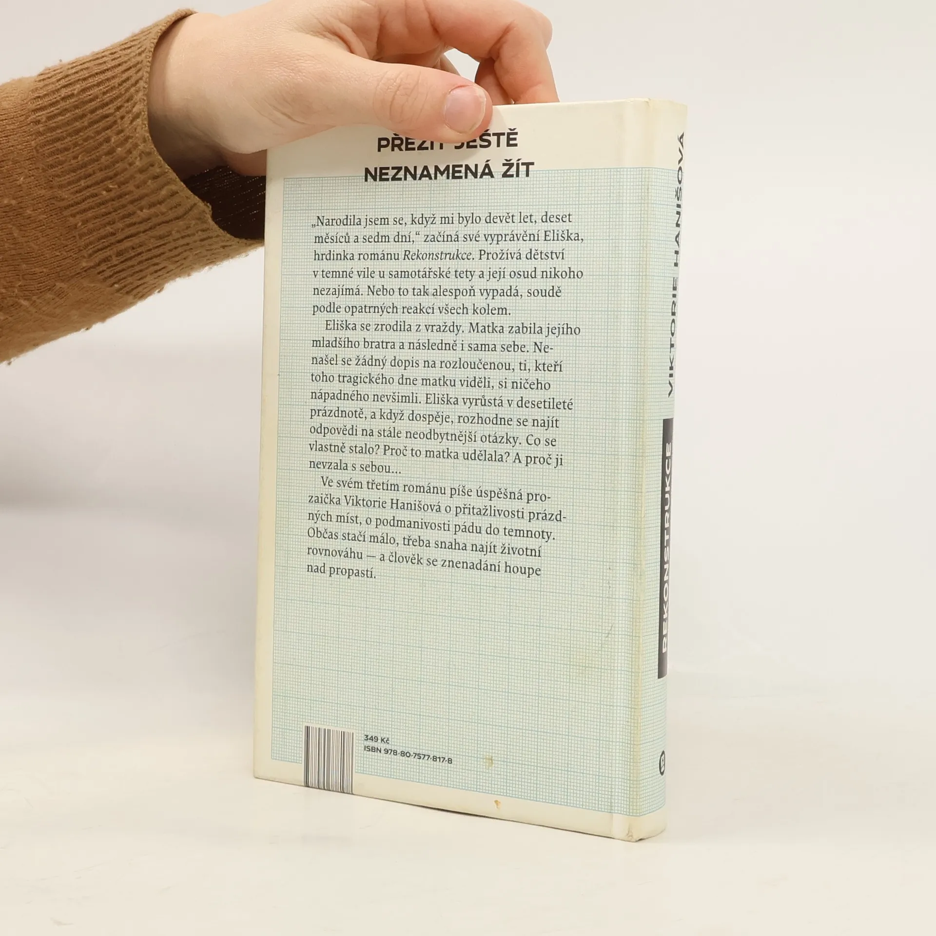 Přežít ještě neznamená žít „Narodila jsem se, když mi bylo devět let, deset měsíců a sedm dní,“ začíná své vyprávění Eliška, hrdinka románu Rekonstrukce. Eliška nyní přebývá v tichém domě své zapšklé tety a její život nikoho nezajímá. Nebo to tak alespoň vypadá, soudě podle opatrných reakcí všech okolo. Eliška se zrodila z vraždy. Matka zabila jejího mladšího bratra a následně i sama sebe. Do té doby přitom vedli průměrný život, v němž nic nenasvědčovalo nadcházející tragické události. Nenašel se ani žádný dopis na rozloučenou, svědkové posledního dne zamlklé matky s dítětem si pořádně ničeho nevšimli. Eliška proto vyrůstá s desetiletou prázdnotou místo dětství, kterou se v dospělosti rozhodne objasnit. Proč to matka udělala? A proč ji nevzala s sebou… V pořadí třetí román úspěšné prozaičky Viktorie Hanišové je o přitažlivosti prázdných míst, o podmanivosti pádu do temnoty. Občas stačí málo, třeba snaha najít životní rovnováhu — a člověk se znenadání kýve nad propastí.