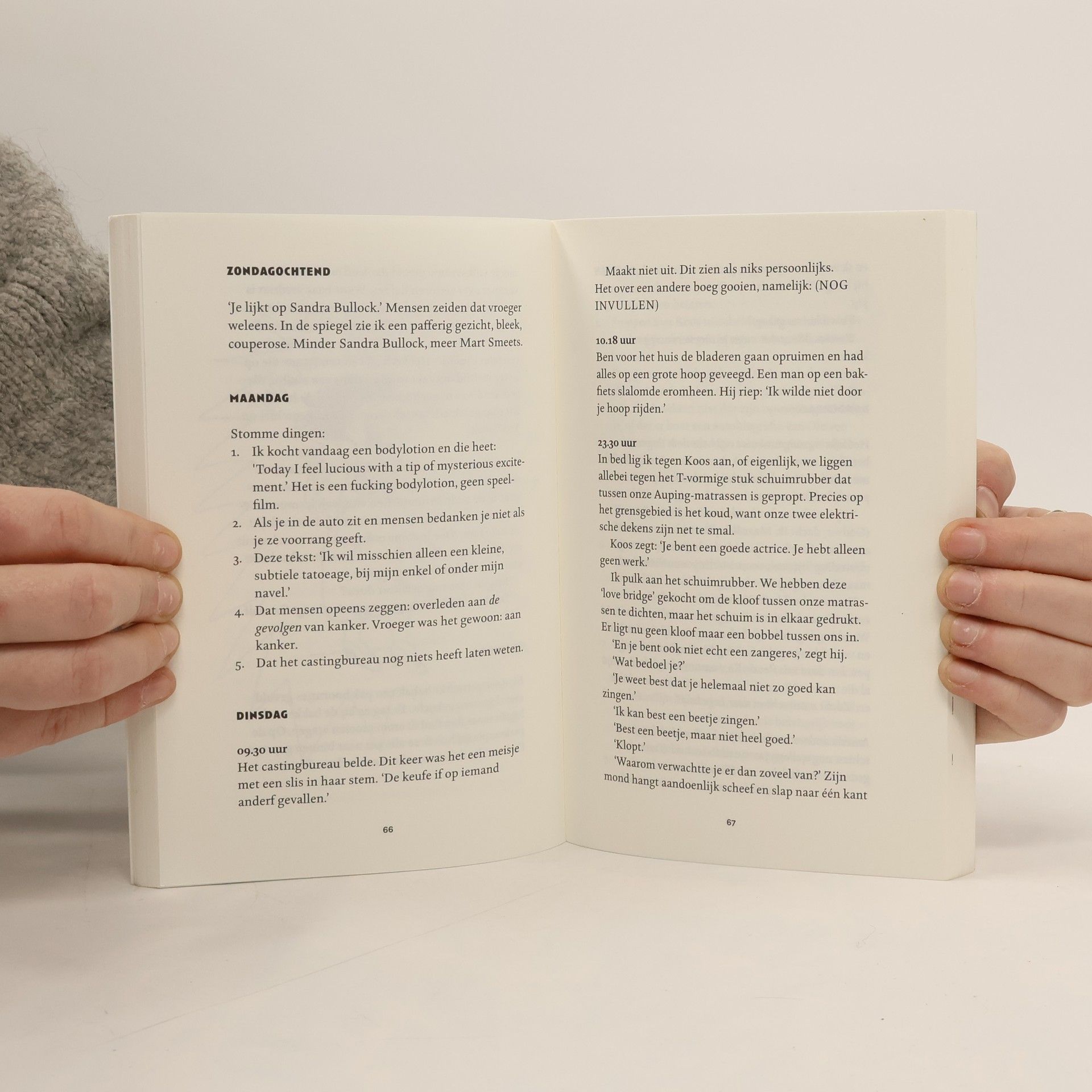 In haar nietsverhullende dagboek registreert de werkloze actrice M. het kleine en grote verval in haar leven. Haar puberzoon Ole dreigt het nest te verlaten en sex met echtgenoot Koos is tegenwoordig iets wat af en toe moet gebeuren. ‘Het is net als een halfjaarlijkse controle bij de tandarts, alleen dan minder vaak.’ Ondertussen verlangt ze vurig naar een glansrol. Ze wil zichzelf – en bovenal haar zoon – bewijzen dat er nog toekomst in haar zit.