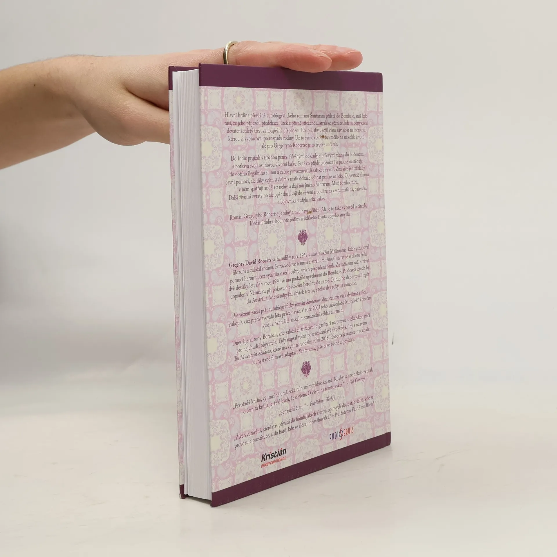 Hlavní hrdina převážně autobiografického románu Šantaram přilétá do Bombaje, aniž kdo tuší, že jeho příjezdu předcházel útěk z přísně střežené australské věznice, kde si odpykával devatenáctiletý trest za loupežná přepadení. Loupil, aby ukojil svou závislost na heroinu, kterou si vypracoval po rozpadu rodiny. V Bombaji získává přátele, kteří mu pomohou zorientovat se v tamějším životě, ale další životní zvraty ho opět dostávají do vězení a posléze na cestu mafiána, pašeráka i bojovníka v afghánské válce. Román Šantaram je silný a napínavý příběh. Ale je to také výpověď o citech, hledání dobra, hodnotě rodiny a lidského života i jeho smyslu. Kniha je také označována jako „novodobý Motýlek“ a po vydání okamžitě získala mezinárodní věhlas a uznání. Filmová práva vlastní Johny Depp, v roce 2016 je očekávána premiéra filmu. Gregory David Roberts, který v románu popsal své vlastní zážitky, dnes žije v Bombaji, kde založil charitativní organizaci zajišťující lékařskou péči pro nejchudší obyvatele. Tady napsal i volné pokračování své úspěšné knihy s názvem The Mountain Shadow, která má vyjít letos na podzim. Kniha, jež právě vychází v češtině, je kvůli čtenářskému komfortu rozdělená do tří samostatných oddílů, ale speciální obal z ní činí jeden celek se společným hřbetem.