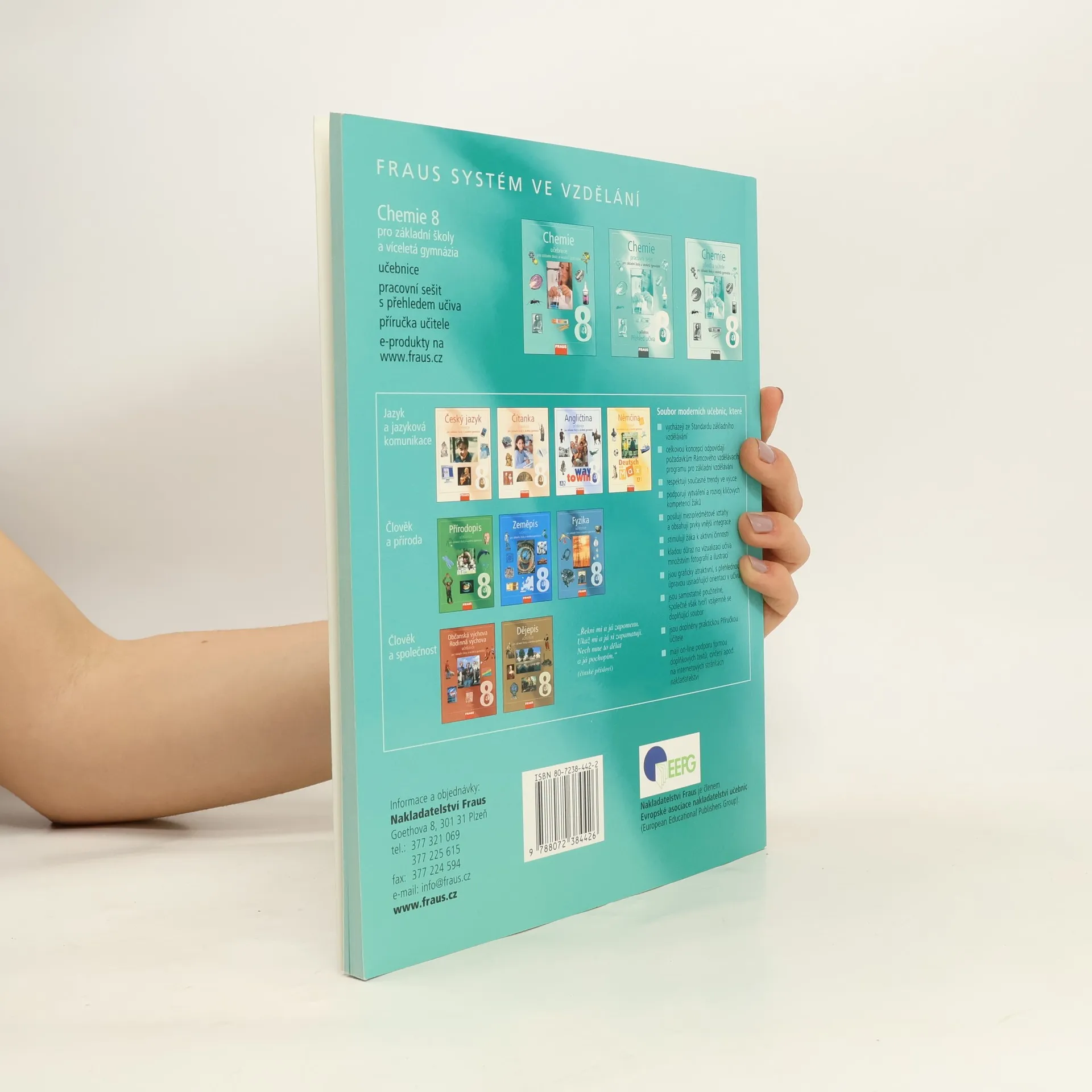 Učebnice pro 8. ročník/tercii zahrnuje následující tematické celky: Vlastnosti látek; Částicové složení látek; Vzduch, kyslík, vodík; Voda - formou projektu; Halogeny; Kyseliny a zásady; Uhlík a uhlovodíky; Ropa - formou projektu; Křemík a jeho sloučeniny; Polokovy, kovy; Halogenidy; Oxidy, sulfidy; Deriváty uhlovodíků; Soli.