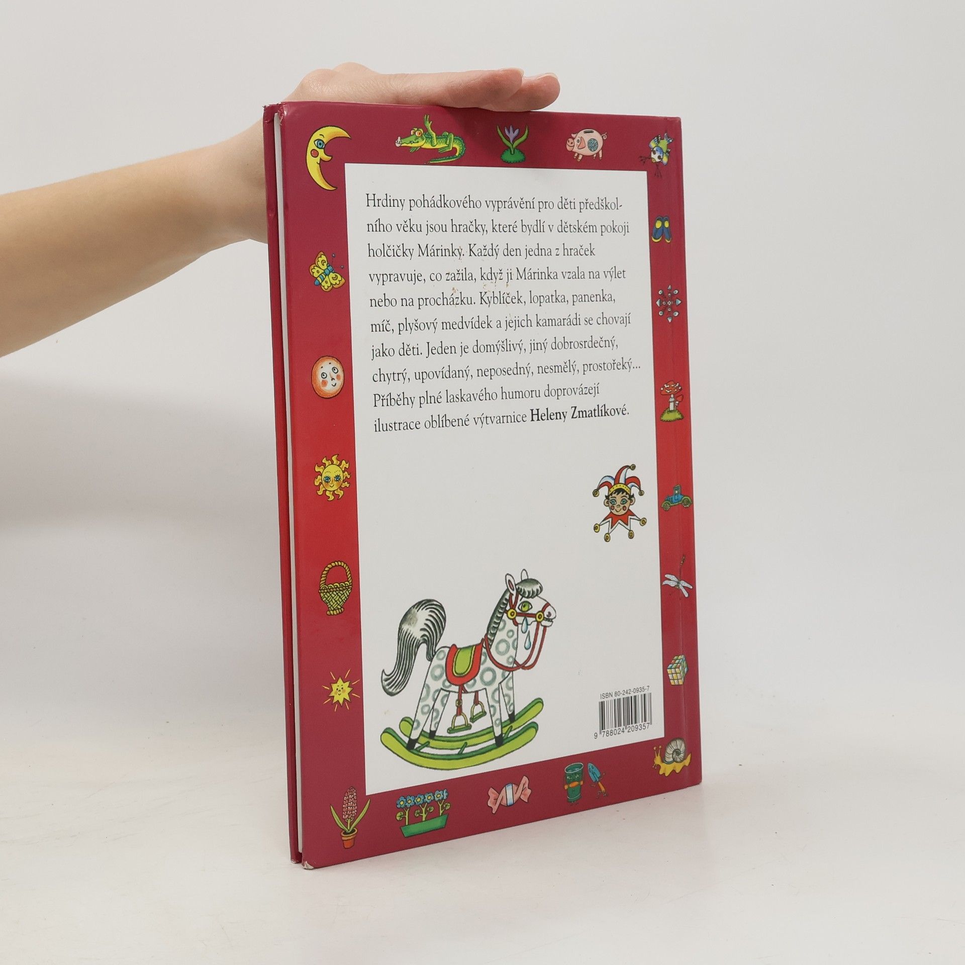 Ilustrovala Helena Zmatlíková Ze slovenštiny přeložila Alena Peisertová Hrdiny pohádkového vyprávění pro děti předškolního věku jsou hračky, které bydlí v dětském pokoji holčičky Márinky. Každý den jedna z hraček vypravuje, co zažila, když ji Márinka vzala na výlet nebo na procházku. Kyblíček, lopatka, panenka, míč, plyšový medvídek a jejich kamarádi se chovají jako děti. Jeden je domýšlivý, jiný dobrosrdečný, chytrý, upovídaný, neposedný, nesmělý, prostořeký… Příběhy plné laskavého humoru doprovázejí ilustrace oblíbené výtvarnice Heleny Zmatlíkové.