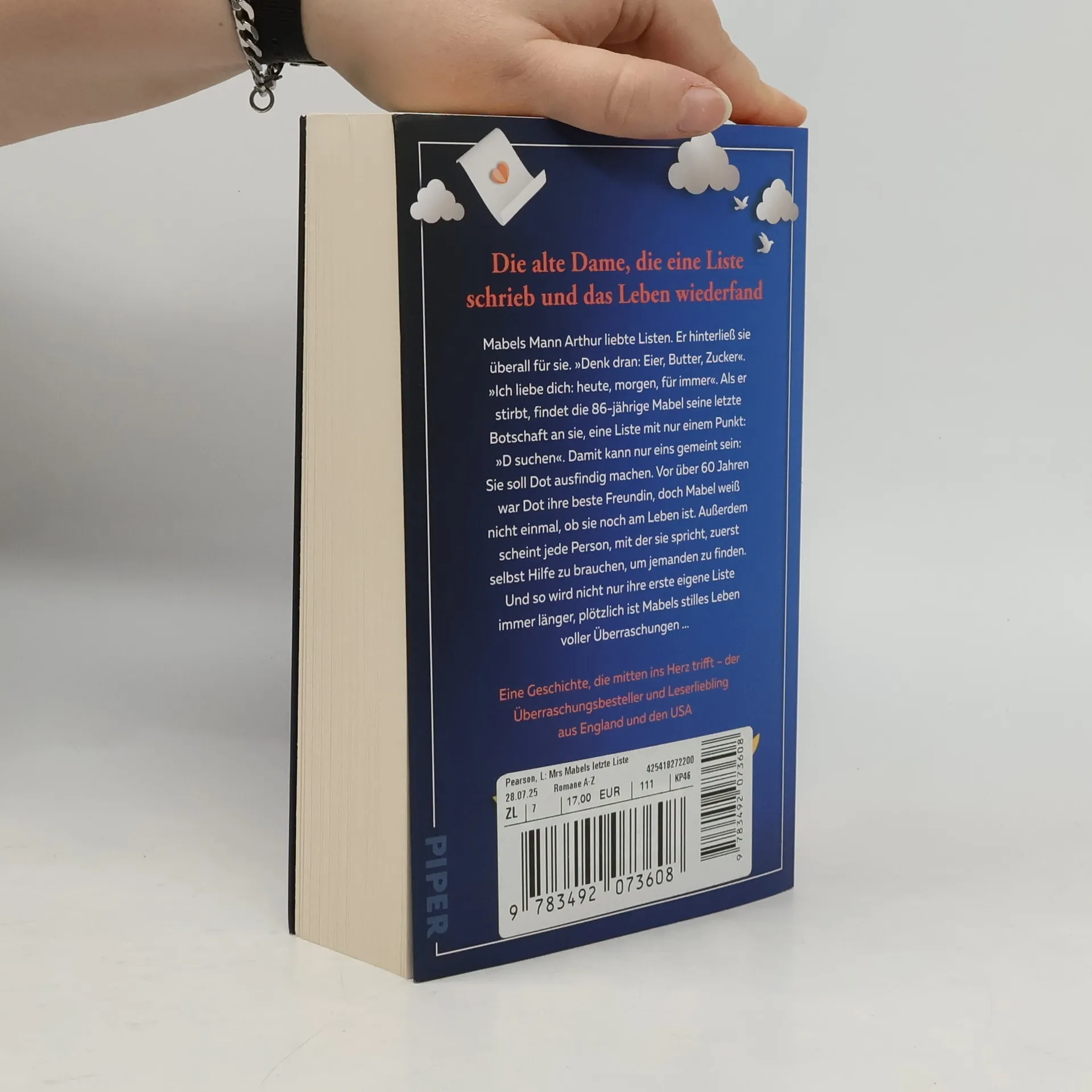 Die alte Dame, die eine Liste schrieb und das Leben und die Liebe wiederfand – der Überraschungsbestseller aus England und den USA Mabels Mann Arthur liebte Listen. Er hinterließ sie überall für sie. »Denk dran: Eier, Butter, Zucker«. »Ich liebe dich: heute, morgen, immer«. Aber jetzt ist Arthur nicht mehr da. Er ist gestorben, wie er gelebt hat: sanft, behutsam, ohne viel Aufhebens zu machen. Aber er hat ihr trotzdem eine Liste hinterlassen. Auf dieser steht allerdings nur ein Punkt: »D suchen«. Mabel, 86 Jahre alt, ist sich sicher, dass sie weiß, was das bedeutet: Sie muss ihre beste Freundin Dot ausfindig machen, die sie seit dem schicksalhaften Tag, an dem sie vor mehr als sechzig Jahren fortging, nicht mehr gesehen hat. Doch wie soll ihr das gelingen? Mabel weiß nicht einmal, ob Dot noch am Leben ist. Außerdem scheint jede Person, mit der sie spricht, zuerst selbst Hilfe zu brauchen mit vermissten Ehemännern, Töchtern, Eltern. Plötzlich ist Mabels seit Jahren stiller und fast eintöniger Alltag voller Leben, und ihre erste eigene Liste wird immer länger. Was sie nicht weiß, ist, dass es auf dieser Liste längst nicht mehr nur darum geht, ihre alte Freundin Dot zu finden. Stellt Mabel sich endlich den Geheimnissen ihrer Vergangenheit, findet sie vielleicht sogar ihr Glück wieder ... Eine ergreifender und warmherziger Roman über Wahrheit, Liebe und Beziehung und davon, dass es nie zu spät ist, seinem Herzen zu folgen. »Diese Geschichte über Freundschaft, Liebe, Verlust und zweite Chancen hat mein Herz erobert. Ich bewundere Mabel und ihre unwahrscheinliche Bande von bunten Charakteren zutiefst.« Lisa Timoney »Zärtlich und wunderschön. Ebenso hoffnungsvoll wie herzzerreißend ... Ich habe es geliebt.« Amy Beashel »Mabel ist ein absoluter Schatz! Laura Pearson schält geschickt und behutsam die Schichten ihres Leben und dem ihrer Freunde auf eine Art und Weise ab, die das Herz erst schmerzt und dann besänftigt ... Ein erhebender, lebensbejahender Roman.« Emma Robinson Für Fans von »Ein Mann namens Ove« und »Der späte Ruhm der Mrs. Quinn« ein Muss! Zehntausende Leserinnen und Leser in England, den USA und Australien haben »Mrs Mabels letzte Liste« geliebt und begeisterte Rezensionen geschrieben -– endlich auch auf Deutsch!