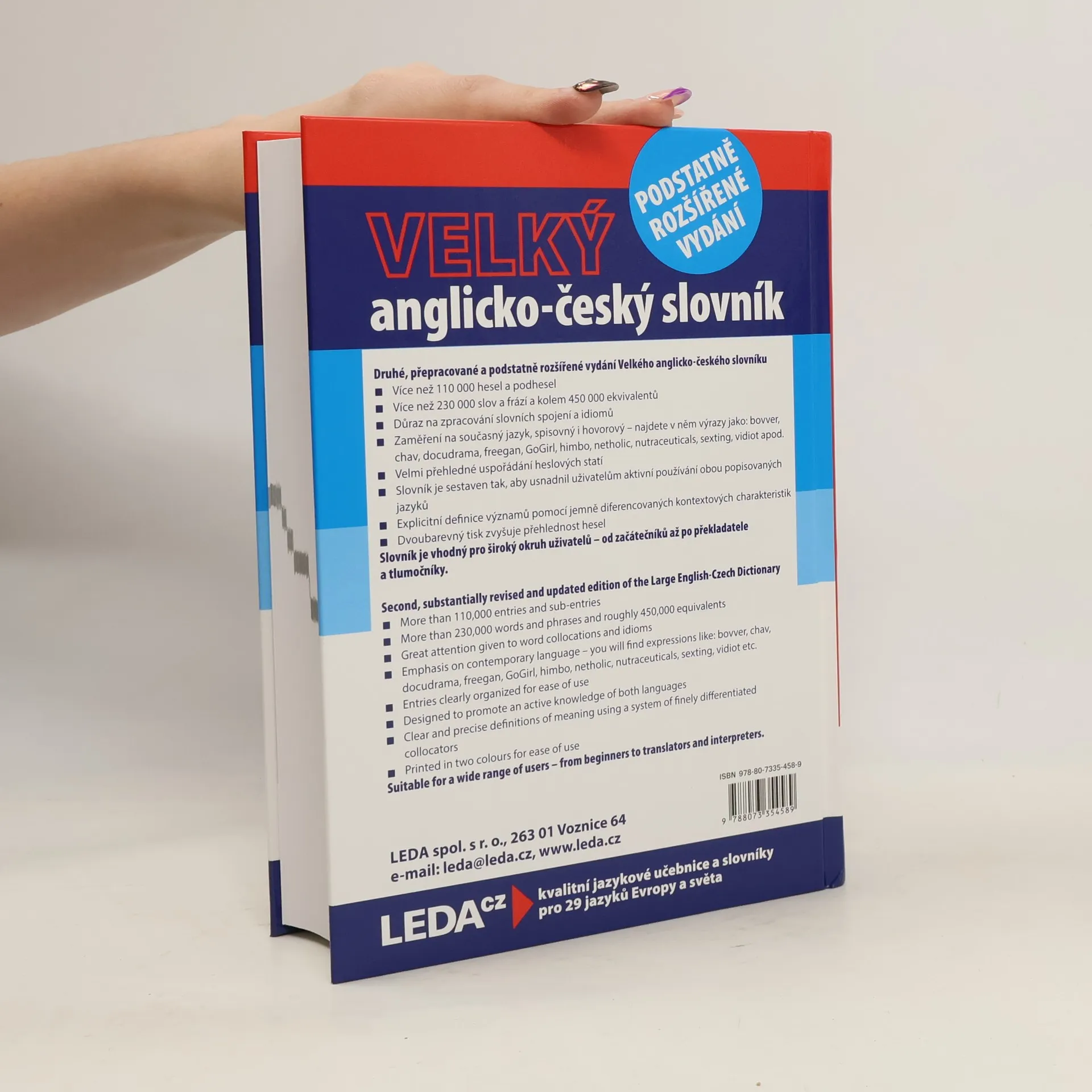 Druhé, přepracované a podstatně rozšířené vydání Velkého anglicko–českého slovníku. Více než 110.000 hesel a podhesel. Více než 230.000 slov a frází a kolem 450.000 ekvivalentů. Důraz na zpracování slovních spojení a idiomů. Zaměření na současný jazyk, spisovný i hovorový - najdete v něm výrazy jako: bovver, chav, docudrama, freegan, GoGirl, himbo, netholic, nutraceuticals, sexting, vidiot ap. Velmi přehledné uspořádání heslových statí. Slovník je sestaven tak, aby usnadnil uživatelům aktivní používání obou popisovaných jazyků. Explicitní definice významů pomocí jemně diferencovaných kontextových charakteristik. Dvoubarevný tisk zvyšuje přehlednost hesel. Slovník je vhodný pro široký okruh uživatelů - od začátečníků až po překladatele a tlumočníky.