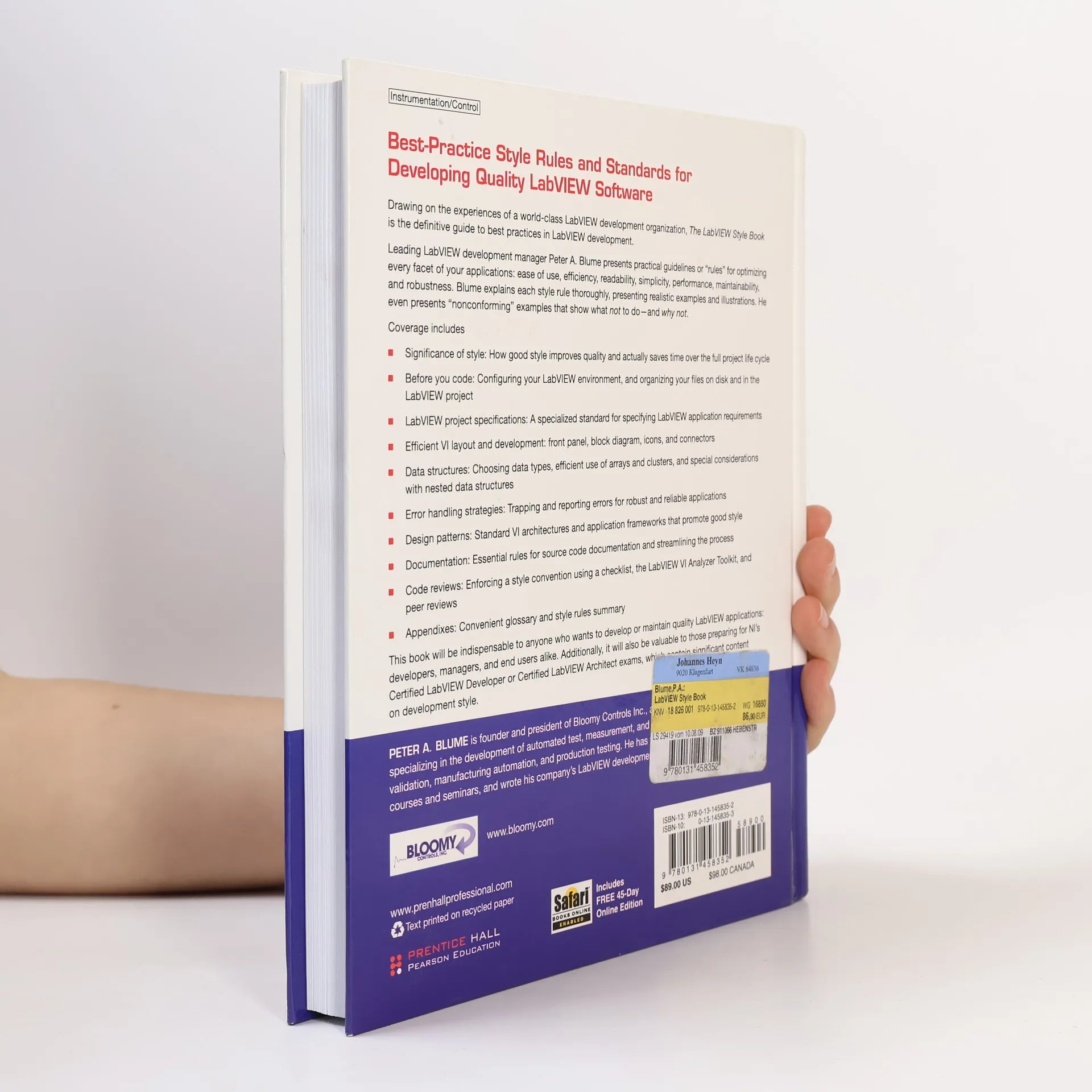 Drawing on the experiences of a world-class LabVIEW development organization, The LabVIEW Style Book is the definitive guide to best practices in LabVIEW development. Leading LabVIEW development manager Peter A. Blume presents practical guidelines or “rules” for optimizing every facet of your ease of use, efficiency, readability, simplicity, performance, maintainability, and robustness. Blume explains each style rule thoroughly, presenting realistic examples and illustrations. He even presents “nonconforming” examples that show what not to do—and why not . While the illustrations in the print book are in black and white, you can download full-color versions from the publisher web site for free. Coverage includes This book will be indispensable to anyone who wants to develop or maintain quality LabVIEW developers, managers, and end users alike. Additionally, it will also be valuable to those preparing for NI’s Certified LabVIEW Developer or Certified LabVIEW Architect exams, which contain significant content on development style. Foreword by Darren NattingerPrefaceAcknowledgmentsAbout the AuthorChapter 1 The Significance of StyleChapter 2 Prepare for Good StyleChapter 3 Front Panel StyleChapter 4 Block DiagramChapter 5 Icon and ConnectorChapter 6 Data StructuresChapter 7 Error HandlingChapter 8 Design PatternsChapter 9 DocumentationChapter 10 Code ReviewsAppendix A GlossaryAppendix B Style Rules SummaryIndex