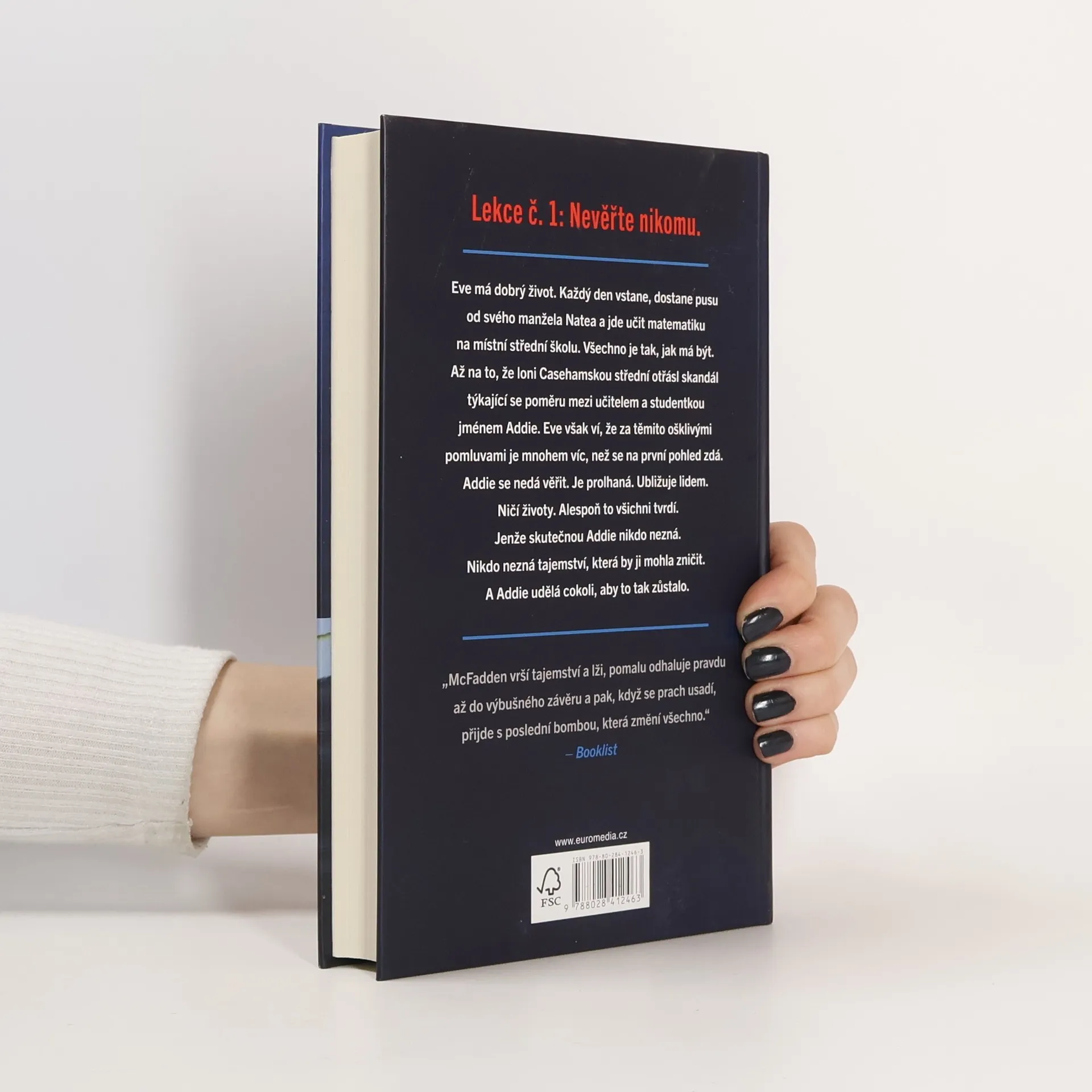 Eve má dobrý život. Každý den vstane, dostane pusu od svého manžela Natea a jde učit matematiku na místní střední školu. Všechno je tak, jak má být. Až na to, že loni casehamskou střední otřásl skandál týkající se poměru mezi učitelem a studentkou jménem Addie. Eve však ví, že za těmito ošklivými pomluvami je mnohem víc, než se na první pohled zdá. Addie se nedá věřit. Je prolhaná. Ubližuje lidem. Ničí životy. Alespoň to všichni tvrdí. Jenže skutečnou Addie nikdo nezná. Nikdo nezná tajemství, která by ji mohla zničit. A Addie udělá cokoli, aby to tak zůstalo.