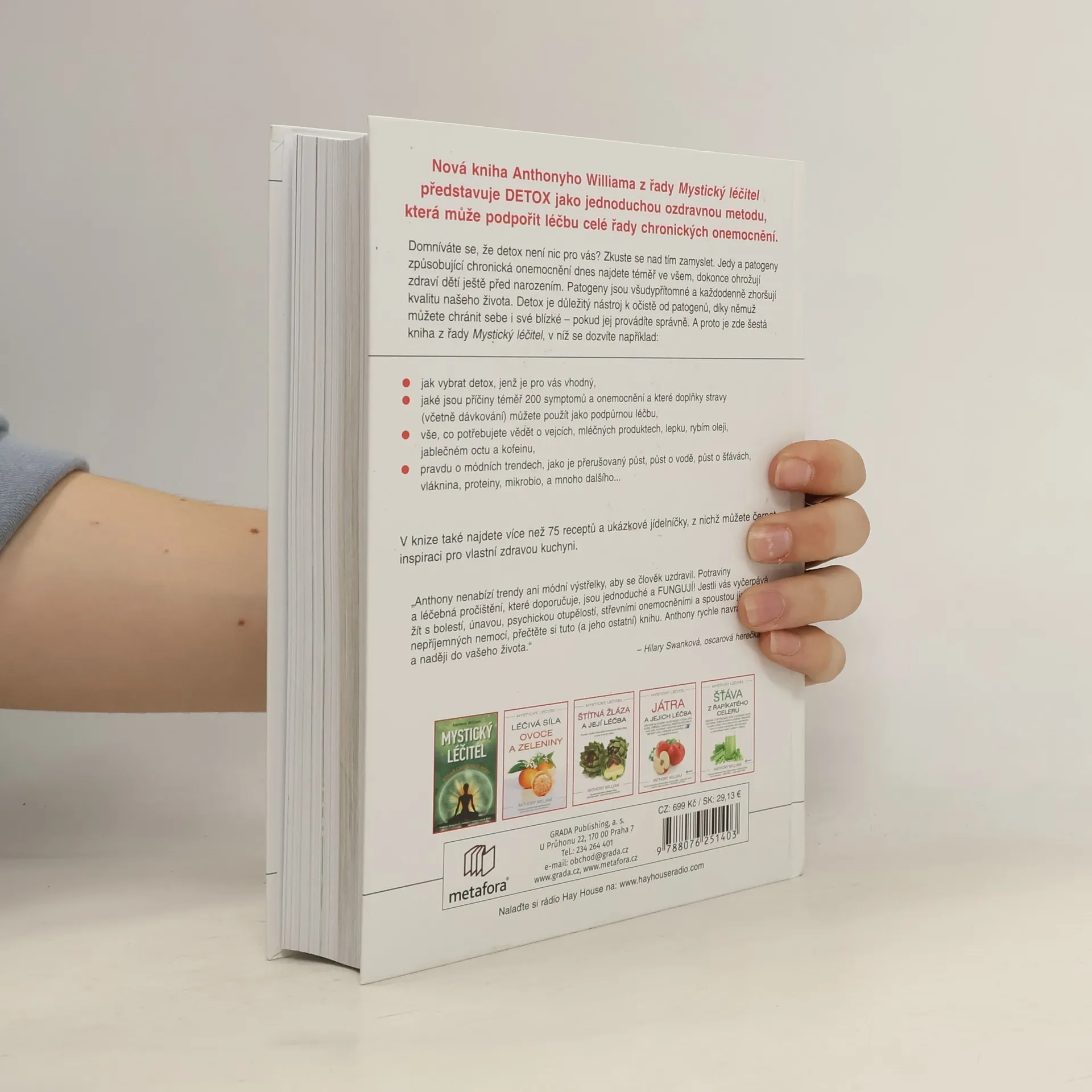 Nová kniha Anthonyho Williama z řady Mystický léčitel představuje DETOX jako jednoduchou ozdravnou metodu, která může podpořit léčbu celé řady chronických onemocnění. Domníváte se, že detox není nic pro vás? Zkuste se nad tím zamyslet. Jedy a patogeny způsobující chronická onemocnění dnes najdete téměř ve všem, dokonce ohrožují zdraví dětí ještě před narozením. Patogeny jsou všudypřítomné a každodenně zhoršují kvalitu našeho života. Detox je důležitý nástroj k očistě od patogenů, díky němuž můžete chránit sebe i své blízké – pokud jej provádíte správně. A proto je zde šestá kniha z řady Mystický léčitel, v níž se dozvíte například: jak vybrat postup, jenž je pro vás vhodný, jaké jsou příčiny téměř 200 symptomů a onemocnění a které doplňky stravy (včetně dávkování) můžete použít jako podpůrnou léčbu, vše, co potřebujete vědět o vejcích, mléčných produktech, lepku, rybím oleji, jablečném octu a kofeinu, pravdu o módních trendech, jako je přerušovaný půst, půst o vodě, půst o šťávách, vláknina, proteiny, mikrobiom a další V knize také najdete více než 75 receptů a ukázkové jídelníčky, z nich můžete čerpat inspiraci.