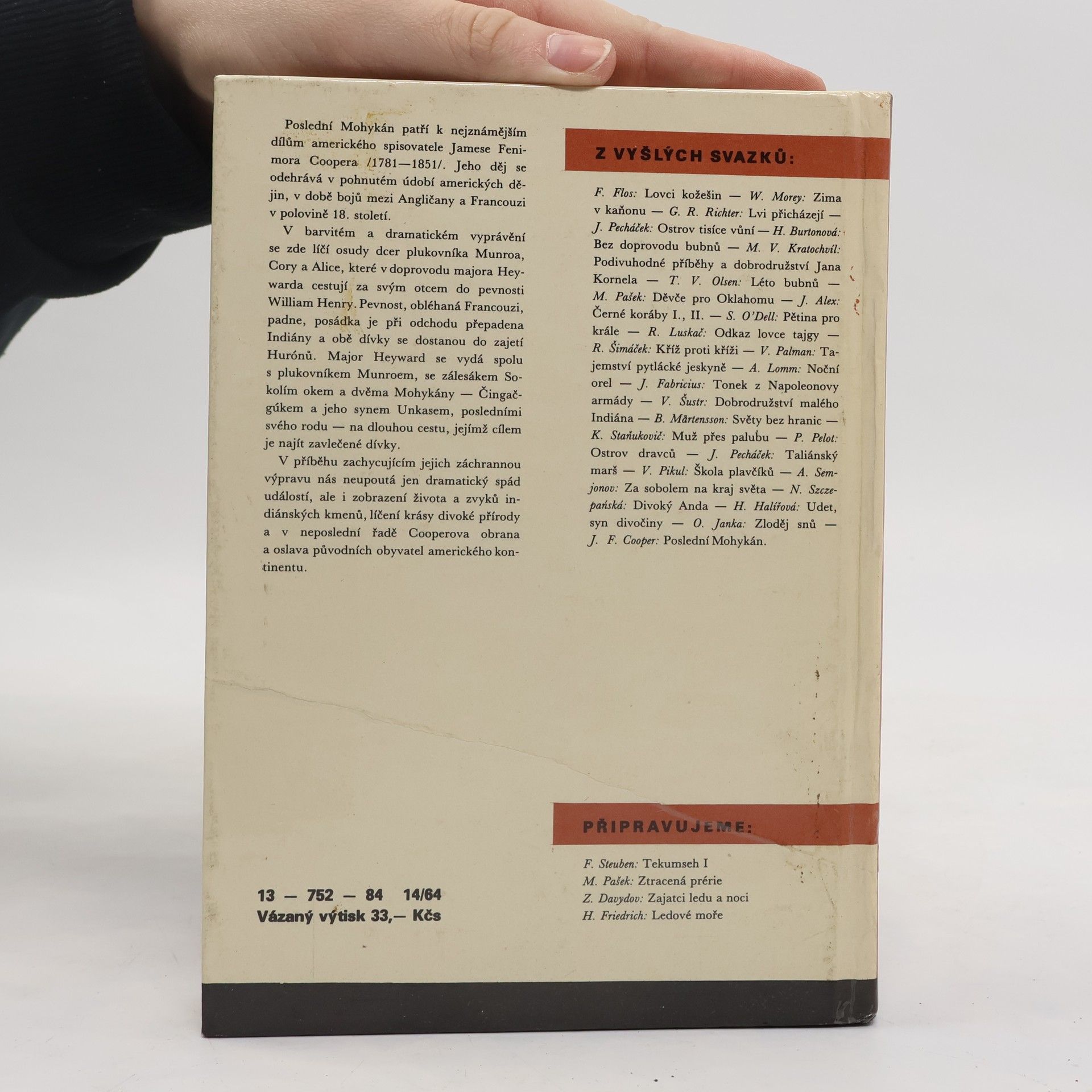 Poslední Mohykán, druhý, zcela samostatný díl slavné pentalogie o zálesákovi Kožené punčoše, se odehrává v době bojů mezi Anglií a Francií na americkém kontinentu. Cooper zde líčí osudy dcer plukovníka Munroa, které se snaží dostat za svým otcem do pevnosti William Henry. Stanou se všakzajatkyněmi Indiána Maguy. Po jejich stopách se vydají zálesák Sokolí oko a dva Mohykáni – Čingačgúk a jeho syn Unkas, poslední svého rodu, aby obě dívky zachránili. 13-752-84