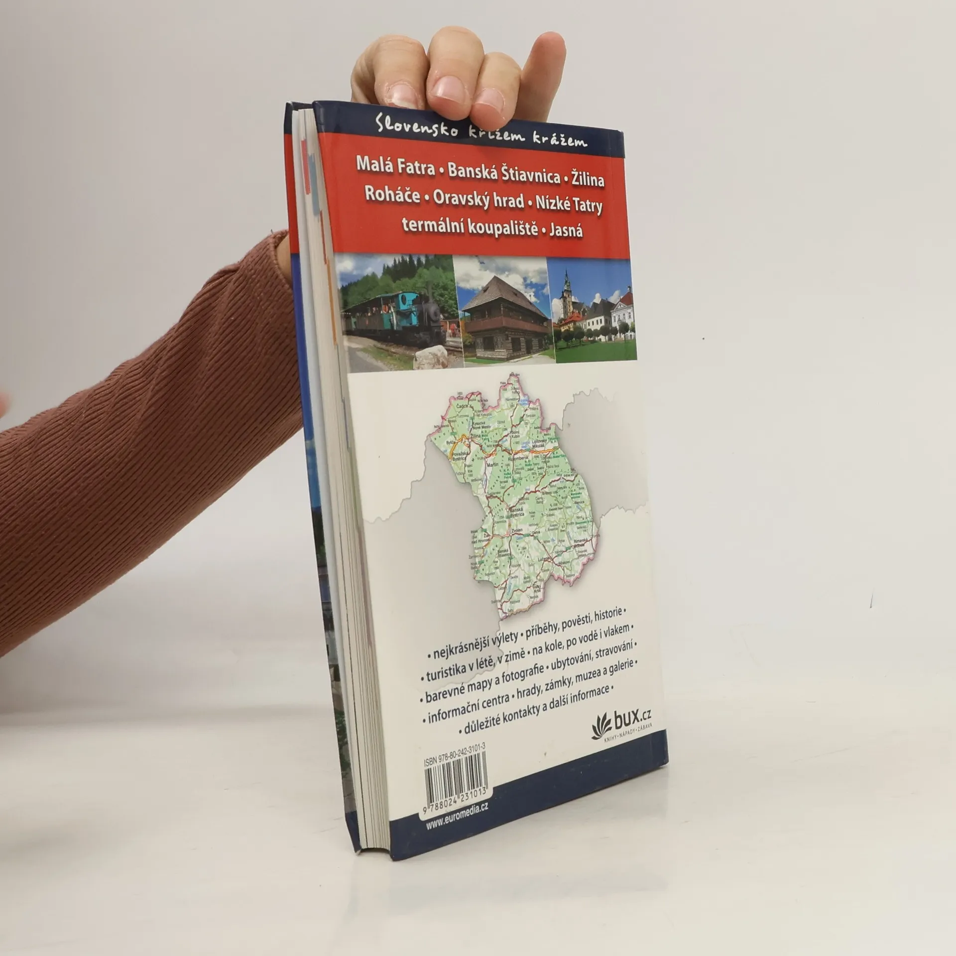 Druhý díl z třísvazkové edice průvodců Slovensko křížem krážem. Po stručném seznámení s oblastí uvádí doporučené okružní trasy pro automobilisty a 10 tematických okruhů (příroda, církevní památky, pro rodiny s dětmi aj.). Dále je střední Slovensko představeno po jednotlivých regionech, od lokalit nejznámějších až po ty dosud turisticky neobjevené. Deset nejkrásnějších výletů na závěr je inspirací pro vlastní objevování. Připojeny jsou aktuální informace o ubytování, parkování, stravování, u kulturních zařízení a památek otevírací doba.