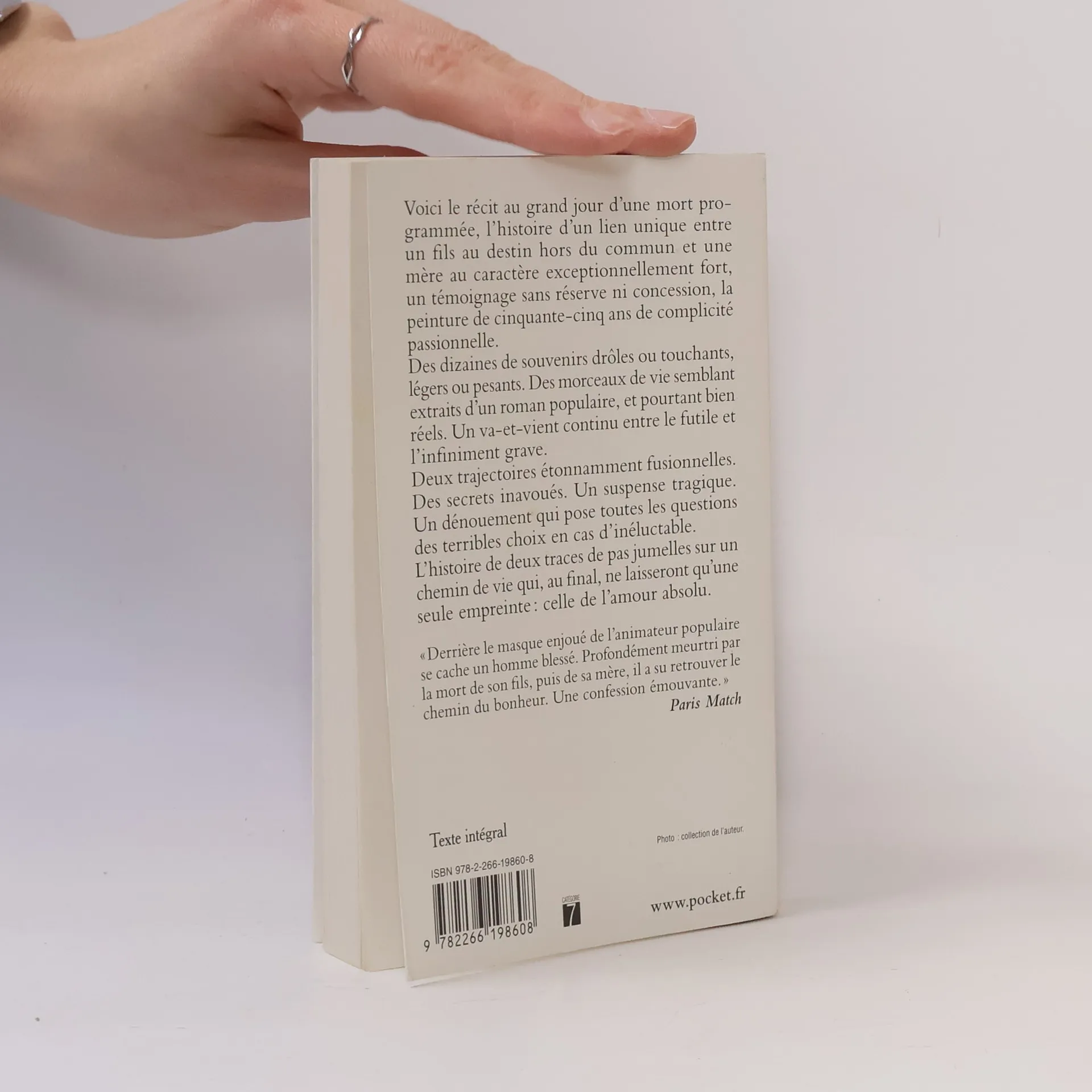 Voici le récit au grand jour d'une mort programmée, l'histoire d'un lien unique entre un fils au destin hors du commun et une mère au caractère exceptionnellement fort, un témoignage sans réserve ni concession, la peinture de cinquante-cinq ans de complicité passionnelle.Des dizaines de souvenirs drôles ou touchants, légers ou pesants. Des morceaux de vie semblant extraits d'un roman populaire, et pourtant bien réels. Un va-et-vient continu entre le futile et l'infiniment grave.Deux trajectoires étonnamment fusionnelles. Des secrets inavoués. Un suspense tragique. Un dénouement qui pose toutes les questions des terribles choix en cas d'inéluctable.L'histoire de deux traces de pas jumelles sur un chemin de vie qui, au final, ne laisseront qu'une seule empreinte : celle de l'amour absolu.