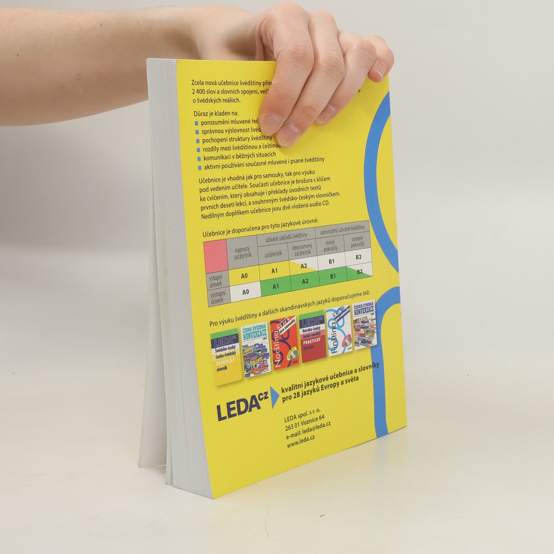 Zcela nová učebnice švédštiny je určena jak pro samostatné studium, tak pro výuku pod vedením učitele. S její pomocí si osvojíte základní slovní zásobu v rozsahu téměř 2 400 slov, frazeologii, gramatiku a výslovnost švédštiny. Naučíte se komunikovat v běžných situacích a dozvíte se také hodně o švédských reáliích. Samostatná úvodní kapitola je věnována výslovnosti švédštiny. Každá z následujících dvaceti tematicky zaměřených lekcí obsahuje dva úvodní dialogy či texty, slovní zásobu, mluvnickou část, cvičení a doplňkovou část. Součástí učebnice je brožura s klíčem ke cvičením, který uvádí i překlady úvodních textů prvních deseti lekcí, a souhrnným švédsko-českým slovníčkem..